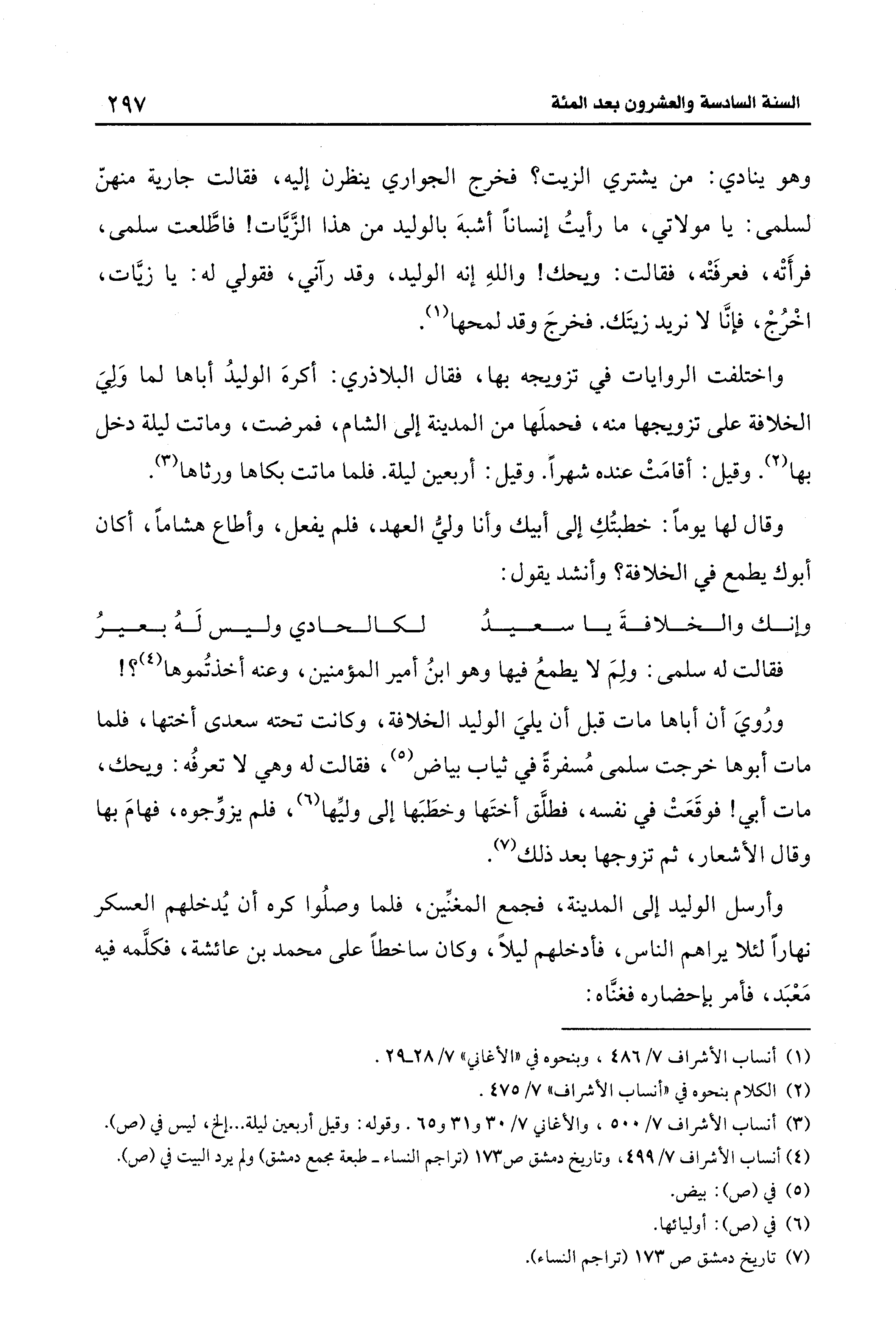 وهو ينادي: من يشتري الزيت؟ فخرج الجواري ينظرن إليه، فقالت جارية منهنّ لسلمى: يا مولاتي، ما رأيتُ إنسانًا أشبهَ بالوليد من هذا الزَّيَّات! فاطَّلعت سلمى، فرأَتْه، فعرفَتْه، فقالت: ويحك! واللهِ إنه الوليد، وقد رآني، فقولي له: يا زيَّات، اخْرُجْ، فإنَّا لا نريد زيتَك. فخرجَ وقد لمحها (¬1).