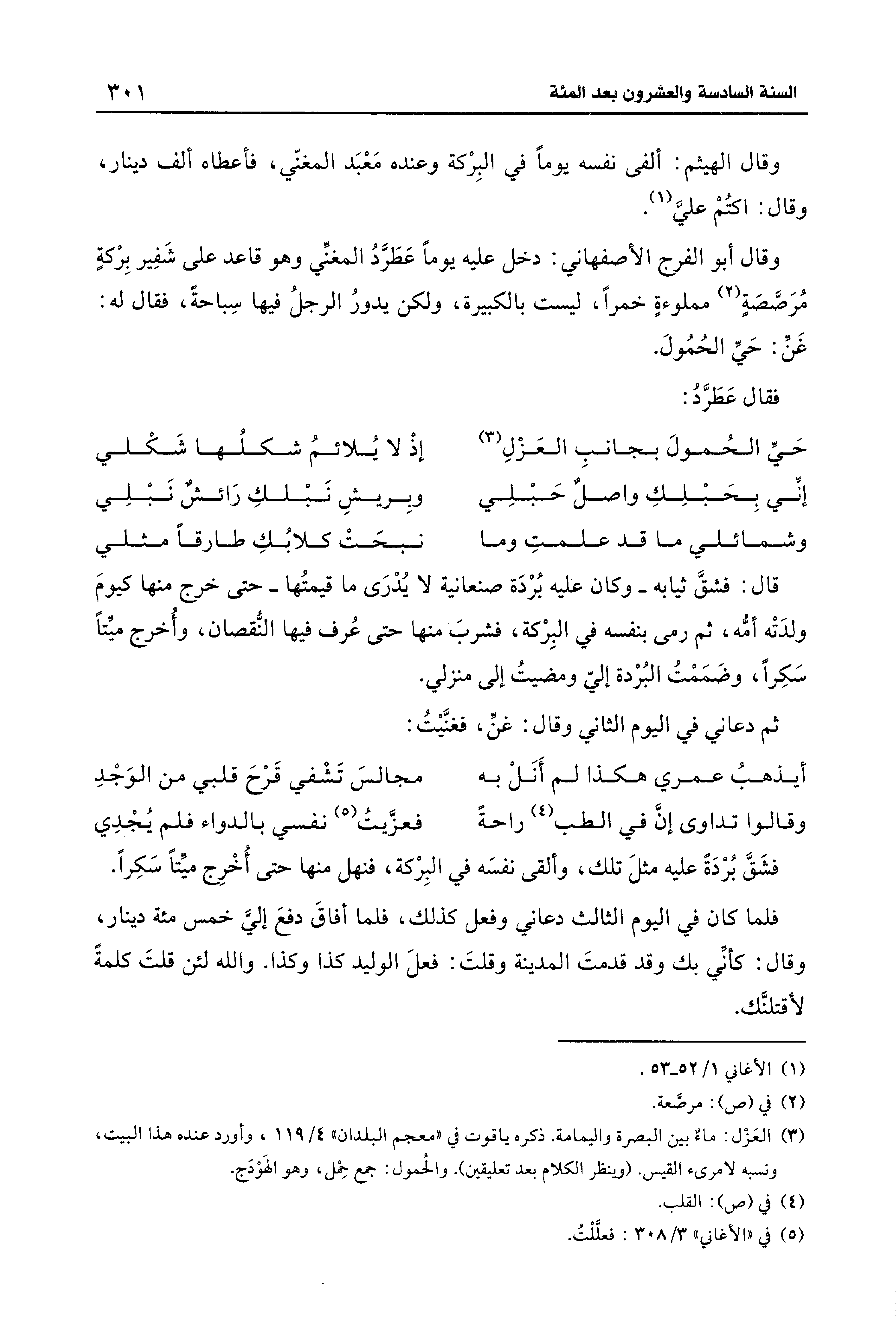 وقال أبو الفرج الأصفهاني: دخل عليه يومًا عَطَرَّدُ المغنِّي وهو قاعد على شَفِير بِرْكةٍ مُرَصَّصَةٍ (¬2) مملوءةٍ خمرًا، ليست بالكبيرة، ولكن يدورُ الرجلُ فيها سِباحةً، فقال له: غَنِّ: حَيِّ الحُمُولَ.
