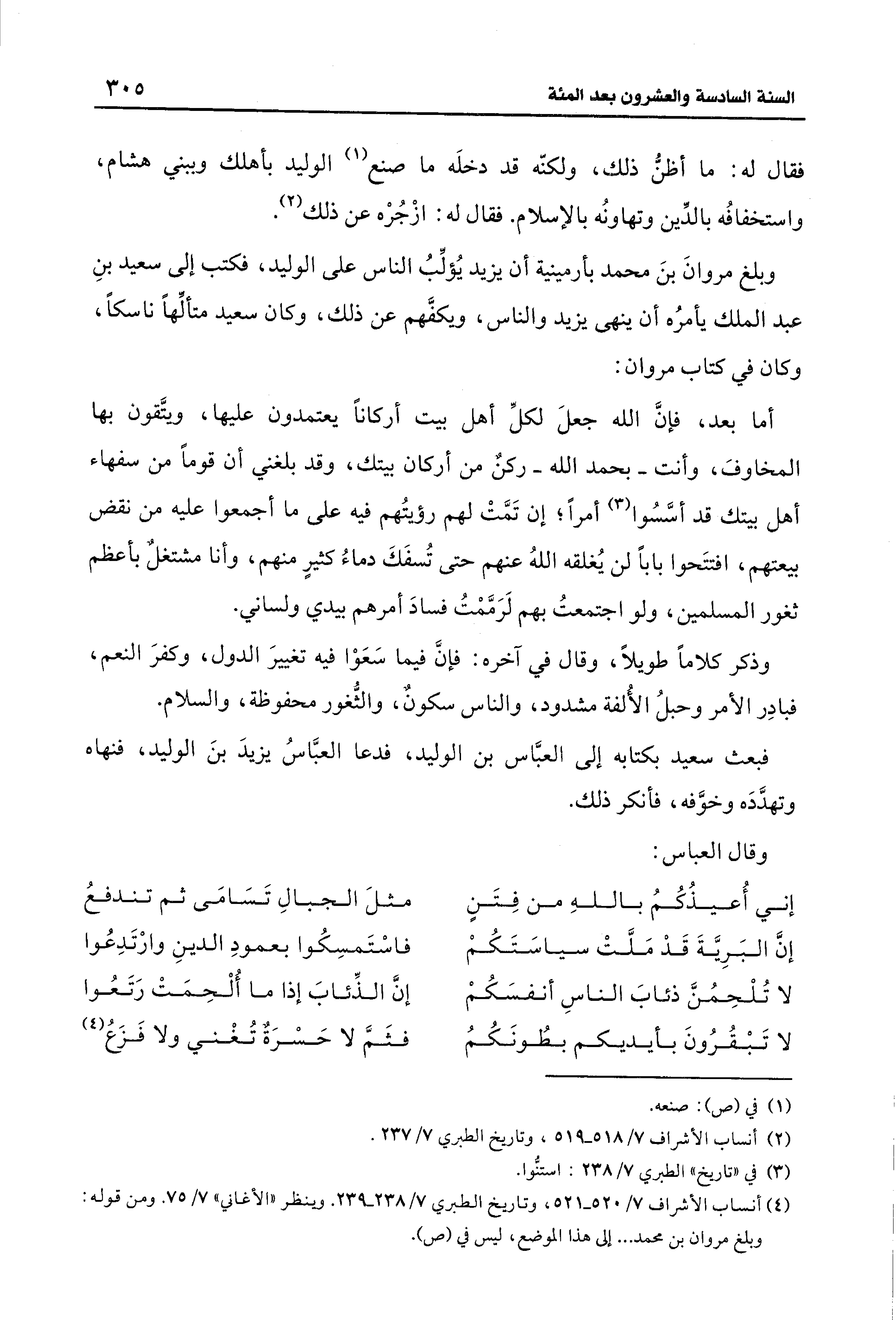 (¬4) أنساب الأشراف 7/ 520 - 521، وتاريخ الطبري 7/ 238 - 239. وينظر "الأغاني" 7/ 75. ومن قوله: وبلغ مروان بن محمد ... إلى هذا الموضع، ليس في (ص).