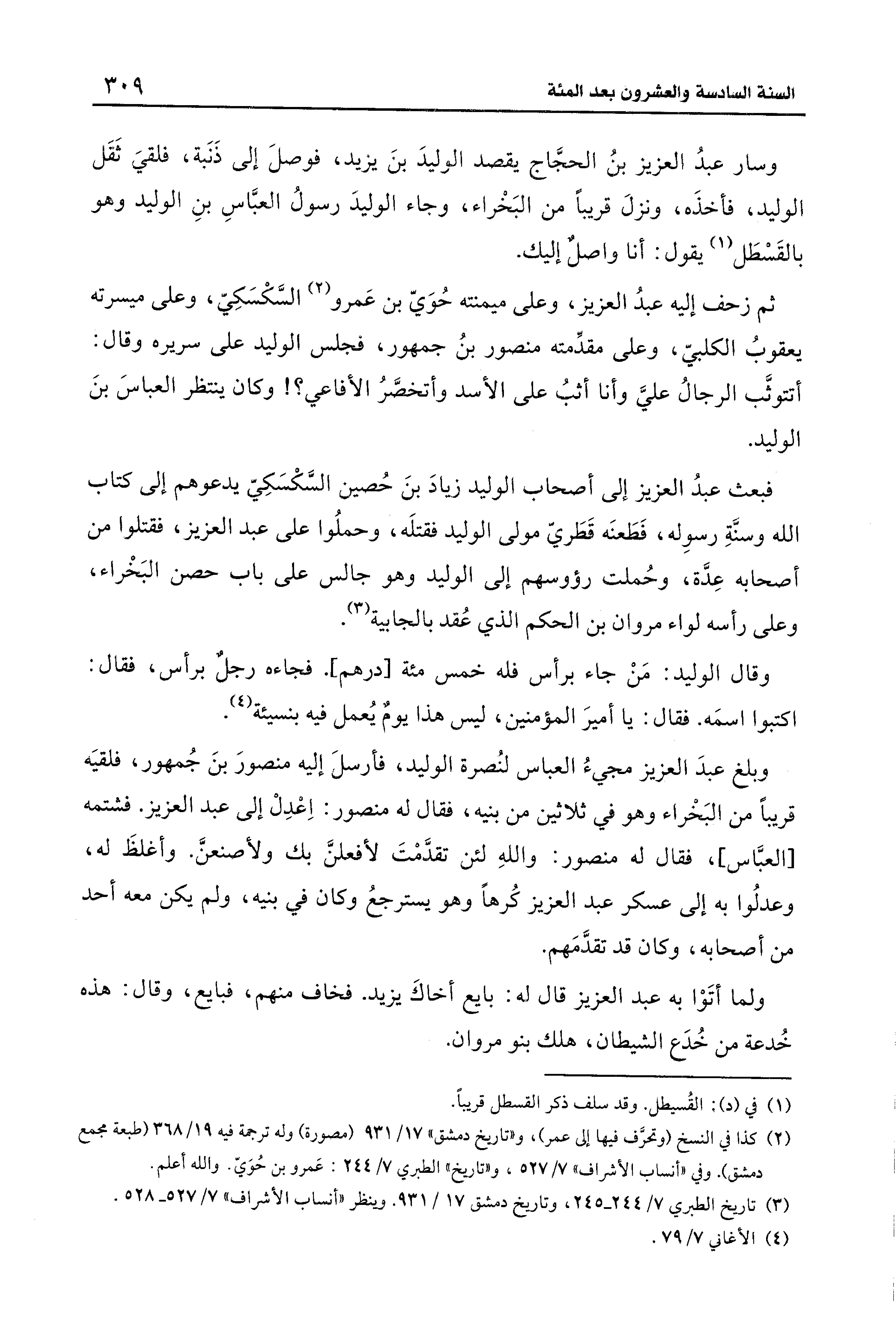 وبلغ عبدَ العزيز مجيءُ العباس لنُصرة الوليد، فأرسلَ إليه منصورَ بنَ جُمهور، فلقيَه قريبًا من البَخْراء وهو في ثلاثين من بنيه، فقال له منصور: اعْدِلْ إلى عبد العزيز. فشتمه [العبَّاس]، فقال له منصور: واللهِ لئن تقدَّمْتَ لأفعلنَّ بك ولأصنعنَّ. وأغلظَ له، وعدلُوا به إلى عسكر عبد العزيز كُرهًا وهو يسترجعُ وكان في بنيه، ولم يكن معه أحد من أصحابه، وكان قد تقدَّمَهم.