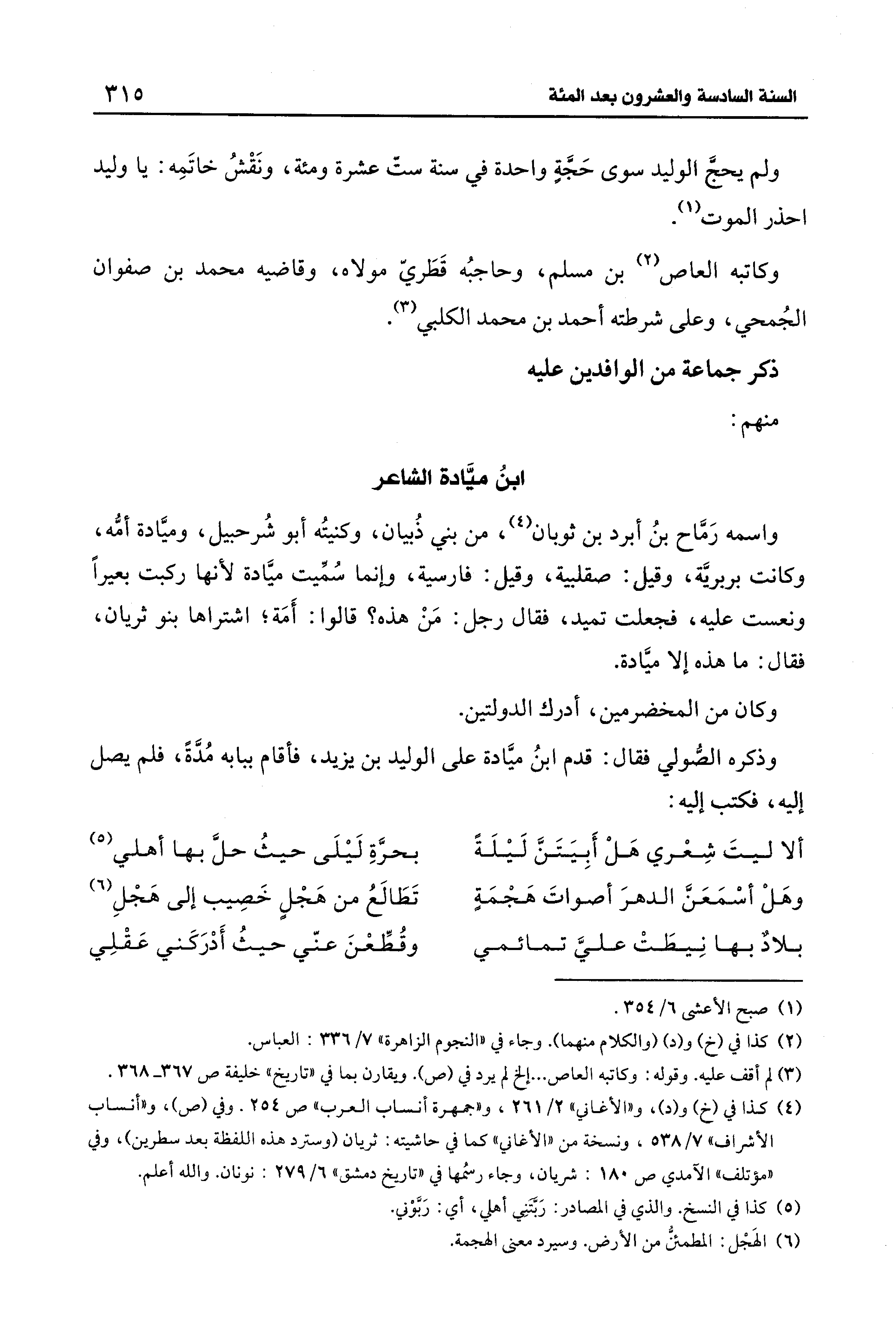 وذكره الصُّولي فقال: قدم ابنُ ميَّادة على الوليد بن يزيد، فأقام ببابه مُدَّةً، فلم يصل إليه، فكتب إليه: