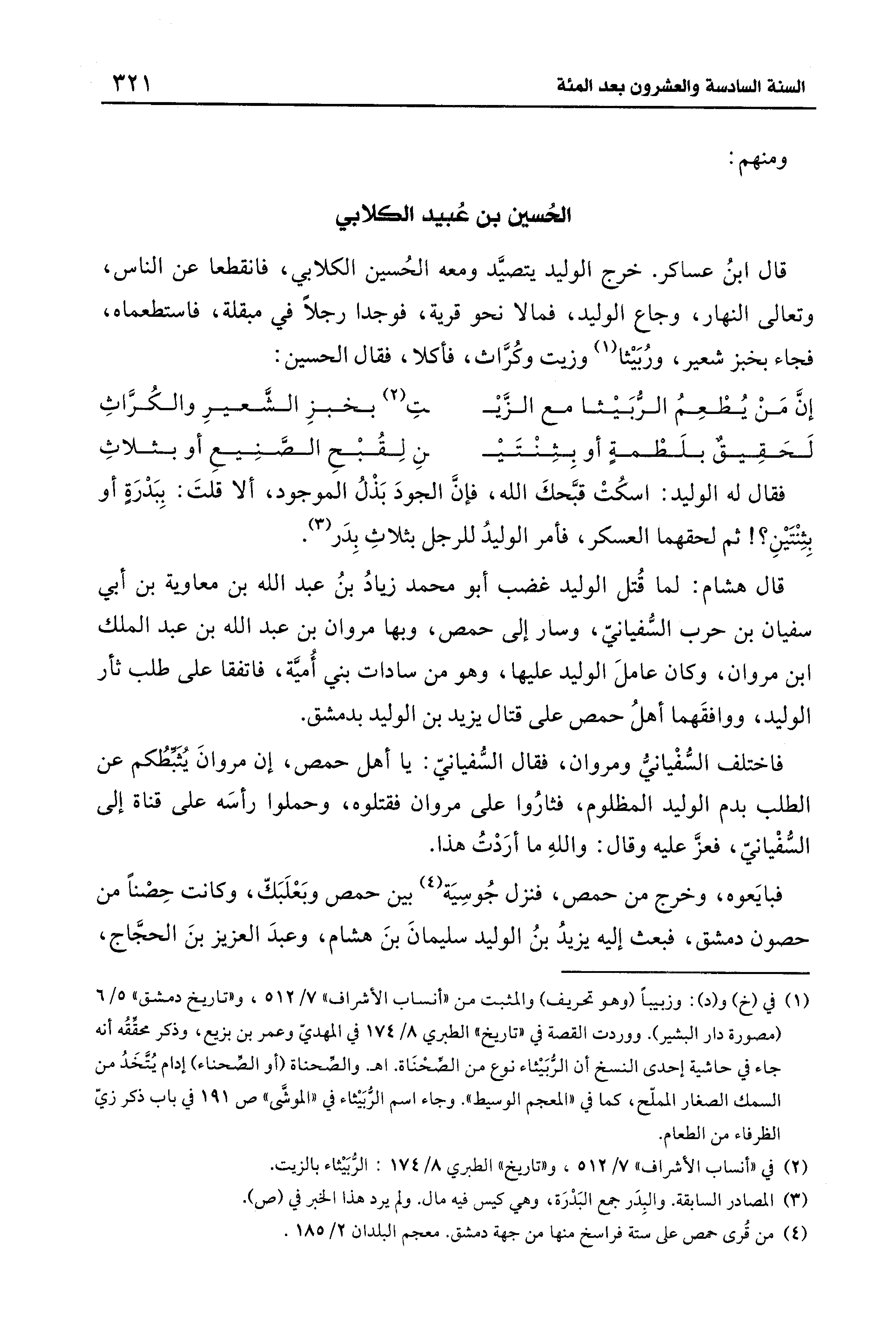 قال ابنُ عساكر: خرج الوليد يتصيَّد ومعه الحُسين الكلابي، فانقطعا عن الناس، وتعالى النهار، وجاع الوليد، فمالا نحو قوية، فوجدا رجلًا في مبقلة، فاستطعماه، فجاء بخبز شعير، ورُبَيْثا (¬1) وزيت وكُرَّاث، فأكلا، فقال الحسين: