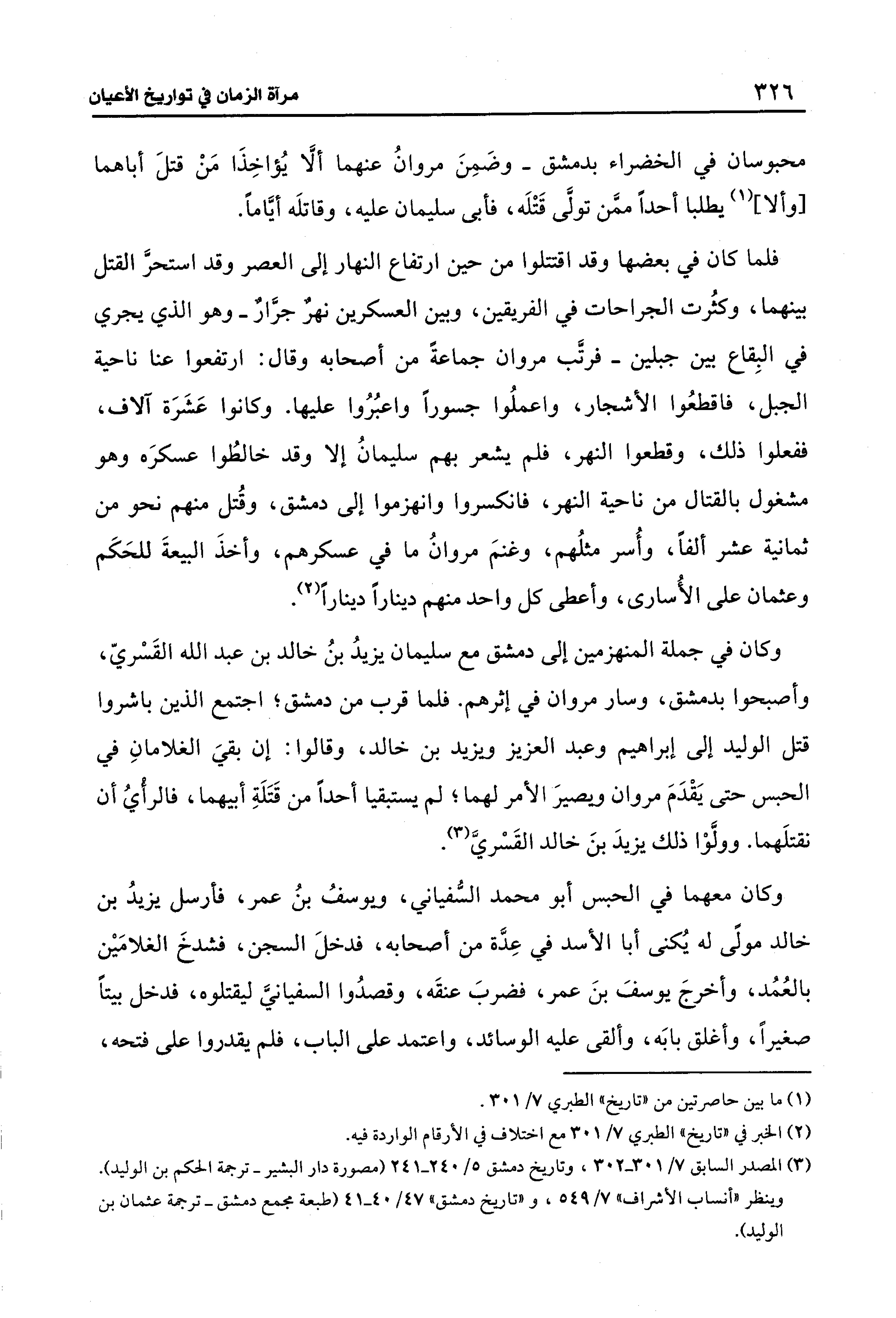 محبوسان في الخضراء بدمشق- وضَمِنَ مروانُ عنهما ألا يُؤاخِذَا مَنْ قتلَ أباهما [وألا] (¬1) يطلبا أحدًا ممَّن تولَّى قَتْلَه، فأبى سليمان عليه، وقاتلَه أيَّامًا.