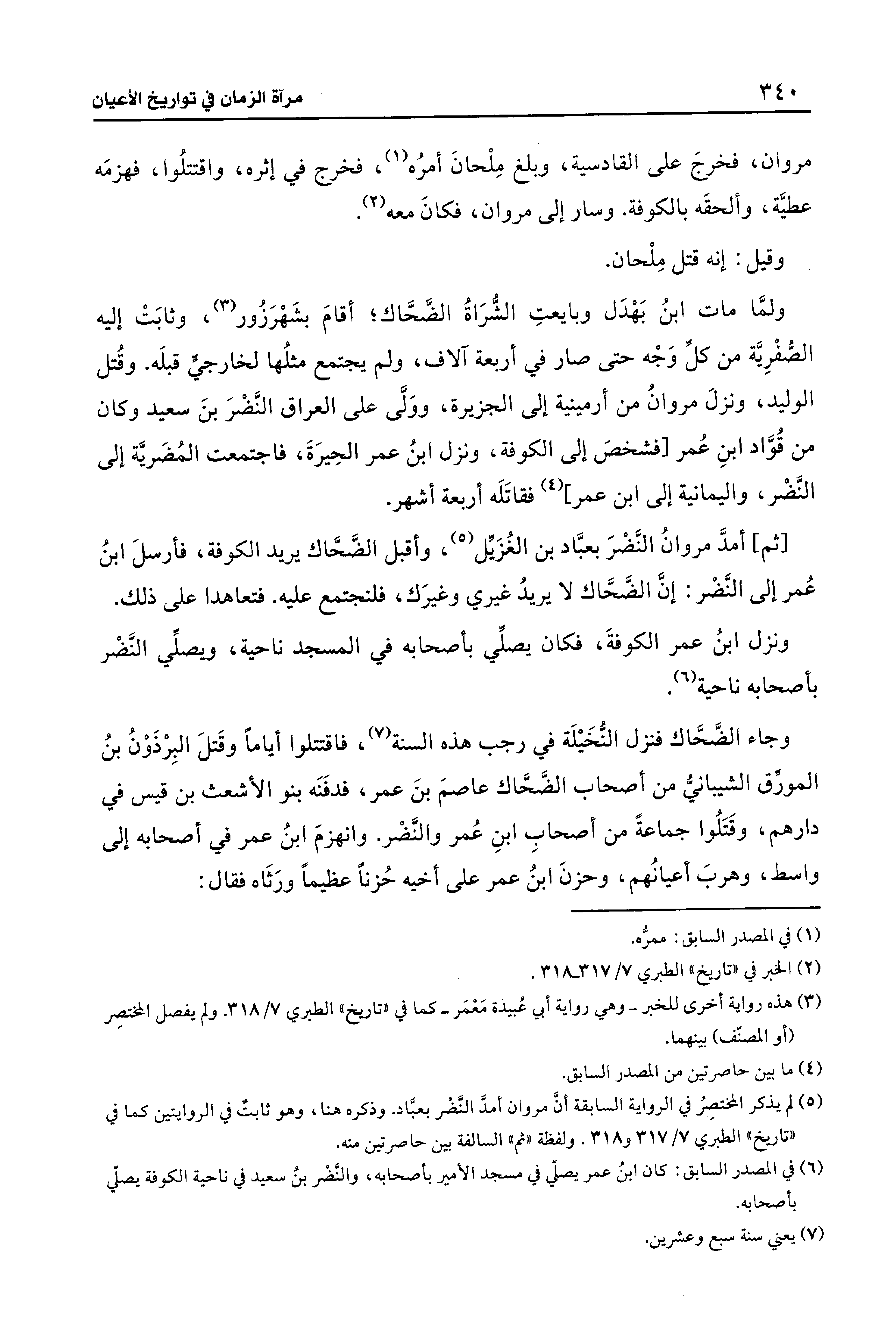 (¬5) لم يذكر المختصِرُ في الرواية السابقة أنَّ مروان أمدَّ النَّضْر بعبَّاد. وذكره هنا، وهو ثابتٌ في الروايتين كما في "تاريخ" الطبري 7/ 317 و 318. ولفظة "ثم" السالفة بين حاصرتين منه.