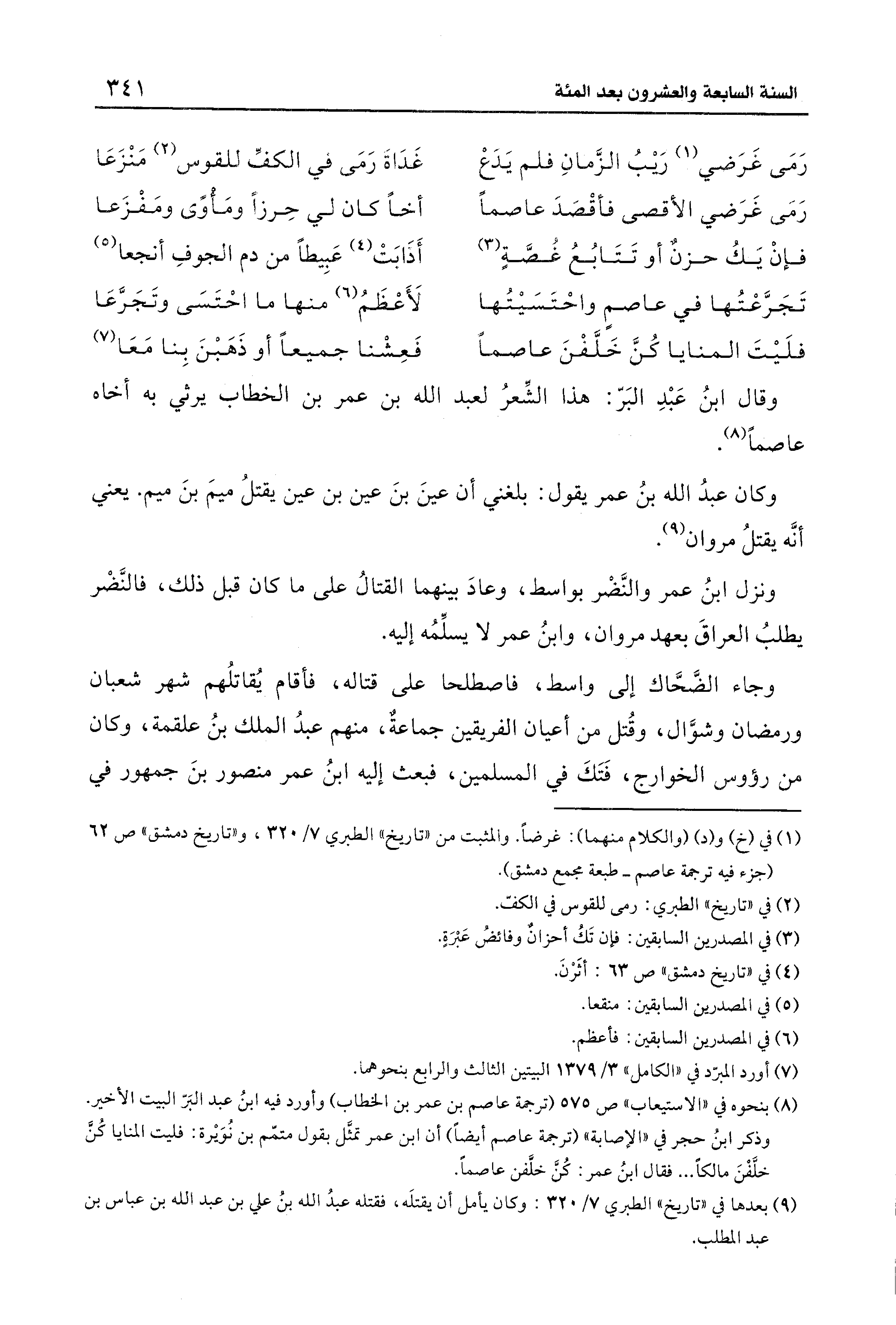 (¬8) بنحوه في "الاستيعاب" ص 575 (ترجمة عاصم بن عمر بن الخطاب) وأورد فيه ابنُ عبد البَرّ البيت الأخير. وذكر ابنُ حجر في "الإصابة" (ترجمة عاصم أيضًا) أن ابن عمر تمثَّل بقول متمّم بن نُوَيرة: فليت المنايا كُنَّ خلَّفْنَ مالكًا ... فقال ابنُ عمر: كُنَّ خلَّفن عاصمًا.