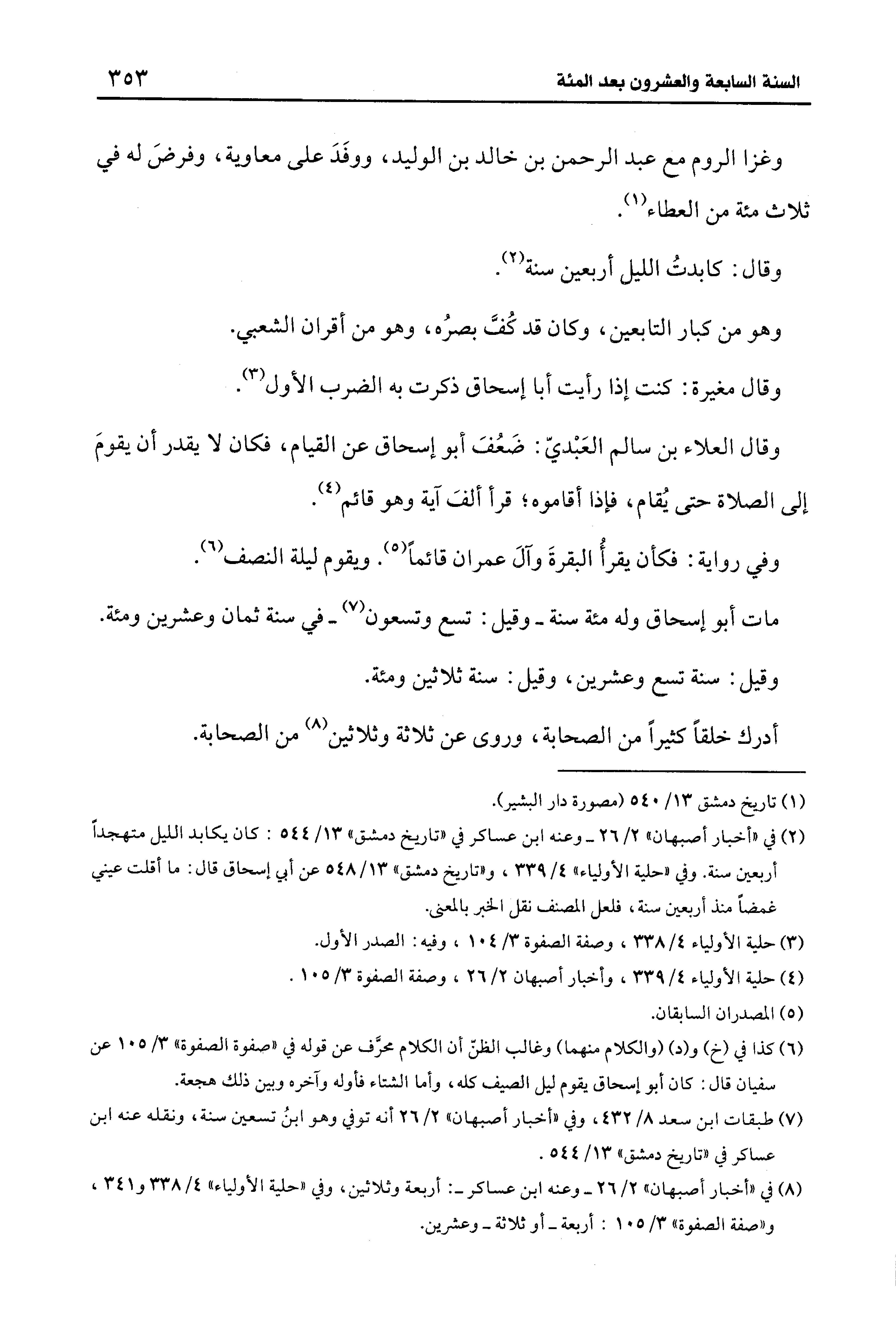 (¬2) في "أخبار أصبهان" 2/ 26 - وعنه ابن عساكر في "تاريخ دمشق" 13/ 544: كان يكابد الليل متهجدًا أربعين سنة. وفي "حلية الأولياء" 4/ 339، و"تاريخ دمشق" 13/ 548 عن أبي إسحاق قال: ما أقلت عيني غمضًا منذ أربعين ستة، فلعل المصنف نقل الخبر بالمعنى.