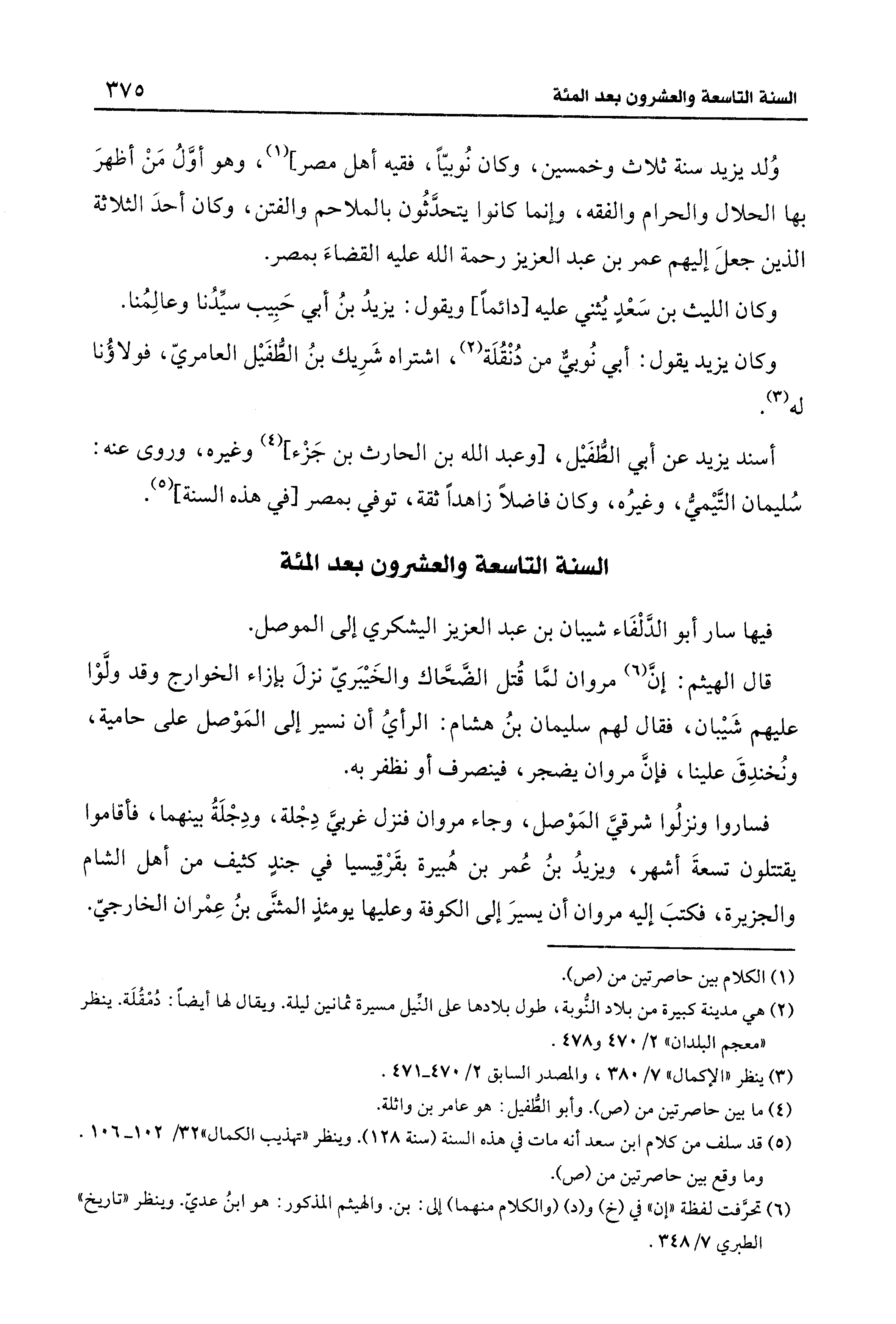 فساروا ونزلُوا شرقيَّ المَوْصل، وجاء مروان فنزل غربيَّ دِجْلة، ودِجْلَةُ بينهما، فأقاموا يقتتلون تسعةَ أشهر، ويزيدُ بنُ عُمر بن هُبيرة بقَرْقِيسيا في جندٍ كثيف من أهل الشام والجزيرة، فكتبَ إليه مروان أن يسيرَ إلى الكوفة وعليها يومئذٍ المثنَّى بنُ عِمْران الخارجيّ.