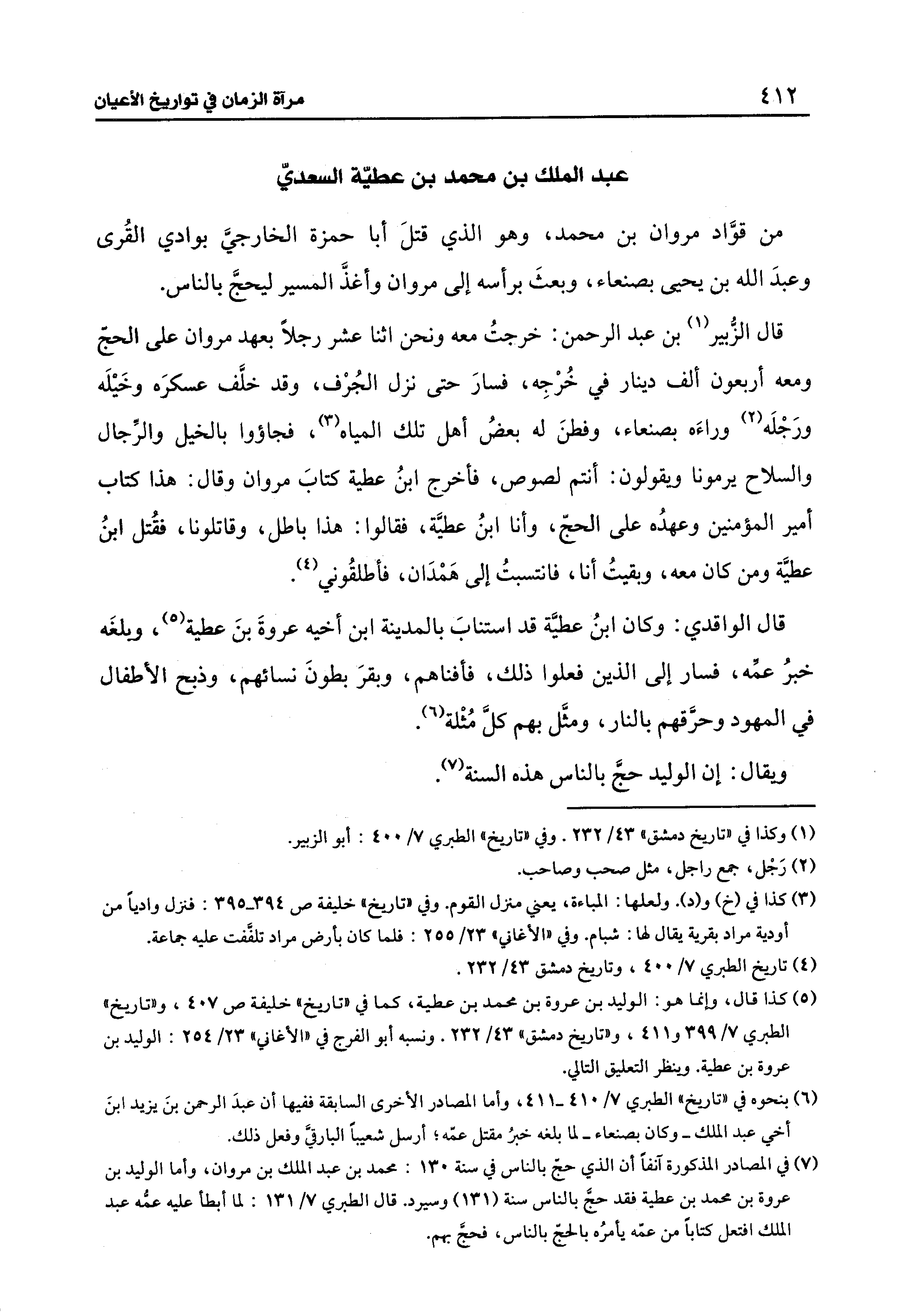 قال الزُّبير (¬1) بن عبد الرحمن: خرجتُ معه ونحن اثنا عشر رجلًا بعهد مروان على الحجِّ ومعه أربعون ألف دينار في خُرْجِه، فسارَ حتَّى نزل الجُرْف، وقد خلَّف عسكرَه وخَيلَه ورَجْلَه (¬2) وراءَه بصنعاء، وفطنَ له بعضُ أهل تلك المياه (¬3)، فجاؤوا بالخيل والرجال والسلاح يرمونا ويقولون: أنتم لصوص، فأخرج ابنُ عطية كتابَ مروان وقال: هذا كتاب أمير المؤمنين وعهدُه على الحجِّ، وأنا ابنُ عطيَّة، فقالوا: هذا باطل، وقاتلونا، فقُتل ابنُ عطيَّة ومن كان معه، وبقيتُ أنا، فانتسبتُ إلى هَمْدَان، فأطلقُوني (¬4).