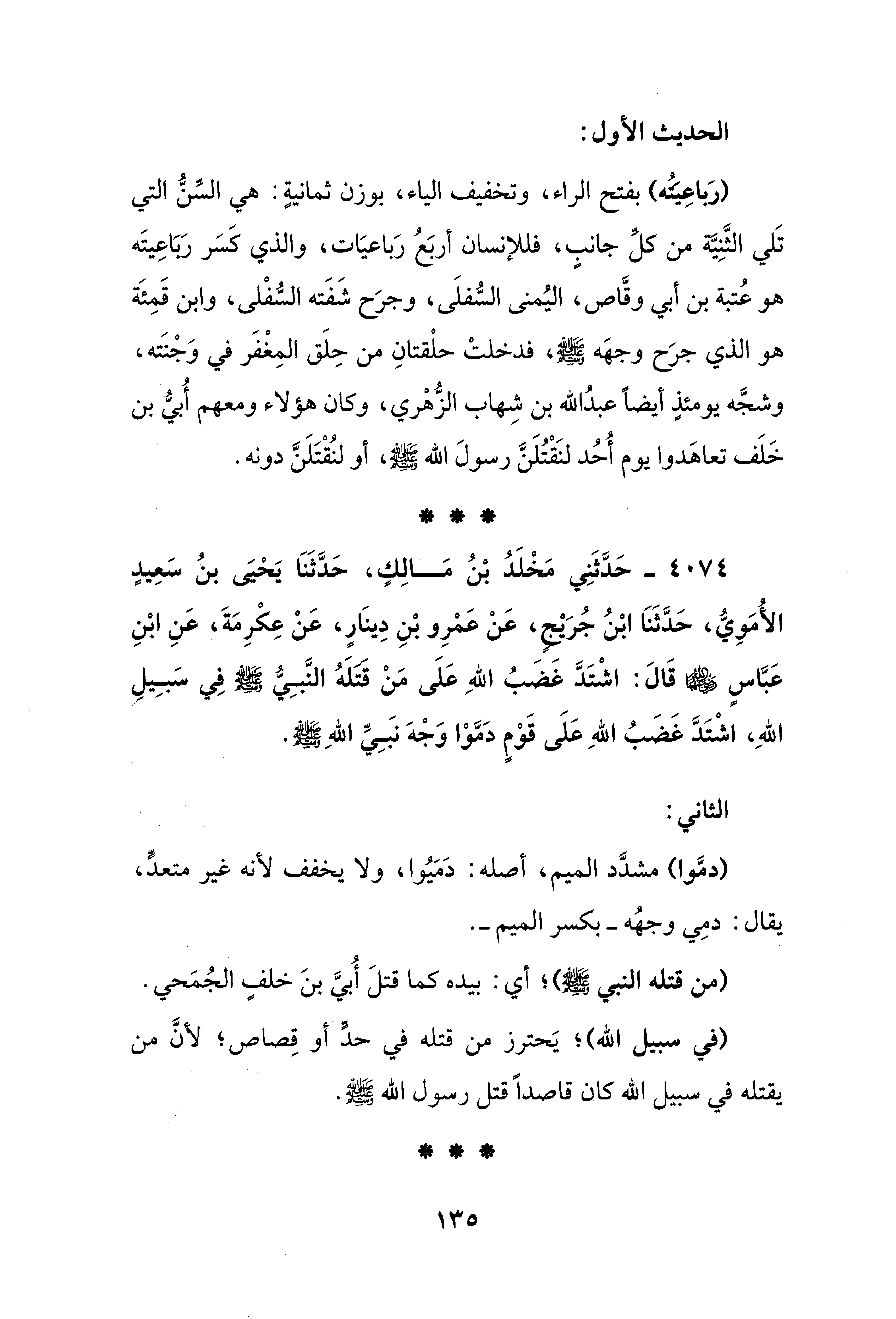4074 - حَدَّثَنِي مَخْلَدُ بْنُ مَالِكٍ، حَدَّثَنَا يَحْيَىَ بنُ سَعِيدٍ الأُمَوِيُّ، حَدَّثَنَا ابْنُ جُرَيْجٍ، عَنْ عَمْرِو بْنِ دِينَارٍ، عَنْ عِكْرِمَةَ، عَنِ ابْنِ عَبَّاسٍ - رضي الله عنهما - قَالَ: اشْتَدَّ غَضَبُ اللهِ عَلَى مَنْ قَتَلَهُ النَّبِيُّ - صلى الله عليه وسلم - فِي سَبِيلِ اللهِ، اشْتَدَّ غَضَبُ اللهِ عَلَى قَوْمٍ دَمَّوْا وَجْهَ نبَيِّ اللهِ - صلى الله عليه وسلم -.