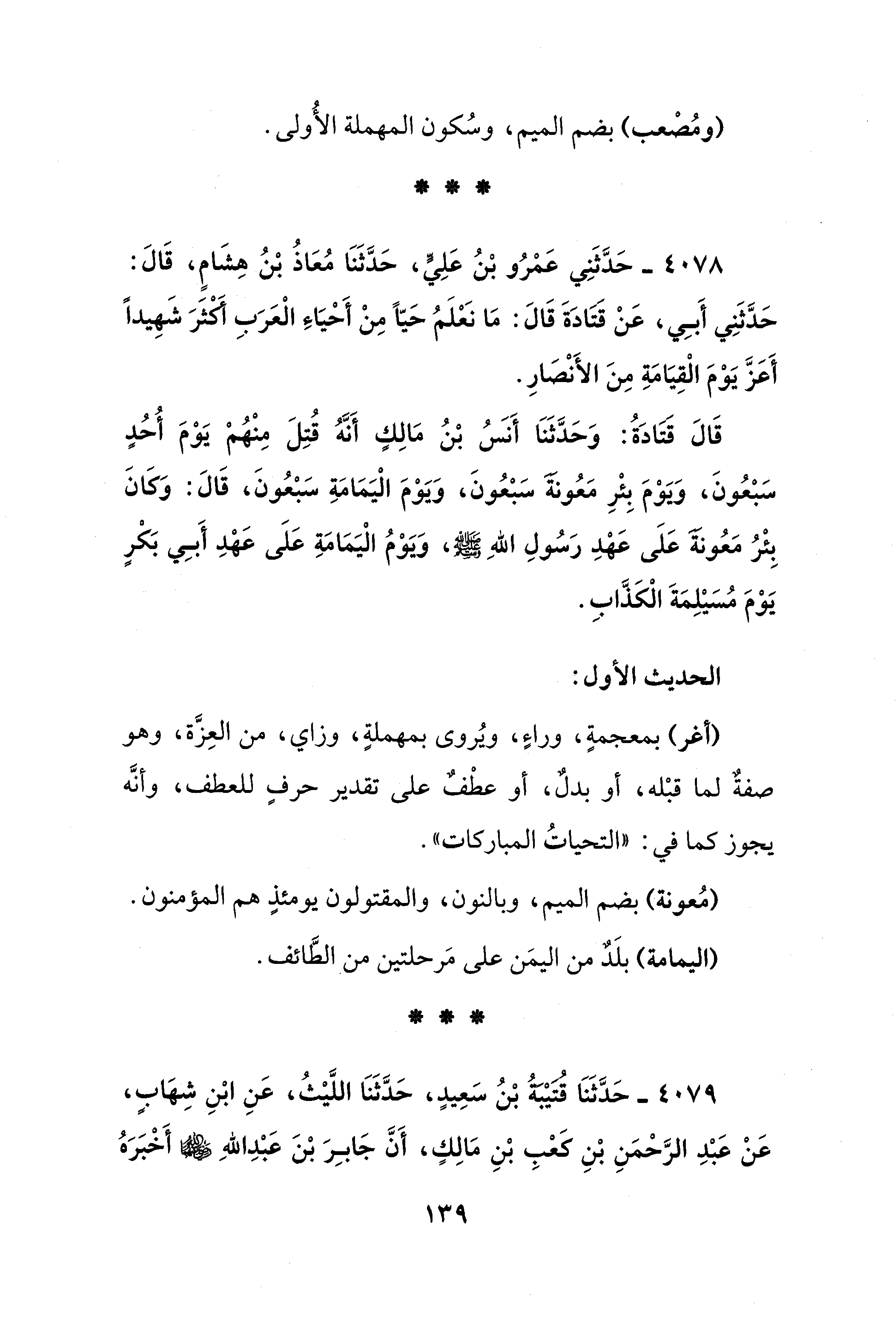 قَالَ قَتَادَةُ: وَحَدَّثَنَا أَنسُ بْنُ مَالِكٍ أَنَّهُ قُتِلَ مِنْهُمْ يَوْمَ أُحُدٍ سَبْعُونَ، وَيَوْمَ بِئْرِ مَعُونَةَ سَبْعُونَ، وَيَوْمَ الْيَمَامَةِ سَبْعُونَ، قَالَ: وَكَانَ بِئْرُ مَعُونَةَ عَلَى عَهْدِ رَسُولِ اللهِ - صلى الله عليه وسلم -، وَيَوْمُ الْيَمَامَةِ عَلَى عَهْدِ أَبِي بَكْرٍ يَوْمَ مُسَيْلِمَةَ الْكَذَّابِ.