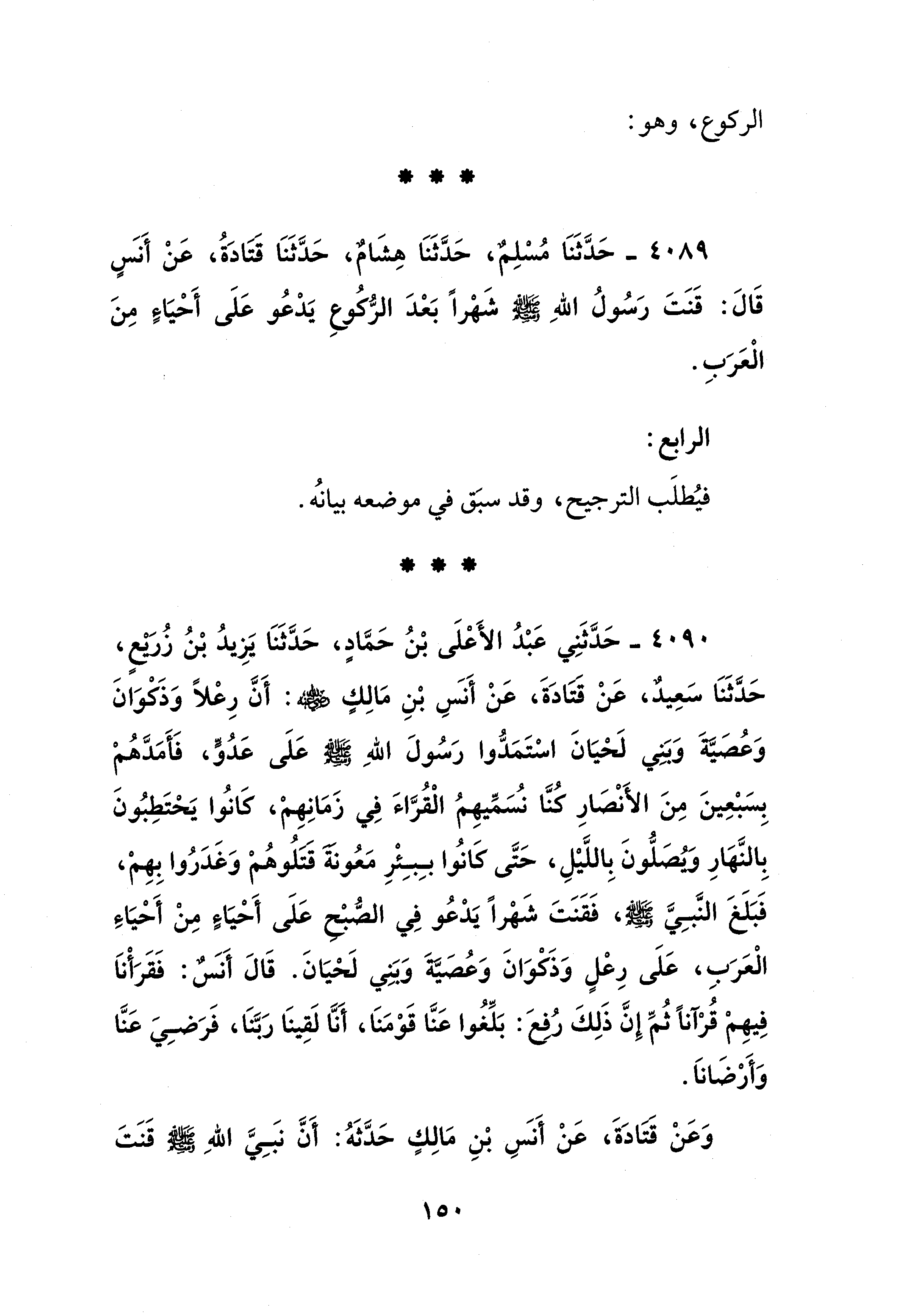 4089 - حَدَّثَنَا مُسْلِمٌ، حَدَّثَنَا هِشَامٌ، حَدَّثَنَا قتادَةُ، عَنْ أَنَسٍ قَالَ: قَنَتَ رَسُولُ اللهِ - صلى الله عليه وسلم - شَهْرًا بَعْدَ الرُّكُوعِ يَدْعُو عَلَى أَحْيَاءٍ مِنَ الْعَرَبِ.