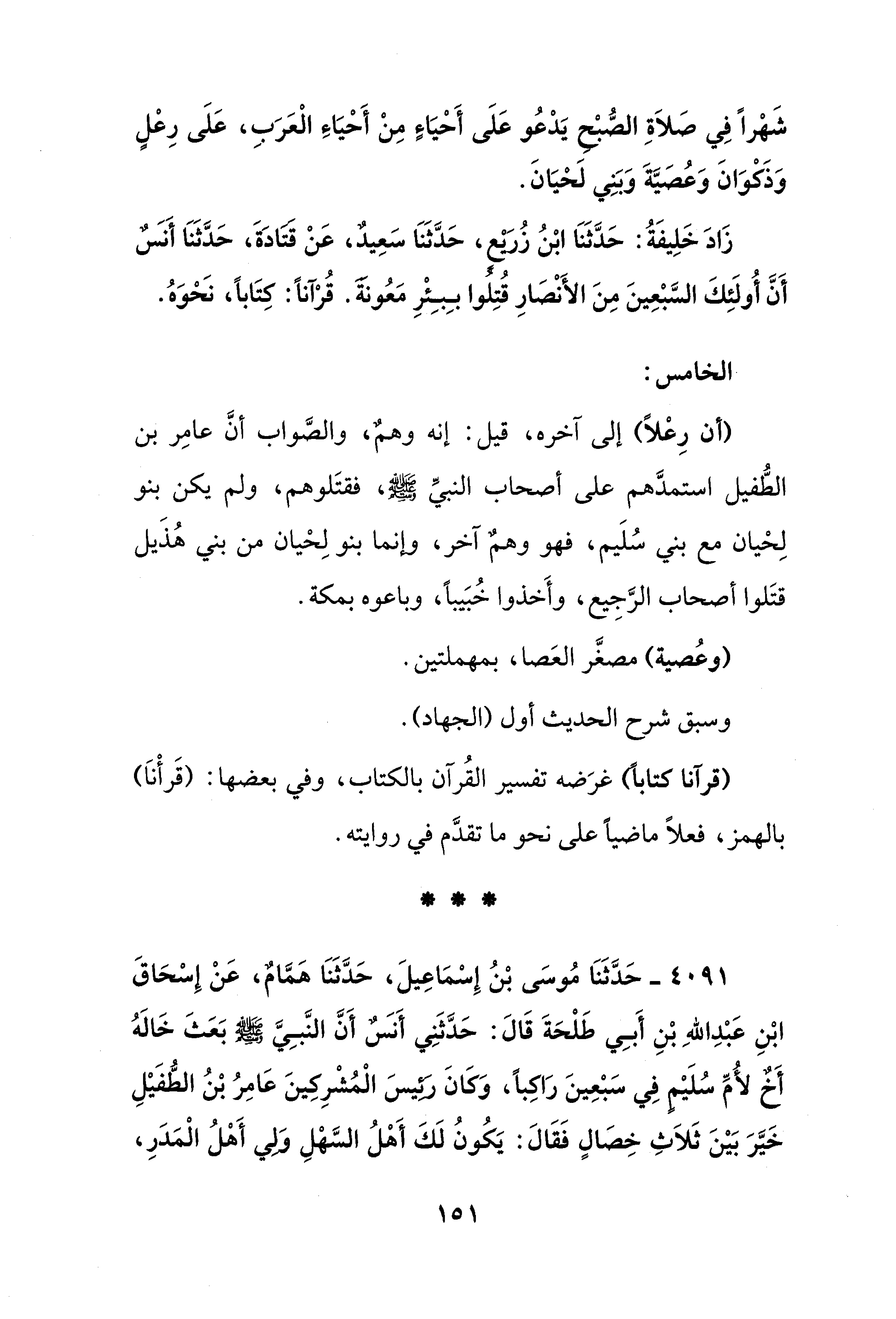 زَادَ خَلِيفَةُ: حَدَّثَنَا ابْنُ زُريْعٍ، حَدَّثَنَا سَعِيدٌ، عَنْ قَتَادَةَ، حَدَّثَنَا أَنَسٌ أَنَّ أُولَئِكَ السَّبْعِينَ مِنَ الأَنْصَارِ قُتِلُوا بِبِئْرِ مَعُونَةَ. قُرْآنًا: كِتَابًا، نَحْوَهُ.