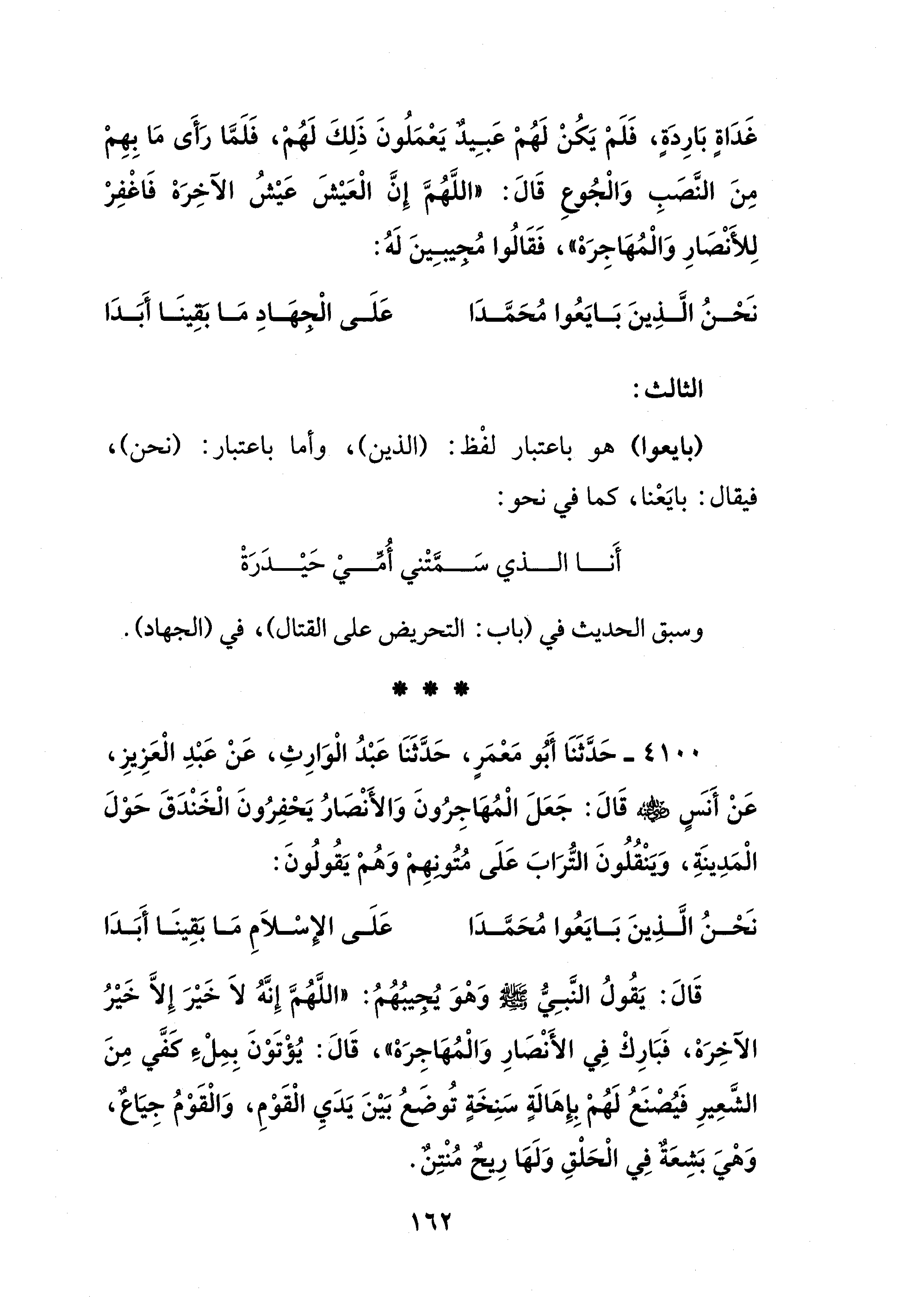 قَالَ: يَقُولُ النَّبِيُّ - صلى الله عليه وسلم - وَهْوَ يُجِيبُهُمُ: "اللَّهُمَّ إِنَّهُ لاَ خَيْرَ إِلَّا خَيْرُ الآخِرَهْ، فَبَارِكْ فِي الأَنْصَارِ وَالْمُهَاجِرَهْ"، قَالَ: يُؤْتَوْنَ بِمِلْءِ كَفَّي مِنَ الشَّعِيرِ فَيُصْنَعُ لَهُمْ بِإِهَالَةٍ سَنِخَةٍ تُوضَعُ بَيْنَ يَدَيِ الْقَوْمِ، وَالْقَوْمُ جِيَاعٌ، وَهْيَ بَشِعَةٌ فِي الْحَلْقِ وَلَهَا رِيحٌ مُنْتِنٌ.