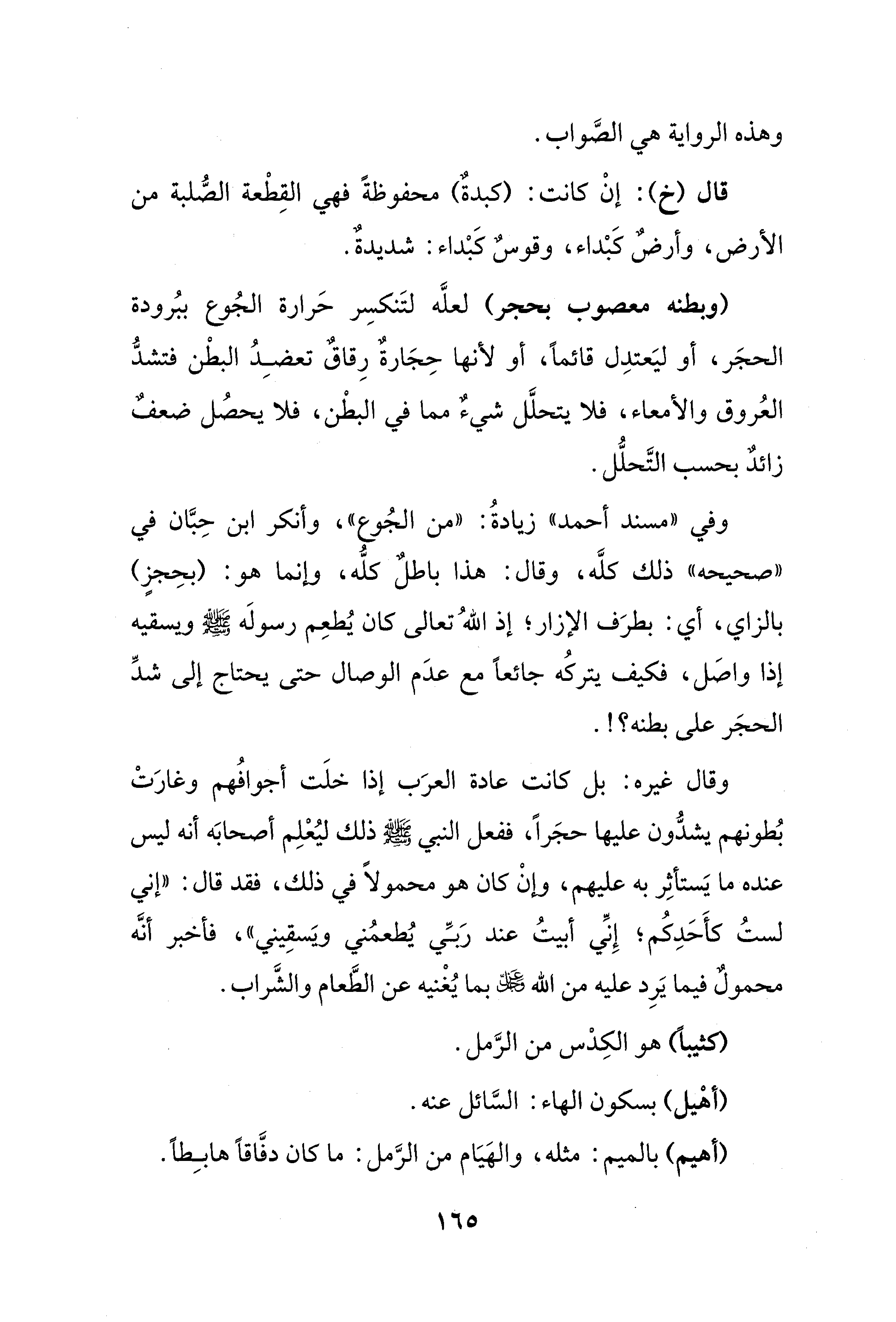 وقال غيره: بل كانت عادة العرَب إذا خلَت أجوافُهم وغارَتْ بُطونهم يشدُّون عليها حجَرًا، ففعل النبي صلى الله عليه وسلم ذلك ليُعْلِم أصحابَه أنه ليس عنده ما يَستأثِر به عليهم، وإنْ كان هو محمولًا في ذلك، فقد قال: "إني لستُ كأَحَدِكُم؛ إِنِّي أبيتُ عند رَبِّي يُطعمُني ويَسقِيني"، فأخبر أنَّه محمولٌ فيما يَرِد عليه من الله عز وجل بما يُغْنيه عن الطَّعام والشَّراب.