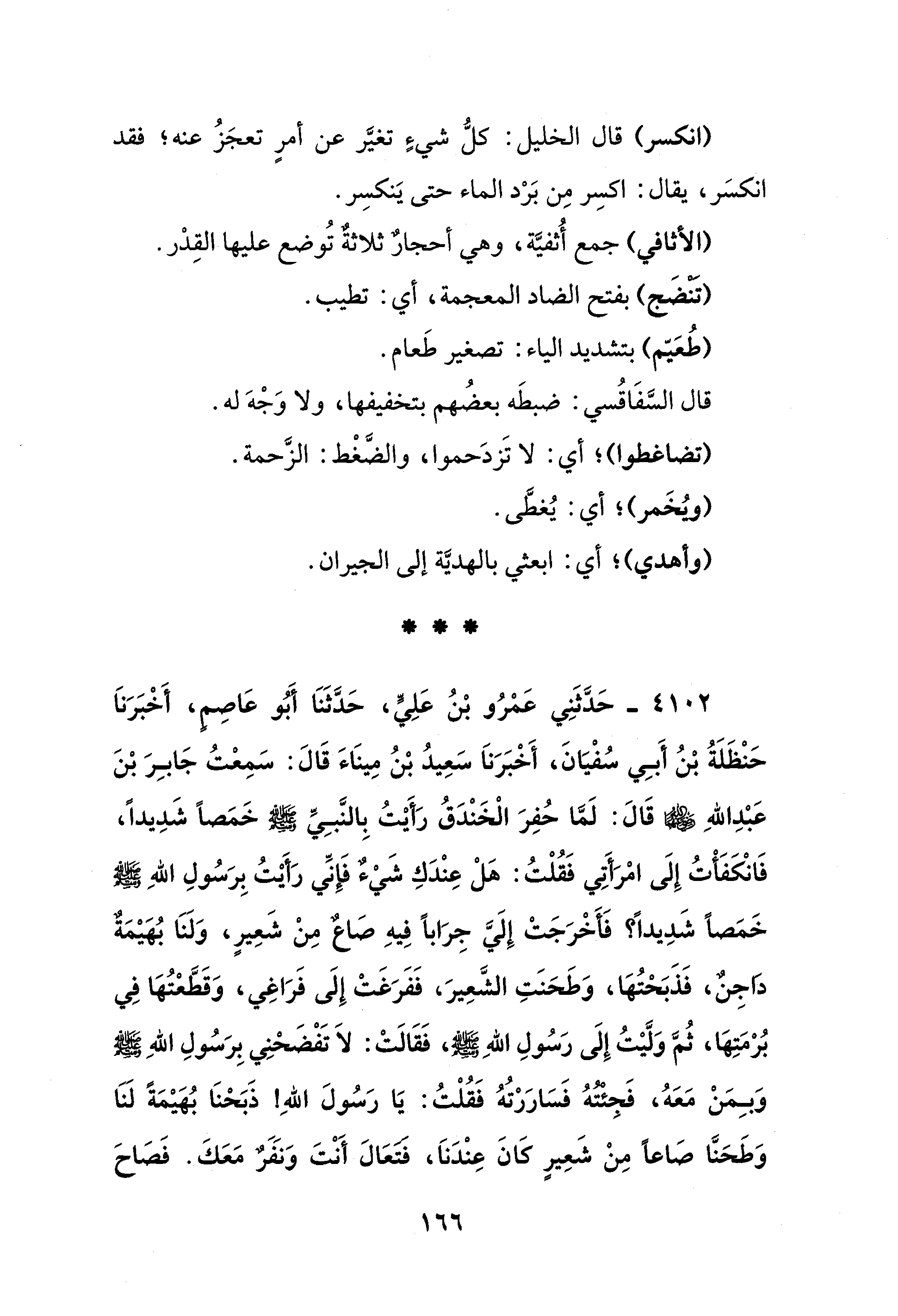 4102 - حَدَّثَنِي عَمْرُو بْنُ عَلِيٍّ، حَدَّثَنَا أَبُو عَاصِمٍ، أَخْبَرَنَا حَنْظَلَةُ بْنُ أَبِي سُفْيَانَ، أَخْبَرَنَا سَعِيدُ بْنُ مِينَاءَ قَالَ: سَمِعْتُ جَابِرَ بْنَ عَبْدِ اللهِ - رضي الله عنهما - قَالَ: لَمَّا حُفِرَ الْخَنْدَقُ رَأَيْتُ بِالنَّبِيِّ - صلى الله عليه وسلم - خَمَصًا شَدِيدًا، فَانْكَفَأْتُ إِلَى امْرَأَتِي فَقُلْتُ: هَلْ عِنْدَكِ شَيْءٌ فَإِنِّي رَأَيْتُ بِرَسُولِ اللهِ - صلى الله عليه وسلم - خَمَصًا شَدِيدًا؟ فَأَخْرَجَتْ إِلَيَّ جِرَابًا فِيهِ صَاعٌ مِنْ شَعِيرٍ، وَلَنَا بُهَيْمَةٌ دَاجِنٌ، فَذَبَحْتُهَا، وَطَحَنَتِ الشَّعِيرَ، فَفَرَغَتْ إِلَى فَرَاغِي، وَقَطَّعْتُهَا فِي بُرْمَتِهَا، ثُمَّ وَلَّيْتُ إِلَى رَسُولِ اللهِ - صلى الله عليه وسلم -، فَقَالَتْ: لاَ تَفْضَحْنِي بِرَسُولِ اللهِ - صلى الله عليه وسلم - وَبِمَنْ مَعَهُ، فَجِئْتُهُ فَسَارَرْتُهُ فَقُلْتُ: يَا رَسُولَ اللهِ! ذَبَحْنَا بُهَيْمَةً لَنَا وَطَحَنَّا صَاعًا مِنْ شَعِيرٍ كَانَ عِنْدَناَ، فَتَعَالَ أَنْتَ وَنَفَرٌ مَعَكَ. فَصَاحَ