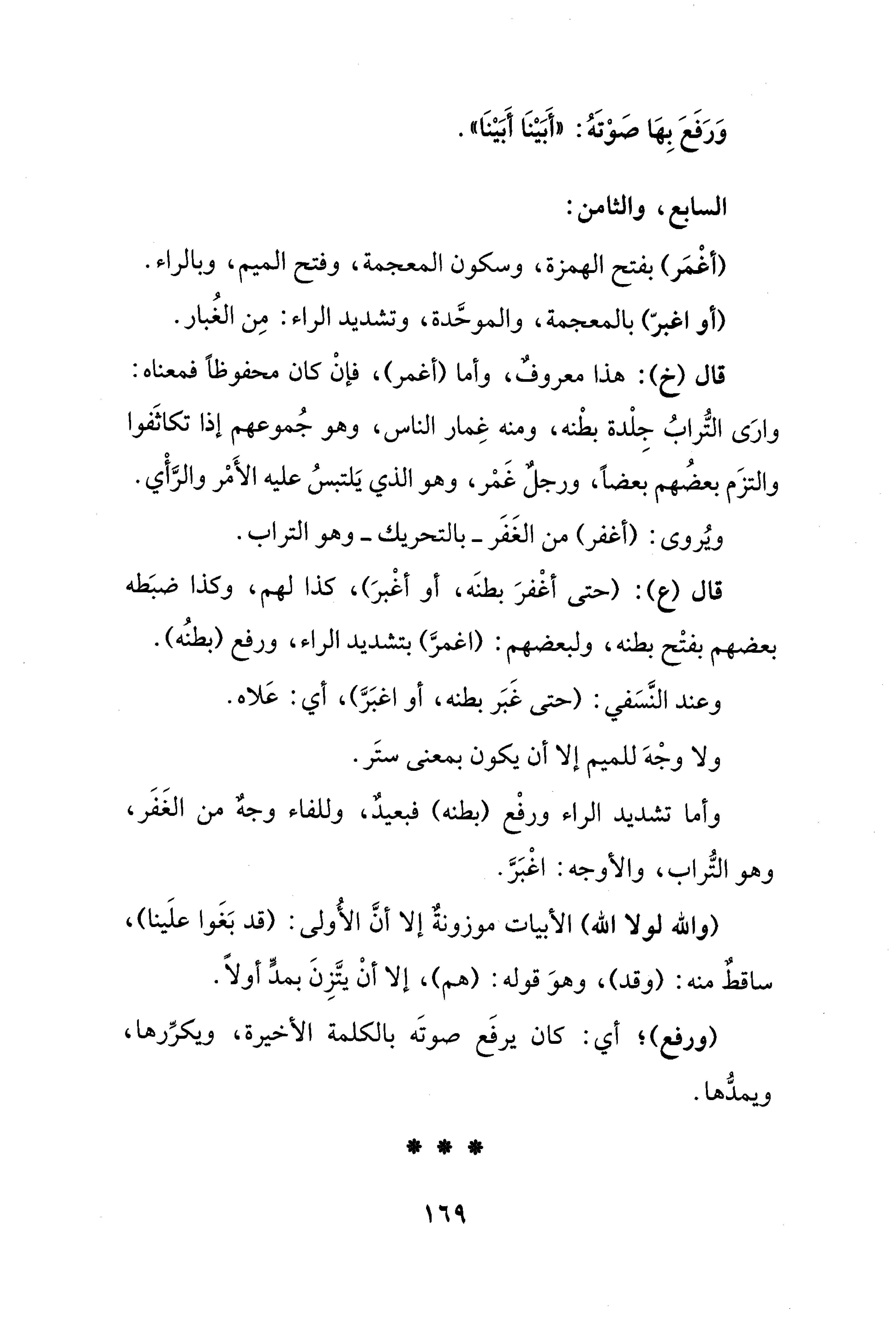 قال (ع): (حتى أغْفرَ بطنَه، أو أغْبرَ)، كذا لهم، وكذا ضبَطه بعضهم بفتْح بطنه، ولبعضهم: (اغمرَّ) بتشديد الراء، ورفع (بطنُه).