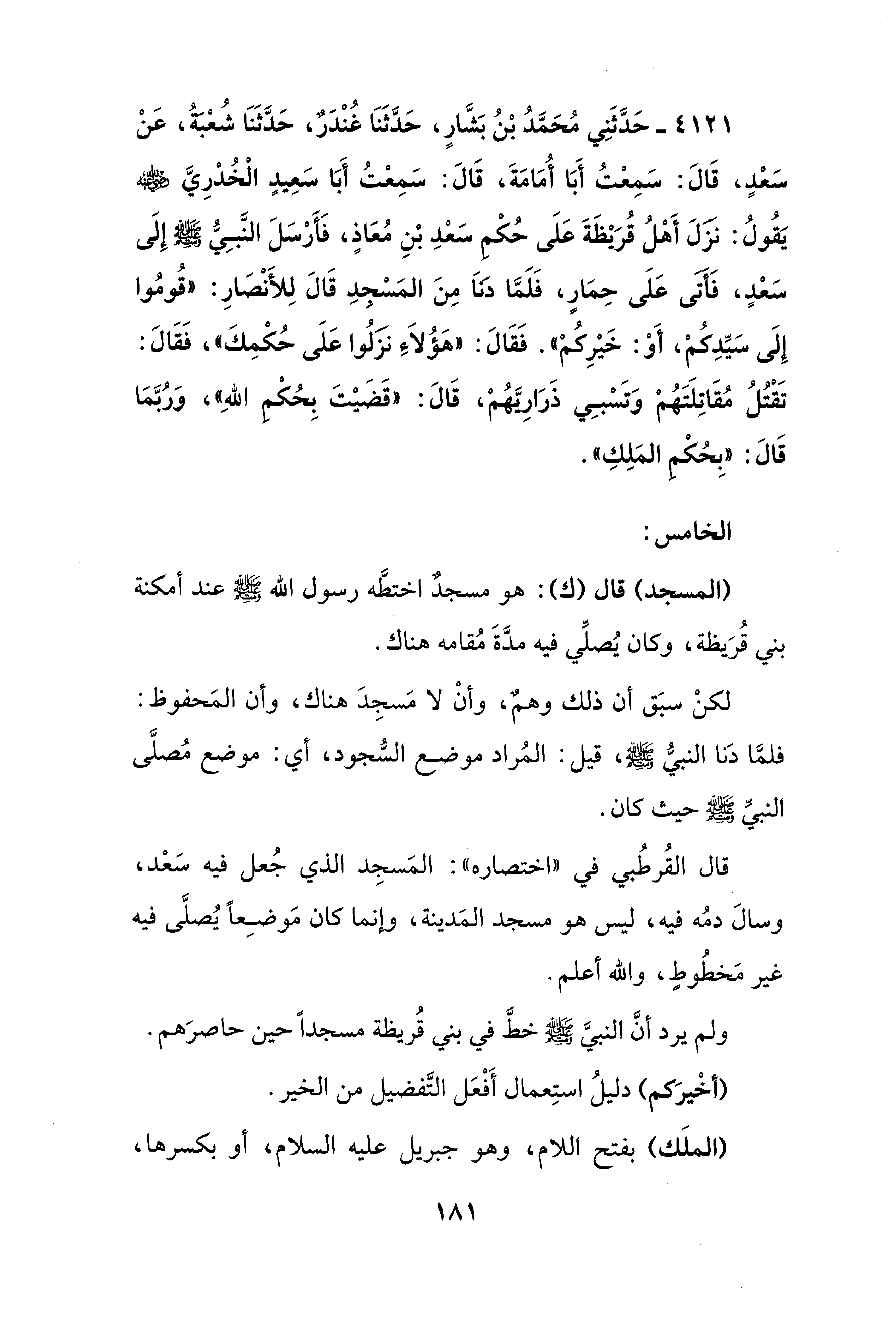 4121 - حَدَّثَنِي مُحَمَّدُ بْنُ بَشَّارٍ، حَدَّثَنَا غُنْدَرٌ، حَدَّثَنَا شُعْبَةُ، عَنْ سَعْدٍ، قَالَ: سَمِعْتُ أَبَا أُمَامَةَ، قَالَ: سَمِعْتُ أَبَا سَعِيدٍ الْخُدْرِيَّ - رضي الله عنه - يَقُولُ: نَزَلَ أَهْلُ قُرَيْظَةَ عَلَى حُكْمِ سَعْدِ بْنِ مُعَاذٍ، فَأَرْسَلَ النَّبِيُّ - صلى الله عليه وسلم - إِلَى سَعْدٍ، فَأَتَى عَلَى حِمَارٍ، فَلَمَّا دَناَ مِنَ المَسْجدِ قَالَ لِلأَنْصَارِ: "قُومُوا إِلَى سَيِّدِكُمْ، أَوْ: خَيْرِكُمْ". فَقَالَ: "هَؤُلاَءِ نزَلُوا عَلَى حُكْمِكَ"، فَقَالَ: تَقْتُلُ مُقَاتِلَتَهُمْ وَتَسْبِي ذَرَارِّيهُمْ، قَالَ: "قَضَيْتَ بِحُكْمِ اللهِ"، وَرُبَّمَا قَالَ: "بِحُكْمِ المَلِكِ".