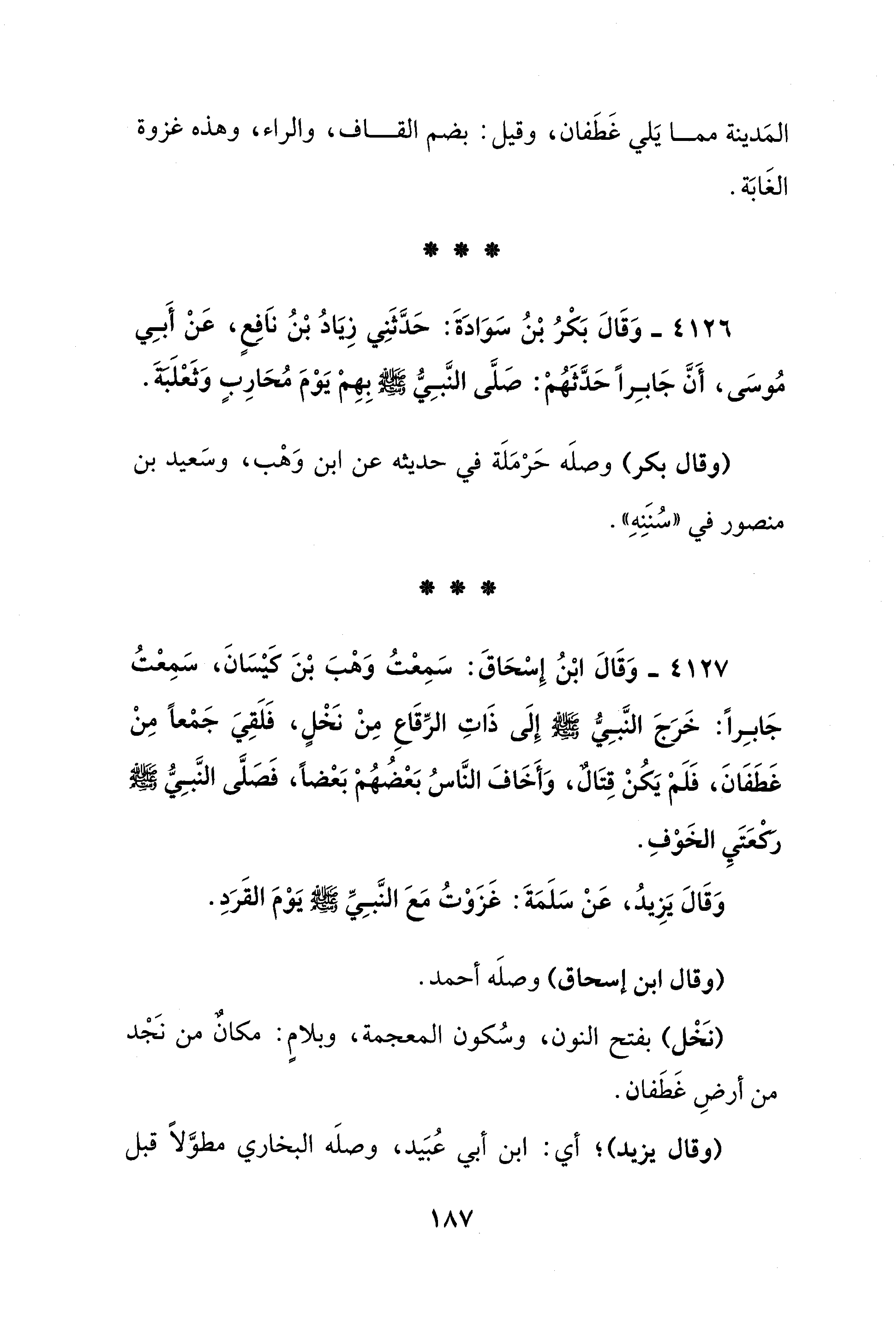 4126 - وَقَالَ بَكْرُ بْنُ سَوَادَةَ: حَدَّثَنِي زِيَادُ بْنُ نَافِعٍ، عَنْ أَبِي مُوسَى، أَنَّ جَابِرًا حَدَّثَهُمْ: صَلَّى النَّبِيُّ - صلى الله عليه وسلم - بِهِمْ يَوْمَ مُحَارِبٍ وَثَعْلَبَةَ.
