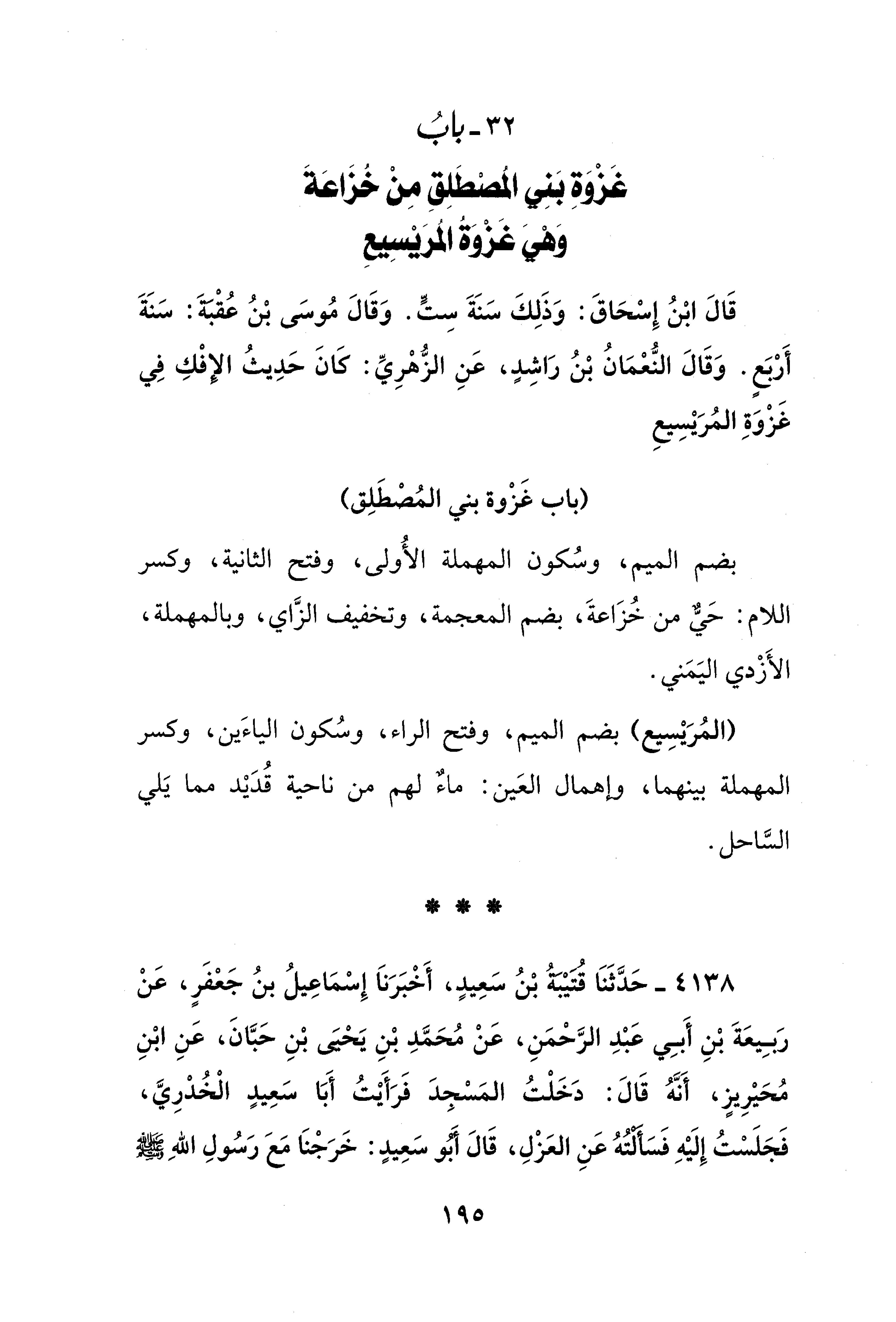 32 - بابُ غَزْوَةِ بَنِي المُصْطَلِقِ مِنْ خُزَاعَةَ وَهْيَ غَزْوَةُ المُرَيْسِيعِ