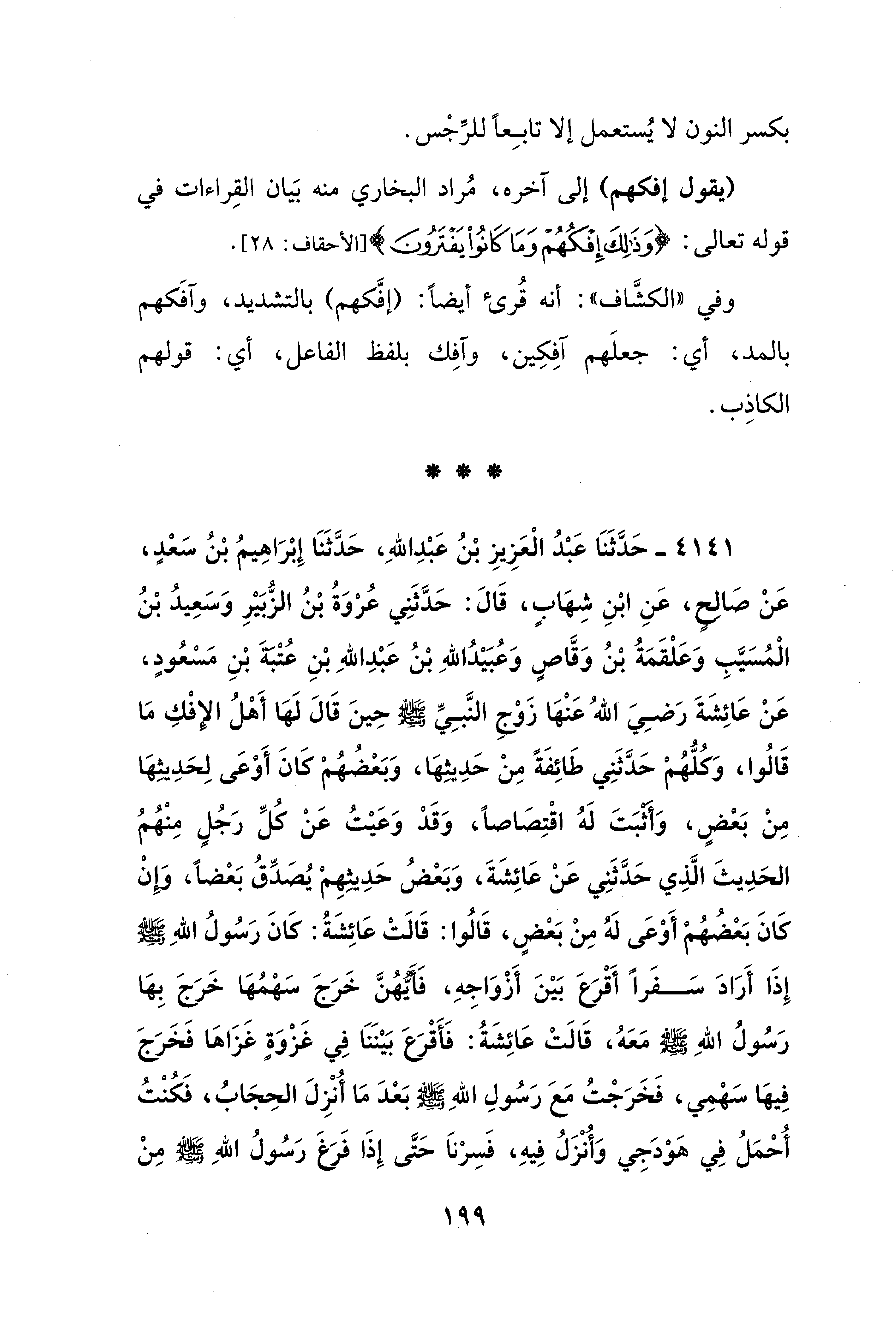 4141 - حَدَّثَنَا عَبْدُ الْعَزِيزِ بْنُ عَبْدِ اللهِ، حَدَّثَنَا إِبْرَاهِيمُ بْنُ سَعْدٍ، عَنْ صَالِحٍ، عَنِ ابْنِ شِهَابٍ، قَالَ: حَدَّثَنِي عُرْوَةُ بْنُ الزُّبَيْرِ وَسَعِيدُ بْنُ الْمُسَيَّبِ وَعَلْقَمَةُ بْنُ وَقَّاصٍ وَعُبَيْدُ اللهِ بْنُ عَبْدِ اللهِ بْنِ عُتْبَةَ بْنِ مَسْعُودٍ، عَنْ عَائِشَةَ رَضِيَ اللهُ عَنْهَا زَوْجِ النَّبِيِّ - صلى الله عليه وسلم - حِينَ قَالَ لَهَا أَهْلُ الإِفْكِ مَا قَالُوا، وَكُلُّهُمْ حَدَّثَنِي طَائِفَةً مِنْ حَدِيثِهَا، وَبَعْضُهُمْ كَانَ أَوْعَى لِحَدِيثِهَا مِنْ بَعْضٍ، وَأَثْبَتَ لَهُ اقْتِصَاصًا، وَقَدْ وَعَيْتُ عَنْ كُلِّ رَجُلٍ مِنْهُمُ الحَدِيثَ الَّذِي حَدَّثَنِي عَنْ عَائِشَةَ، وَبَعْضُ حَدِيثِهِمْ يُصَدِّقُ بَعْضًا، وَإِنْ كَانَ بَعْضُهُمْ أَوْعَى لَهُ مِنْ بَعْضٍ، قَالُوا: قَالَتْ عَائِشَةُ: كَانَ رَسُولُ اللهِ - صلى الله عليه وسلم - إِذَا أَرَادَ سَفَرًا أَقْرَعَ بَيْنَ أَزْوَاجِهِ، فَأَيُّهُنَّ خَرَجَ سَهْمُهَا خَرَجِ بِهَا رَسُولُ اللهِ - صلى الله عليه وسلم - مَعَهُ، قَالَتْ عَائِشَةُ: فَأَقْرَعَ بَيْنَنَا فِي غَزْوَةٍ غَزَاهَا فخَرَجَ فِيهَا سَهْمِي، فَخَرَجْتُ مَعَ رَسُولِ اللهِ - صلى الله عليه وسلم - بَعْدَ مَا أُنْزِلَ الحِجَابُ، فَكُنْتُ أُحْمَلُ فِي هَوْدَجِي وَأُنْزَلُ فِيهِ، فَسِرْناَ حَتَّى إِذَا فَرَغَ رَسُولُ اللهِ - صلى الله عليه وسلم - مِنْ