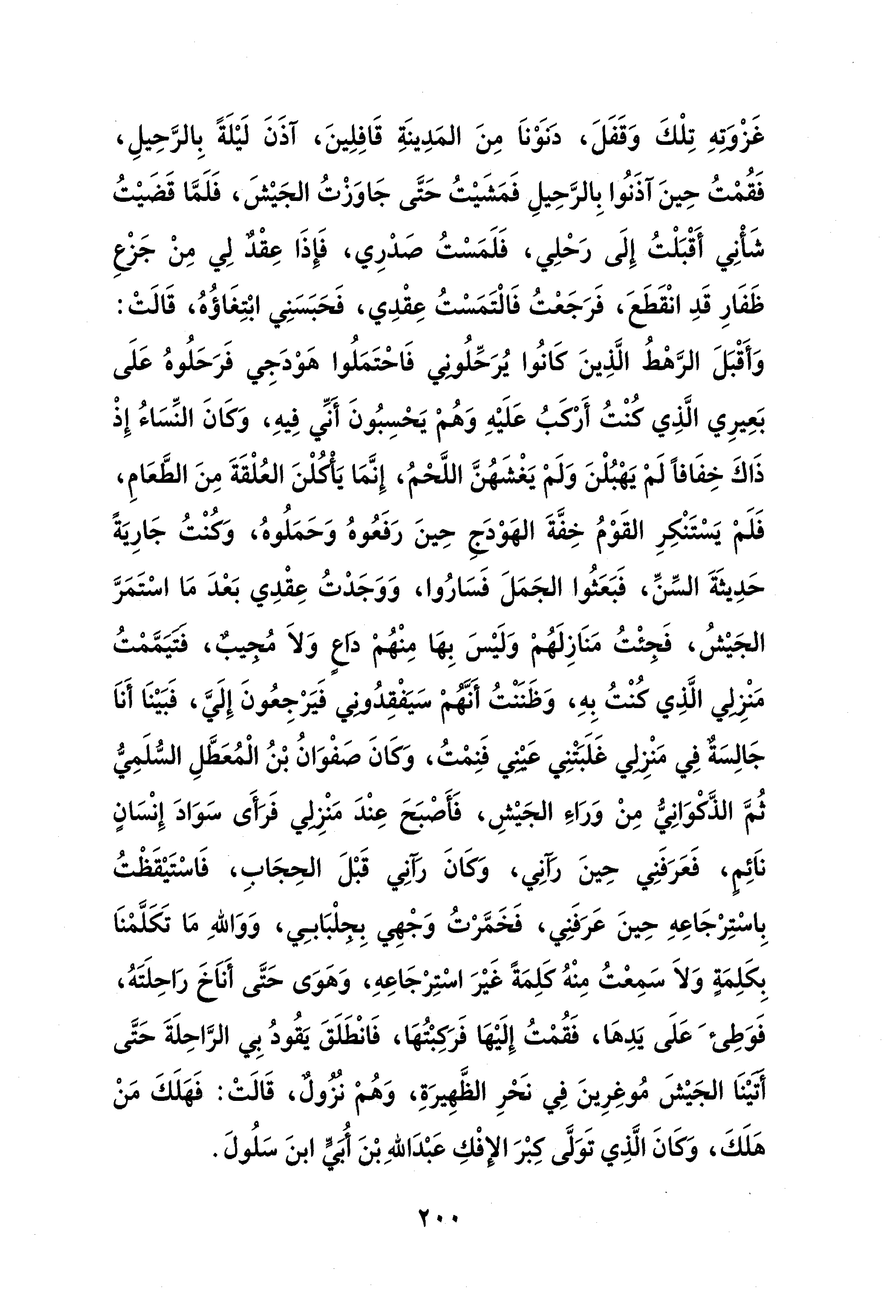 غَزْوَتهِ تِلْكَ وَقَفَلَ، دَنَوْنَا مِنَ المَدِينَةِ قَافِلِينَ، آذَنَ لَيْلَةً بِالرَّحِيلِ، فَقُمْتُ حِينَ آذَنُوا بِالرَّحِيلِ فَمَشَيْتُ حَتَّى جَاوَزْتُ الجَيْشَ، فَلَمَّا قَضَيْتُ شَأْنِي أَقْبَلْتُ إِلَى رَحْلِي، فَلَمَسْتُ صَدْرِي، فَإِذَا عِقْدٌ لِي مِنْ جَزْعِ ظَفَارِ قَدِ انْقَطَعَ، فَرَجَعْتُ فَالْتَمَسْتُ عِقْدِي، فَحَبَسَنِي ابْتِغَاؤُهُ، قَالَتْ: وَأَقْبَلَ الرَّهْطُ الَّذِينَ كَانُوا يُرَحِّلُونِي فَاحْتَمَلُوا هَوْدَجِي فَرَحَلُوهُ عَلَى بَعِيرِي الَّذِي كُنْتُ أَرْكَبُ عَلَيْهِ وَهُمْ يَحْسِبُونَ أَنِّي فِيهِ، وَكَانَ النِّسَاءُ إِذْ ذَاكَ خِفَافًا لَمْ يَهْبُلْنَ وَلَمْ يَغْشَهُنَّ اللَّحْمُ، إِنَّمَا يَأَكُلْنَ العُلْقَةَ مِنَ الطَّعَامِ، فَلَمْ يَسْتَنْكِرِ القَوْمُ خِفَّةَ الهَوْدَجِ حِينَ رَفَعُوهُ وَحَمَلُوهُ، وَكُنْتُ جَارِيَةً حَدِيثَةَ السِّنِّ، فَبَعَثُوا الجَمَلَ فَسَارُوا، وَوَجَدْتُ عِقْدِي بَعْدَ مَا اسْتَمَرَّ الجَيْشُ، فَجِئْتُ مَنَازِلَهُمْ وَلَيْسَ بِهَا مِنْهُمْ دَاعٍ وَلاَ مُجِيبٌ، فَتَيَمَّمْتُ مَنْزِلِي الَّذِي كُنْتُ بِهِ، وَظَنَنْتُ أَنَّهُمْ سَيَفْقِدُونِي فَيَرْجِعُونَ إِلَيَّ، فَبَيْنَا أَنَا جَالِسَةٌ فِي مَنْزِلِي غَلَبَتْنِي عَيْنِي فَنِمْتُ، وَكَانَ صَفْوَانُ بْنُ الْمُعَطَّلِ السُّلَمِيُّ ثُمَّ الذَّكْوَانِيُّ مِنْ وَرَاءِ الجَيْشِ، فَأَصْبَحَ عِنْدَ مَنْزِلِي فَرَأَى سَوَادَ إِنْسَانٍ نَائِمٍ، فَعَرَفَنِي حِينَ رَآنِي، وَكَانَ رَآنِي قَبْلَ الحِجَابِ، فَاسْتَيْقَظْتُ بِاسْتِرْجَاعِهِ حِينَ عَرَفَنِي، فَخَمَّرْتُ وَجْهِي بِجِلْبَابِي، وَوَاللهِ مَا تَكَلَّمْنَا بِكَلِمَةٍ وَلاَ سَمِعْتُ مِنْهُ كَلِمَةً غَيْرَ اسْتِرْجَاعِهِ، وَهَوَى حَتَّى أَنَاخَ رَاحِلَتَهُ، فَوَطِئَ عَلَى يَدِهَا، فَقُمْتُ إِلَيْهَا فَرَكِبْتُهَا، فَانْطَلَقَ يَقُودُ بِي الرَّاحِلَةَ حَتَّى أَتَيْنَا الجَيْشَ مُوغِرِينَ فِي نَحْرِ الظَّهِيرَةِ، وَهُمْ نُزُولٌ، قَالَتْ: فَهَلَكَ مَنْ هَلَكَ، وَكَانَ الَّذِي تَوَلَّى كِبْرَ الإِفْكِ عَبْدَ اللهِ بْنَ أُبَيٍّ بنَ سَلُولَ.