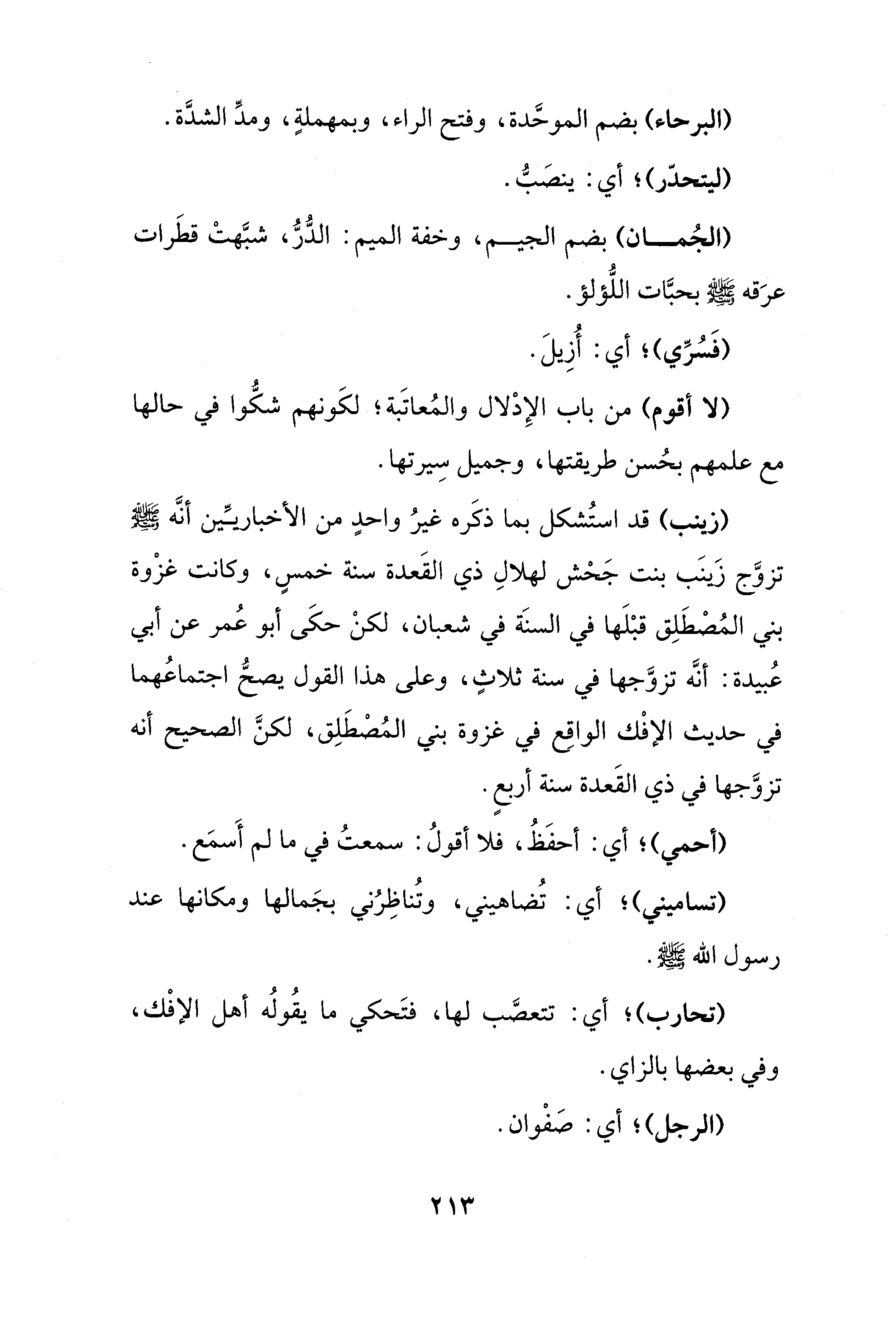 (زينب) قد استُشكل بما ذكَره غيرُ واحدٍ من الأخباريِّين أنَّه - صلى الله عليه وسلم - تزوَّج زَينَب بنت جَحْش لهلالِ ذي القَعدة سنة خمسٍ، وكانت غزْوة بني المُصْطَلِق قبْلَها في السنَة في شعبان، لكنْ حكَى أَبو عُمر عن أبي عُبيدة: أنَّه تزوَّجها في سنة ثلاثٍ، وعلى هذا القول يصحُّ اجتماعُهما في حديث الإفْك الواقِع في غزوة بني المُصْطَلِق، لكنَّ الصحيح أنه تزوَّجها في ذي القَعدة سنة أربعٍ.
