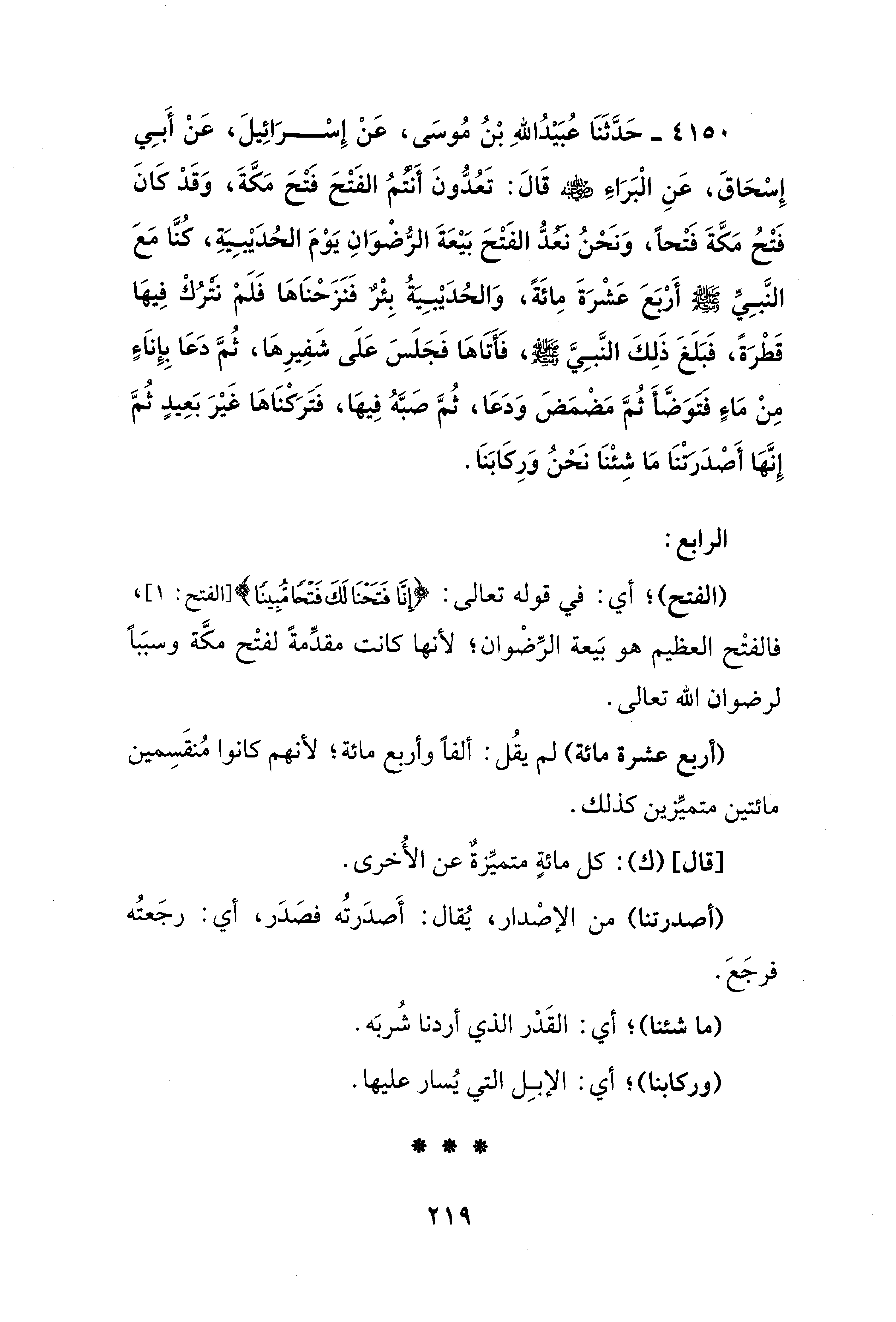 4150 - حَدَّثَنَا عُبَيْدُ اللهِ بْنُ مُوسَى، عَنْ إِسْرَائِيلَ، عَنْ أَبِي إِسْحَاقَ، عَنِ الْبَرَاءِ - رضي الله عنه - قَالَ: تَعُدُّونَ أَنْتُمُ الفَتْحَ فَتْحَ مَكَّةَ، وَقَدْ كَانَ فَتْحُ مَكَّةَ فَتْحًا، وَنَحْنُ نَعُدُّ الفَتْحَ بَيْعَةَ الرُّضْوَانِ يَوْمَ الحُدَيْبِيَةِ، كُنَّا مَعَ النَّبِيِّ - صلى الله عليه وسلم - أَرْبَعَ عَشْرَةَ مِائَةً، وَالحُدَيْبِيَةُ بِئْرٌ فَنَزَحْنَاهَا فَلَمْ نَتْرُكْ فِيهَا قَطْرَةً، فَبَلَغَ ذَلِكَ النَّبِيَّ - صلى الله عليه وسلم -، فَأَتَاهَا فَجَلَسَ عَلَى شَفِيرِهَا، ثمَّ دَعَا بِإِنَاءٍ مِنْ مَاءٍ فتوَضَّأَ ثُمَّ مَضْمَضَ وَدَعَا، ثُمَّ صَبَّهُ فِيهَا، فَتَرَكْنَاهَا غَيْرَ بَعِيدٍ ثُمَّ إِنَّهَا أَصْدَرَتْنَا مَا شِئْنَا نَحْنُ وَرِكَابَنَا.