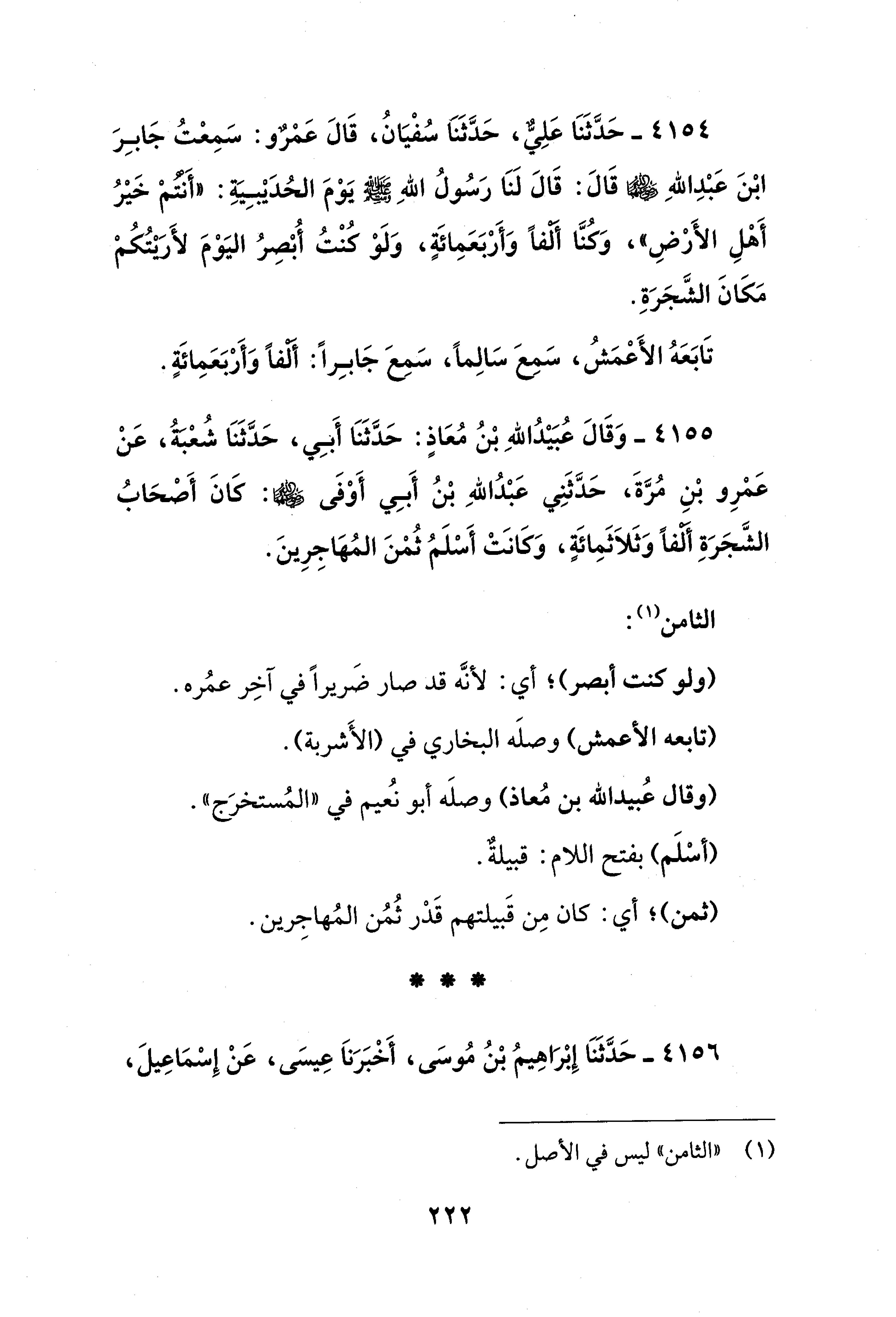 4155 - وَقَالَ عُبَيْدُ اللهِ بْنُ مُعَاذٍ: حَدَّثَنَا أَبِي، حَدَّثَنَا شُعْبَةُ، عَنْ عَمْرِو بْنِ مُرَّةَ، حَدَّثَنِي عَبْدُ اللهِ بْنُ أَبِي أَوْفَى - رضي الله عنهما -: كَانَ أَصْحَابُ الشَّجَرَةِ أَلْفًا وَثَلاَثَمِائَةٍ، وَكَانَتْ أَسْلَمُ ثُمْنَ المُهَاجِرِينَ.