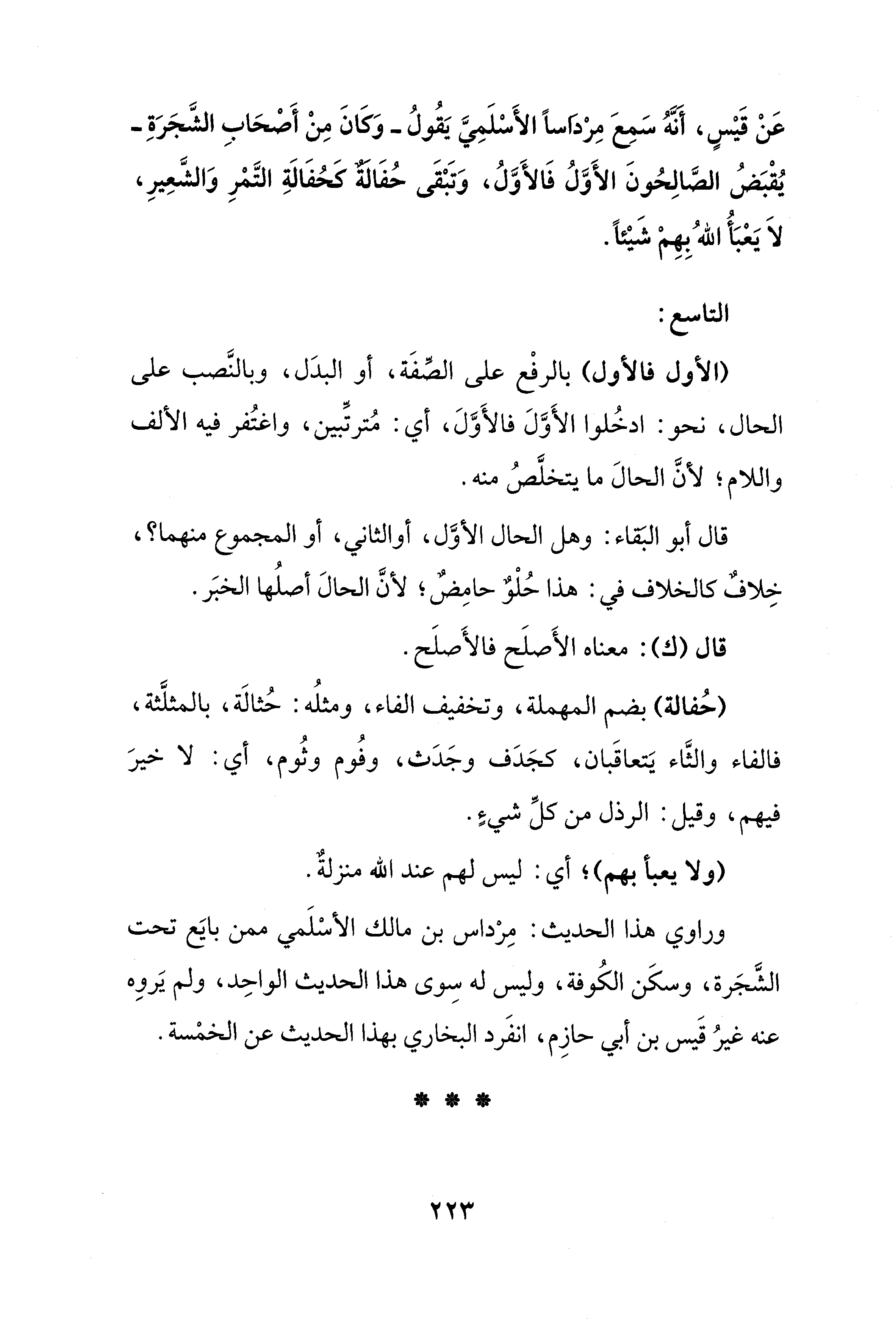 عَنْ قَيْسٍ، أَنَّهُ سَمِعَ مِرْدَاسًا الأَسْلَمِيَّ يَقُولُ -وَكَانَ مِنْ أَصْحَابِ الشَّجَرَةِ- يُقْبَضُ الصَّالِحُونَ الأَوَّلُ فَالأَوَّلُ، وَتَبْقَى حُفَالَةٌ كَحُفَالَةِ التَّمْرِ وَالشَّعِيرِ، لاَ يَعْبَأُ اللهُ بِهِمْ شَيْئًا.
