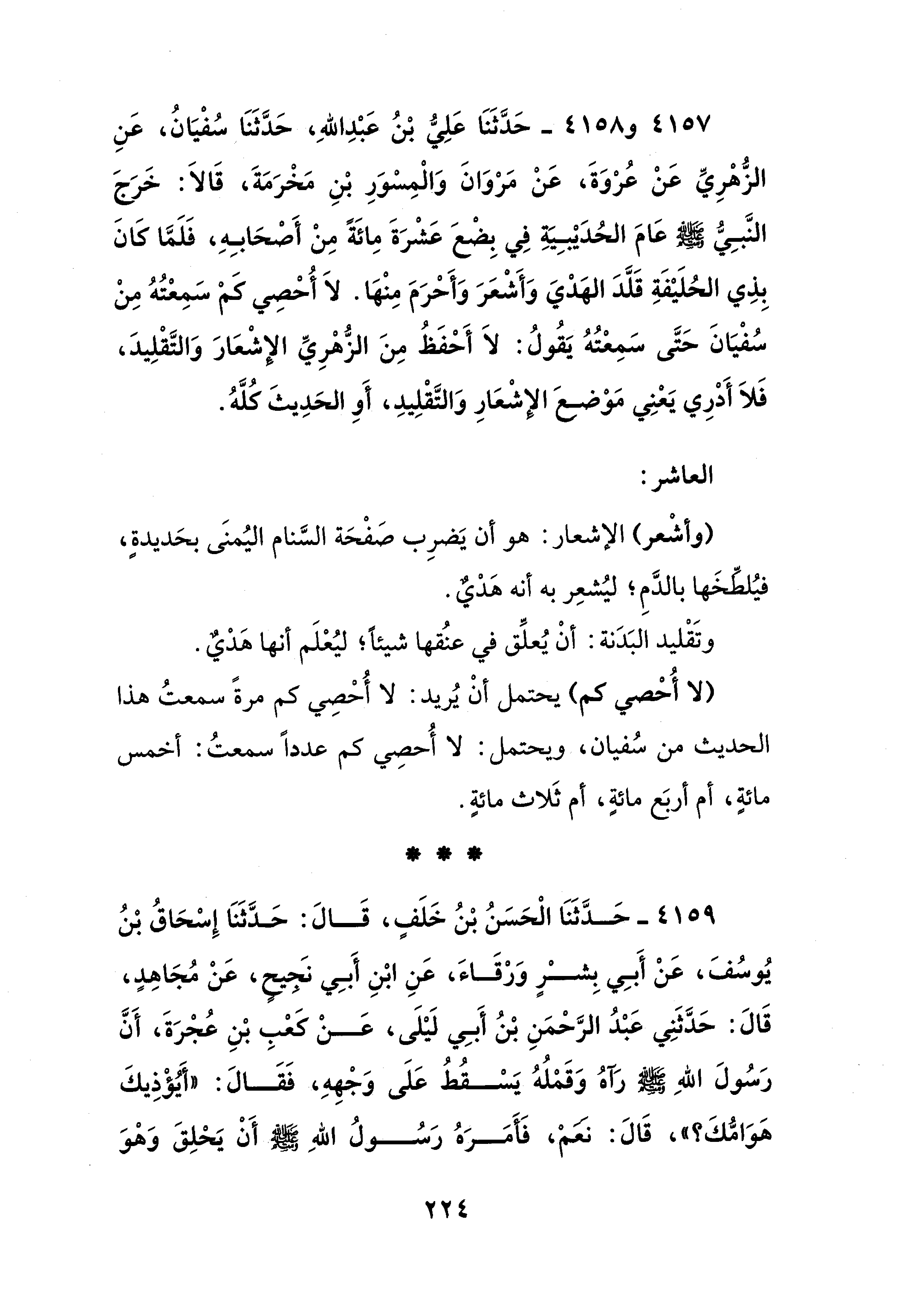 4157 - و 4158 - حَدَّثَنَا عَلِيُّ بْنُ عَبْدِ اللهِ، حَدَّثَنَا سُفْيَانُ، عَنِ الزُّهْرِيِّ عَنْ عُرْوَةَ، عَنْ مَرْوَانَ وَالْمِسْوَرِ بْنِ مَخْرَمَةَ، قَالاَ: خَرَجَ النَّبِيُّ - صلى الله عليه وسلم - عَامَ الحُدَيْبِيَةِ في بِضْعَ عَشْرَةَ مِائَةً مِنْ أَصْحَابِهِ، فَلَمَّا كَانَ بِذِي الحُلَيْفَةِ قَلَّدَ الهَدْيَ وَأَشْعَرَ وَأَحْرَمَ مِنْهَا. لاَ أُحْصِي كَمْ سَمِعْتُهُ مِنْ سُفْيَانَ حَتَّى سَمِعْتُهُ يَقُولُ: لاَ أَحْفَظُ مِنَ الزُّهْرِيِّ الإشْعَارَ وَالتَّقْلِيدَ، فَلاَ أَدْرِي يَعْنِي مَوْضعَ الإشْعَارِ وَالتَّقْلِيدِ، أَوِ الحَدِيثَ كُلَّهُ.