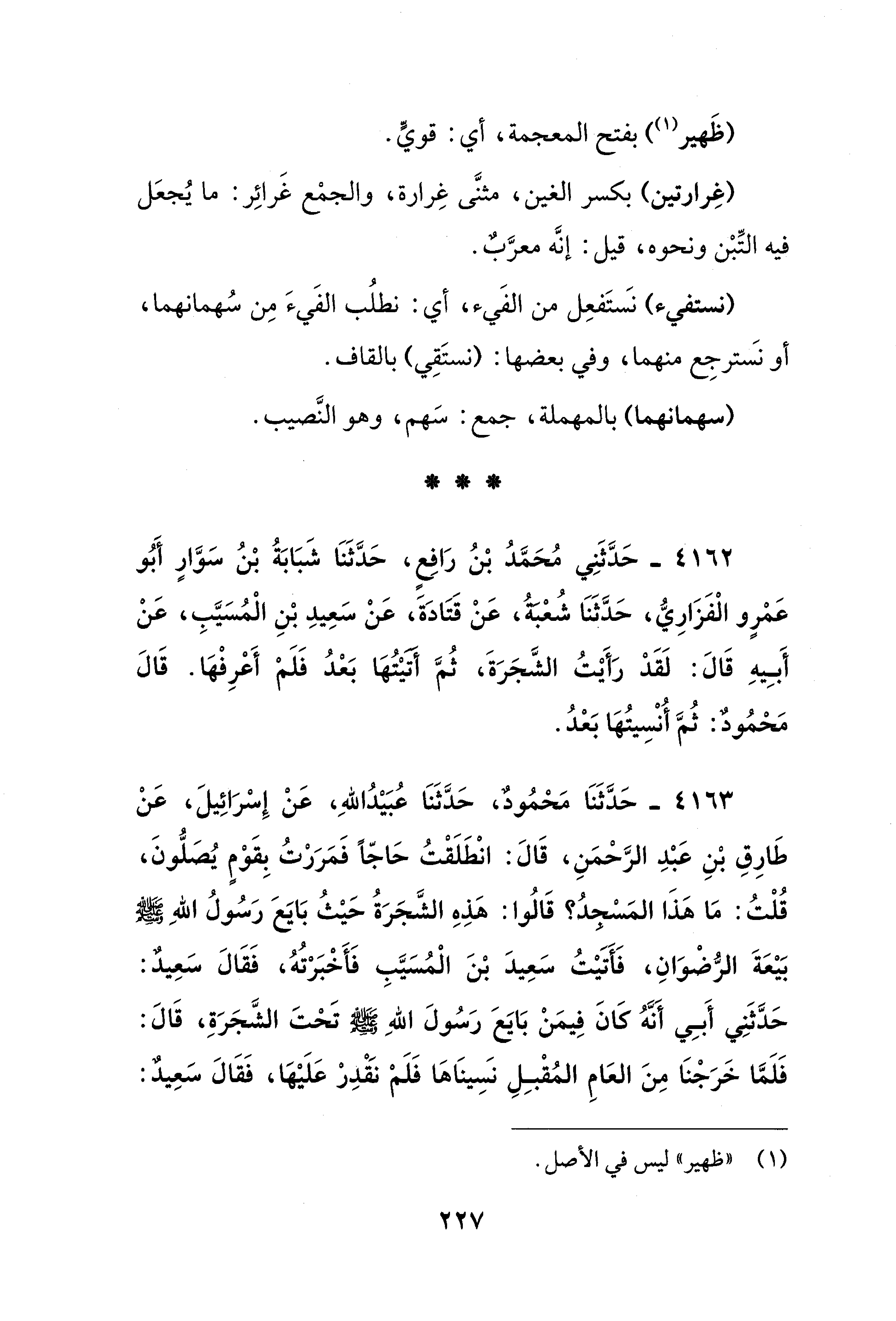 4163 - حَدَّثَنَا مَحْمُودٌ، حَدَّثَنَا عُبَيْدُ اللهِ، عَنْ إِسْرَائِيلَ، عَنْ طَارِقِ بْنِ عَبْدِ الرَّحْمَنِ، قَالَ: انْطَلَقْتُ حَاجًّا فَمَرَرْتُ بِقَوْمٍ يُصَلُّونَ، قُلْتُ: مَا هَذَا المَسْجدُ؟ قَالُوا: هَذِهِ الشَّجَرَةُ حَيْثُ بَايَعَ رَسُولُ اللهِ - صلى الله عليه وسلم - بَيْعَةَ الرُّضْوَانِ، فَأَتَيْتُ سَعِيدَ بْنَ الْمُسَيَّبِ فَأَخْبَرْتُهُ، فَقَالَ سَعِيدٌ: حَدَّثَنِي أَبِي أَنَّهُ كَانَ فِيمَنْ بَايَعَ رَسُولَ اللهِ - صلى الله عليه وسلم - تَحْتَ الشَّجَرَةِ، قَالَ: فَلَمَّا خَرَجْنَا مِنَ العَامِ المُقْبِلِ نسَينَاهَا فَلَمْ نَقْدِرْ عَلَيْهَا، فَقَالَ سَعِيدٌ: