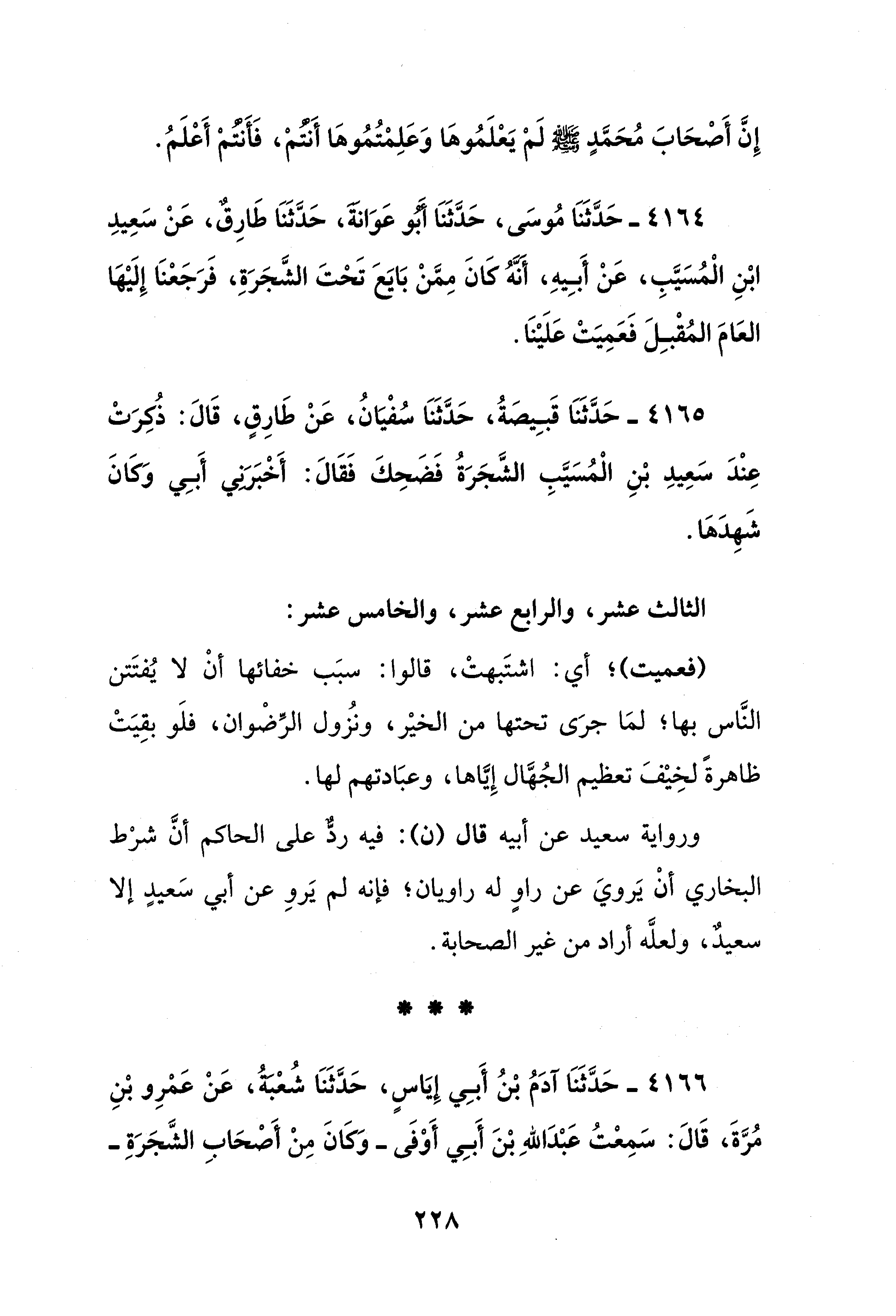 4165 - حَدَّثَنَا قَبِيصَةُ، حَدَّثَنَا سُفْيَانُ، عَنْ طَارِقٍ، قَالَ: ذُكِرَتْ عِنْدَ سَعِيدِ بْنِ الْمُسَيَّبِ الشَّجَرَةُ فَضَحِكَ فَقَالَ: أَخْبَرَنِي أَبِي وَكَانَ شَهِدَهَا.