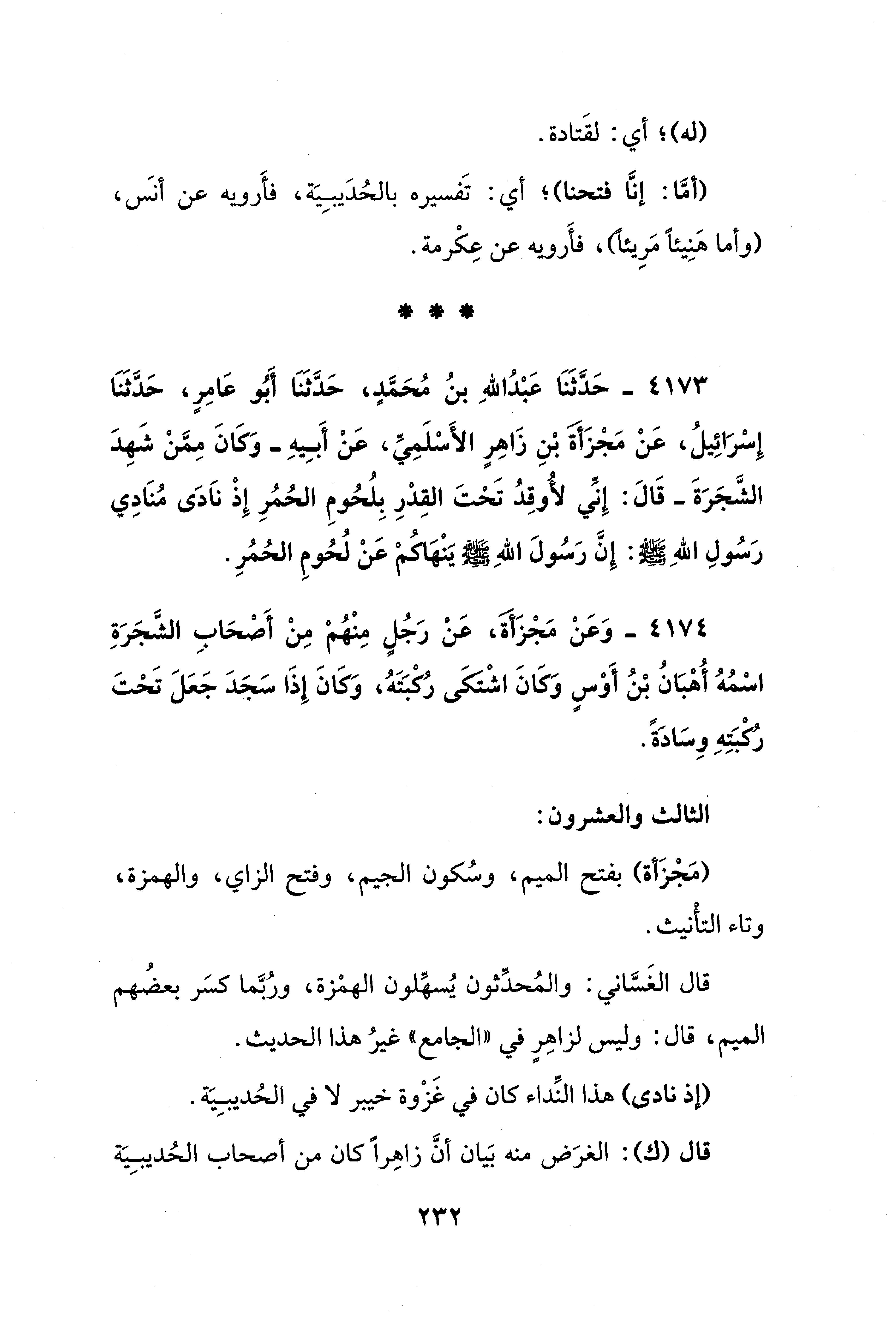 4173 - حَدَّثَنَا عَبْدُ اللهِ بنُ مُحَمَّدٍ، حَدَّثَنَا أَبُو عَامِرٍ، حَدَّثَنَا إِسْرَائِيلُ، عَنْ مَجْزَأَةَ بْنِ زَاهِرٍ الأَسْلَمِيِّ، عَنْ أَبِيهِ -وَكَانَ مِمَّنْ شَهِدَ الشَّجَرَةَ- قَالَ: إِنِّي لأُوقِدُ تَحْتَ القِدْرِ بِلُحُومِ الحُمُرِ إِذْ ناَدَى مُنَادِي رَسُولِ اللهِ - صلى الله عليه وسلم -: إِنَّ رَسُولَ اللهِ - صلى الله عليه وسلم - يَنْهَاكُمْ عَنْ لُحُومِ الحُمُرِ.