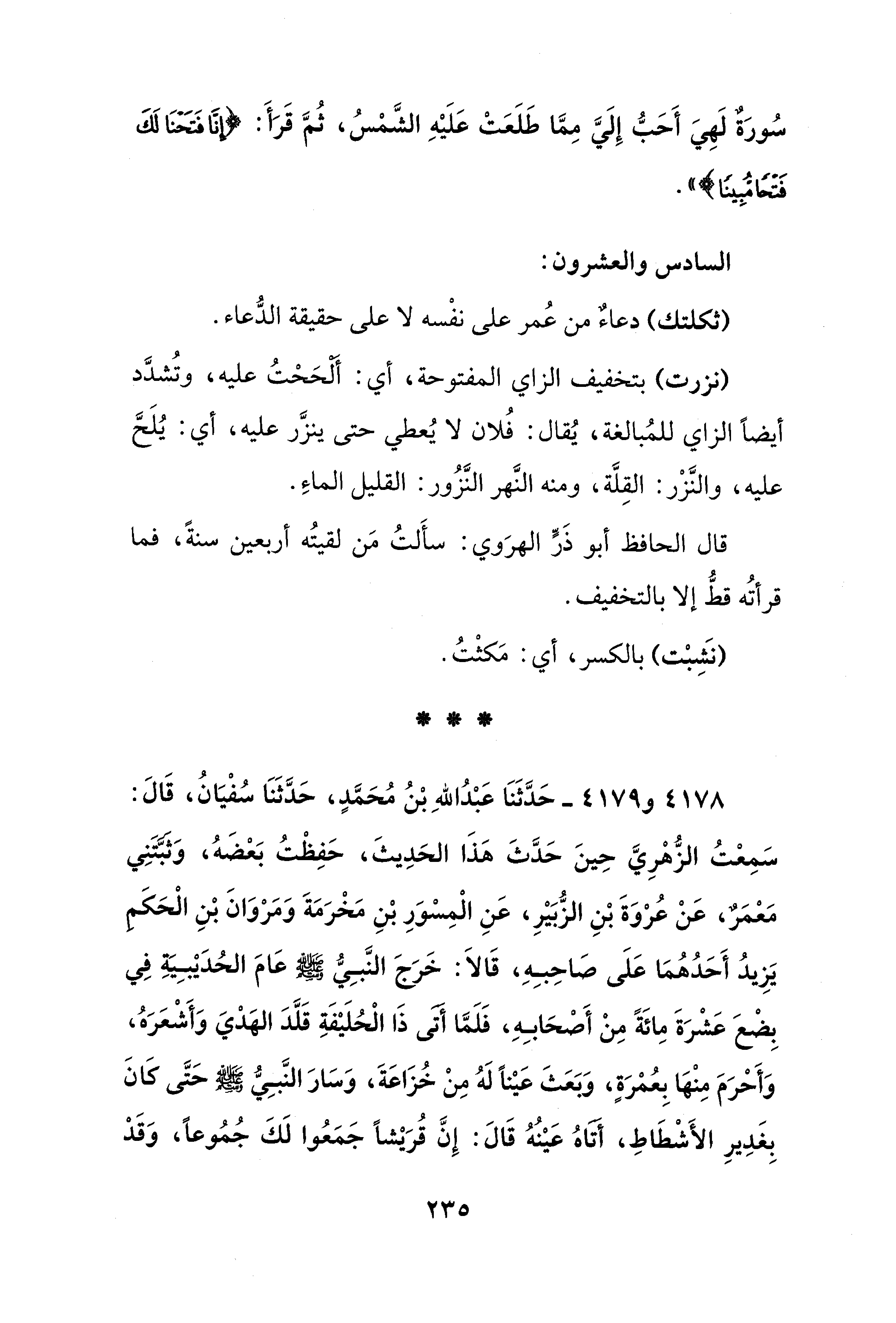 4178 - و 4179 - حَدَّثَنَا عَبْدُ اللهِ بْنُ مُحَمَّدٍ، حَدَّثَنَا سُفْيَانُ، قَالَ: سَمِعْتُ الزُّهْرِيَّ حِينَ حَدَّثَ هَذَا الحَدِيثَ، حَفِظْتُ بَعْضَهُ، وَثَبَّتَنِي مَعْمَرٌ، عَنْ عُرْوَةَ بْنِ الزُّبَيْرِ، عَنِ الْمِسْوَرِ بْنِ مَخْرَمَةَ وَمَرْوَانَ بْنِ الْحَكَمِ يَزِيدُ أَحَدُهُمَا عَلَى صَاحِبِهِ، قَالاَ: خَرَجَ النَّبِيُّ - صلى الله عليه وسلم - عَامَ الحُدَيْبِيَةِ في بِضْعَ عَشْرَةَ مِائَةً مِنْ أَصْحَابِهِ، فَلَمَّا أَتَى ذَا الْحُلَيْفَةِ قَلَّدَ الهَدْيَ وَأَشْعَرَهُ، وَأَحْرَمَ مِنْهَا بِعُمْرَةٍ، وَبَعَثَ عَيْنًا لَهُ مِنْ خُزَاعَةَ، وَسَارَ النَّبِيُّ - صلى الله عليه وسلم - حَتَّى كَانَ بِغَدِيرِ الأَشْطَاطِ، أَتَاهُ عَيْنُهُ قَالَ: إِنَّ قُرَيْشًا جَمَعُوا لَكَ جُمُوعًا، وَقَدْ