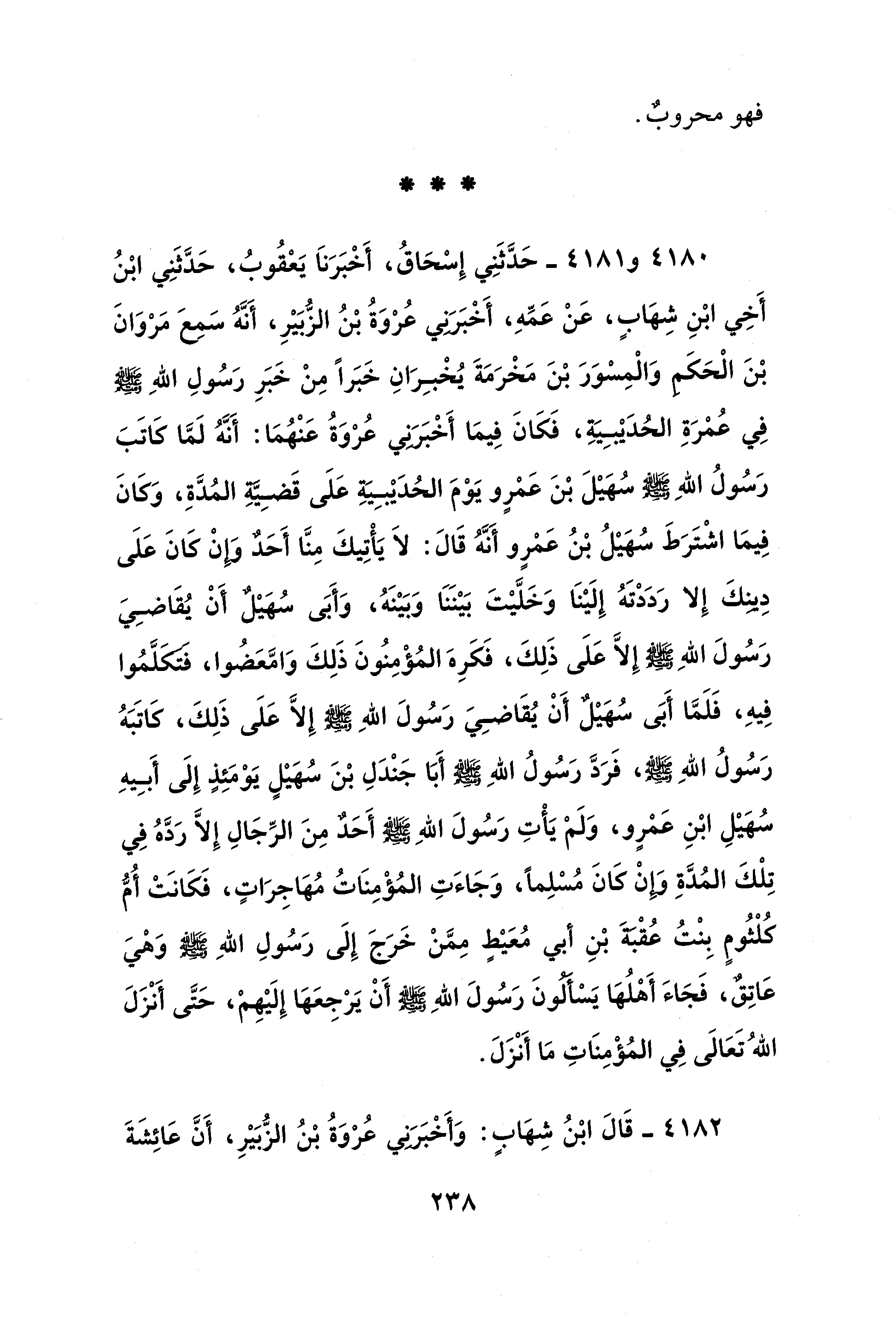 4180 - و 4181 - حَدَّثَنِي إِسْحَاقُ، أَخْبَرَنَا يَعْقُوبُ، حَدَّثَنِي ابْنُ أَخِي ابْنِ شِهَابٍ، عَنْ عَمِّهِ، أَخْبَرَنِي عُرْوَةُ بْنُ الزُّبَيْرِ، أَنَّهُ سَمِعَ مَرْوَانَ بْنَ الْحَكَمِ وَالْمِسْوَرَ بْنَ مَخْرَمَةَ يُخْبِرَانِ خَبَرًا مِنْ خَبَرِ رَسُولِ اللهِ - صلى الله عليه وسلم - في عُمْرَةِ الحُدَيْبِيَةِ، فَكَانَ فِيمَا أَخْبَرَنِي عُرْوَةُ عَنْهُمَا: أَنَّهُ لَمَّا كَاتَبَ رَسُولُ اللهِ - صلى الله عليه وسلم - سُهَيْلَ بْنَ عَمْرٍو يَوْمَ الحُدَيْبِيَةِ عَلَى قَضِيَّهِ المُدَّةِ، وَكَانَ فِيمَا اشْتَرَطَ سُهَيْلُ بْنُ عَمْرٍو أَنَّهُ قَالَ: لاَ يَأْتِيكَ مِنَّا أَحَدٌ وَإِنْ كَانَ عَلَى دِينِكَ إِلا رَدَدْتَهُ إِلَيْنَا وَخَلَّيْتَ بَيْنَنَا وَبَيْنَهُ، وَأَبَى سُهَيْلٌ أَنْ يُقَاضِيَ رَسُولَ اللهِ - صلى الله عليه وسلم - إِلَّا عَلَى ذَلِكَ، فَكَرِهَ المُؤْمِنُونَ ذَلِكَ وَامَّعَضُوا، فتكَلَّمُوا فِيهِ، فَلَمَّا أَبَى سُهَيْلٌ أَنْ يُقَاضِيَ رَسُولَ اللهِ - صلى الله عليه وسلم - إِلَّا عَلَى ذَلِكَ، كَاتَبَهُ رَسُولُ اللهِ - صلى الله عليه وسلم -، فَرَدَّ رَسُولُ اللهِ - صلى الله عليه وسلم - أَبَا جَنْدَلِ بْنَ سُهَيْلٍ يَوْمَئِذٍ إِلَى أَبِيهِ سُهَيْلِ بْنِ عَمْرٍو، وَلَمْ يَأْتِ رَسُولَ اللهِ - صلى الله عليه وسلم - أَحَدٌ مِنَ الرِّجَالِ إِلَّا رَدَّهُ فِي تِلْكَ المُدَّةِ وَإِنْ كَانَ مُسْلِمًا، وَجَاءَتِ المُؤْمِنَاتُ مُهَاجِرَاتٍ، فَكَانَتْ أُمُّ كُلْثُومٍ بِنْتُ عُقْبَةَ بْنِ أبي مُعَيْطٍ مِمَّنْ خَرَجَ إِلَى رَسُولِ اللهِ - صلى الله عليه وسلم - وَهْيَ عَاتِقٌ، فَجَاءَ أَهْلُهَا يَسْأَلْونَ رَسُولَ اللهِ - صلى الله عليه وسلم - أَنْ يَرْجِعَهَا إِلَيْهِمْ، حَتَّى أَنْزَلَ اللهُ تَعَالَى فِي المُؤْمِنَاتِ مَا أَنْزَلَ.