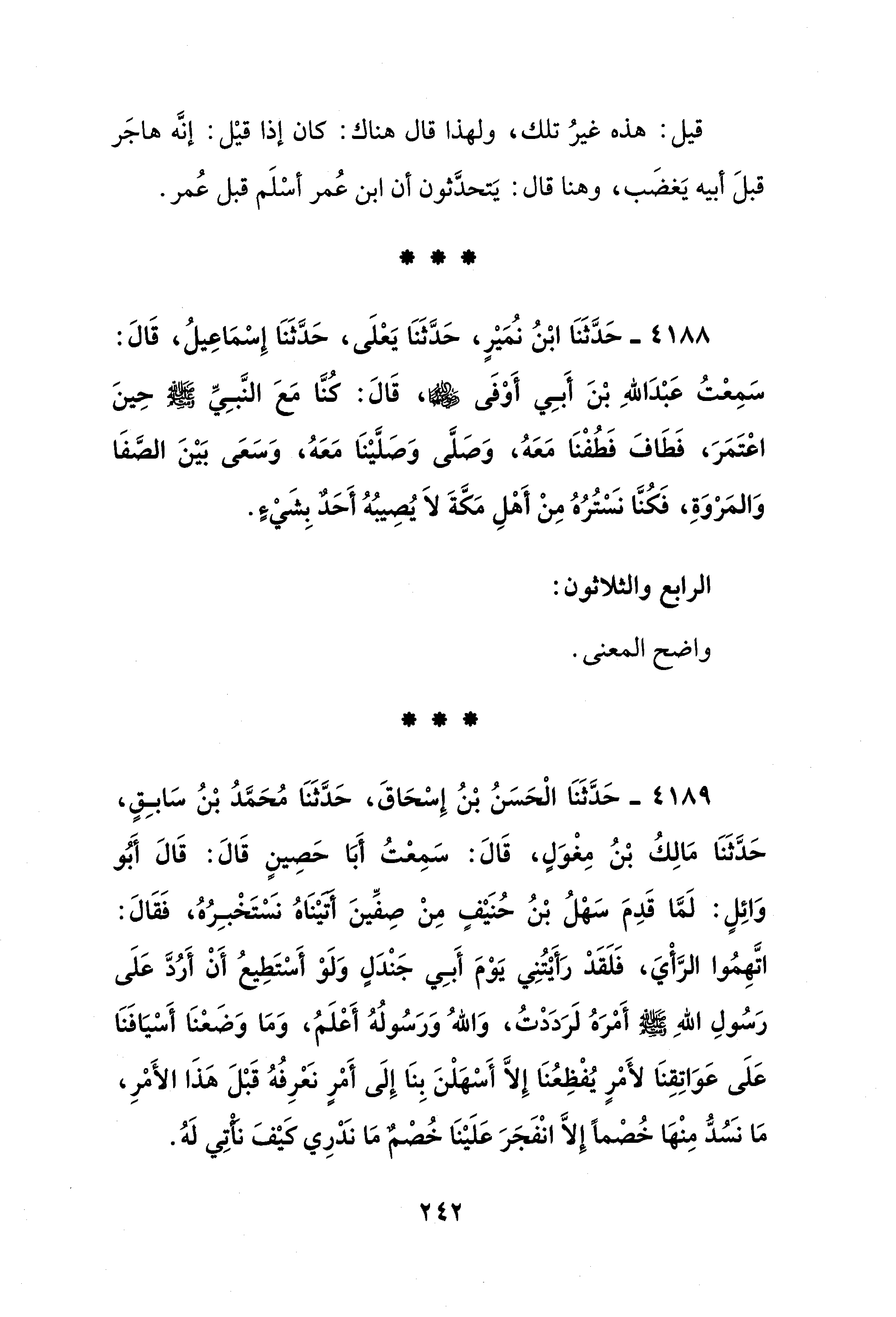 4189 - حَدَّثَنَا الْحَسَنُ بْنُ إِسْحَاقَ، حَدَّثَنَا مُحَمَّدُ بْنُ سَابِقٍ، حَدَّثَنَا مَالِكُ بْنُ مِغْوَلٍ، قَالَ: سَمِعْتُ أَبَا حَصِينٍ قَالَ: قَالَ أَبُو وَائِلٍ: لَمَّا قَدِمَ سَهْلُ بْنُ حُنَيْفٍ مِنْ صِفِّينَ أَتَيْنَاهُ نَسْتَخْبِرُهُ، فَقَالَ: اتَّهِمُوا الرَّأْيَ، فَلَقَدْ رَأَيْتُنِي يَوْمَ أَبِي جَنْدَلٍ وَلَوْ أَسْتَطِيعُ أَنْ أَرُدَّ عَلَى رَسُولِ اللهِ - صلى الله عليه وسلم - أَمْرَهُ لَرَدَدْتُ، وَاللهُ وَرَسُولُهُ أَعْلَمُ، وَمَا وَضَعْنَا أَسْيَافَنَا عَلَى عَوَاتِقِنَا لأَمْرٍ يُفْظِعُنَا إلا أَسْهَلْنَ بِنَا إِلَى أَمْرٍ نَعْرِفُهُ قَبْلَ هَذَا الأَمْرِ، مَا نَسُدُّ مِنْهَا خُصْمًا إِلَّا انْفَجَرَ عَلَيْنَا خُصْمٌ مَا نَدْرِي كَيْفَ نَأْتِي لَهُ.