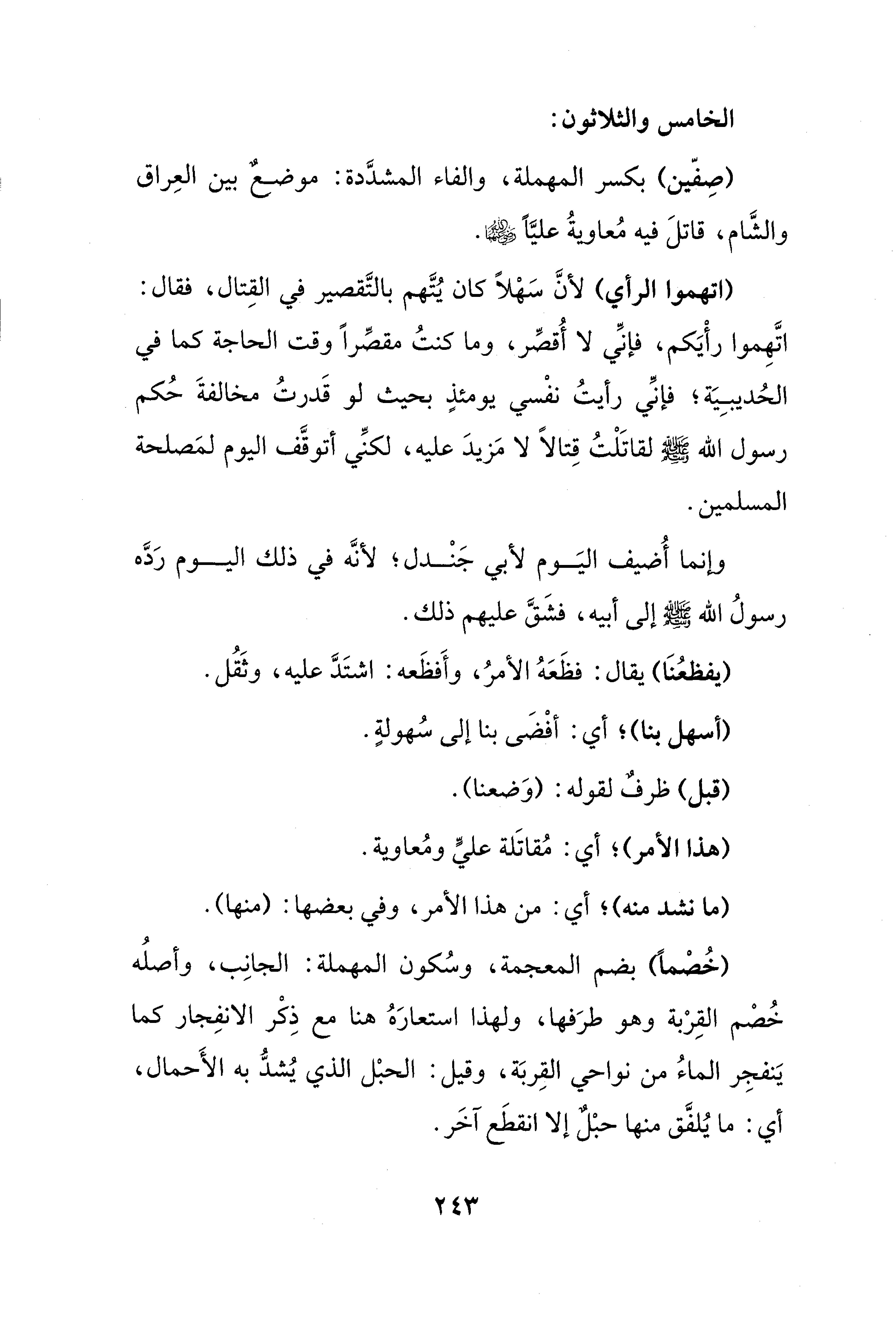(اتهموا الرأي) لأنَّ سَهْلًا كان يُتَّهم بالتَّقصير في القِتال، فقال: اتَّهِموا رأْيَكم، فإنِّي لا أُقصِّر، وما كنتُ مقصِّرًا وقت الحاجة كما في الحُديبِيَة؛ فإنِّي رأيتُ نفْسي يومئذٍ بحيث لو قَدرتُ مخالفةَ حُكم رسول الله - صلى الله عليه وسلم - لقاتَلْتُ قِتالًا لا مَزيدَ عليه، لكنِّي أتوقَّف اليوم لمَصلحة المسلمين.