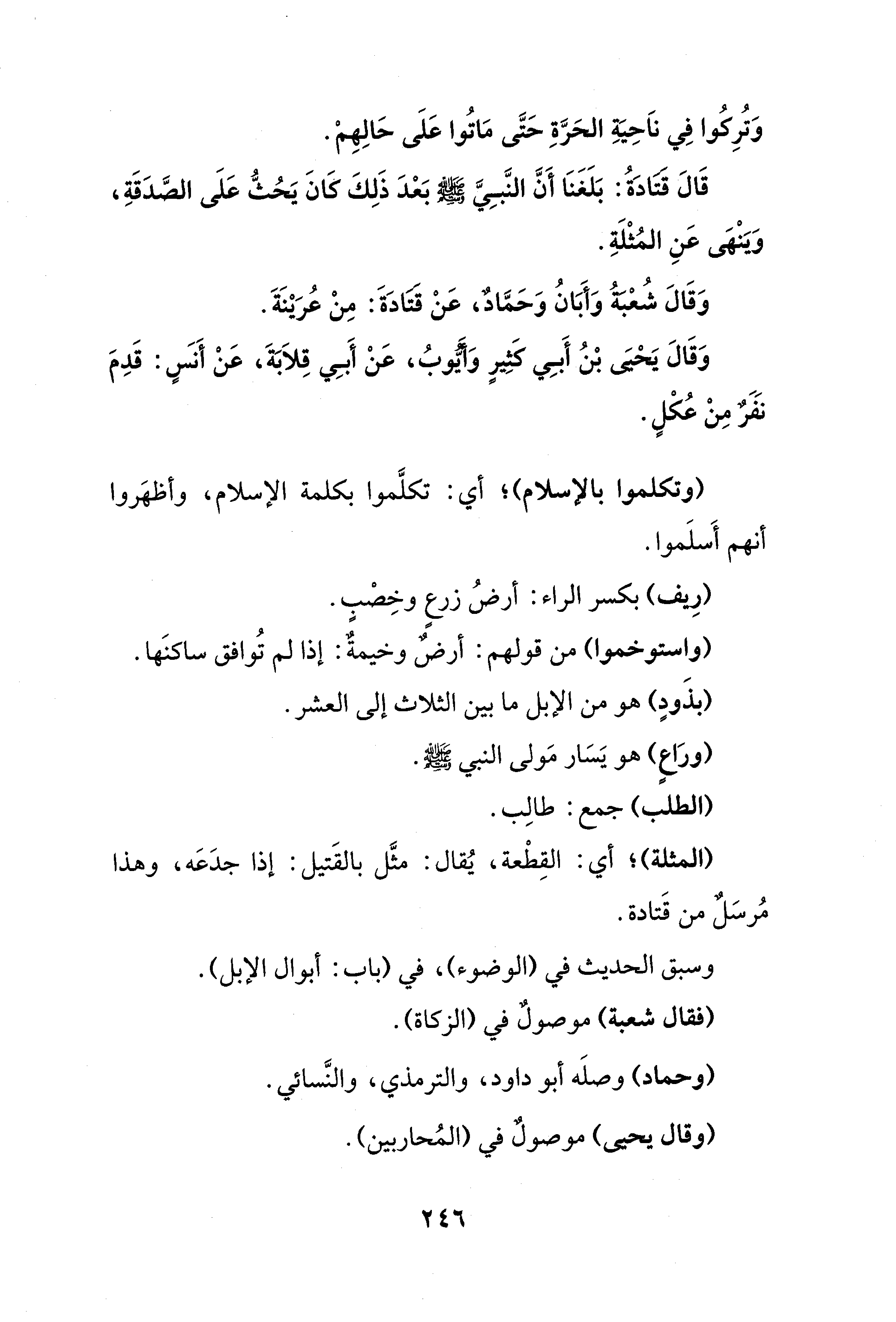 قَالَ قَتَادَةُ: بَلَغَنَا أَنَّ النَّبِيَّ - صلى الله عليه وسلم - بَعْدَ ذَلِكَ كانَ يَحُثُّ عَلَى الصَّدَقَةِ، وَيَنْهَى عَنِ المُثْلَةِ.