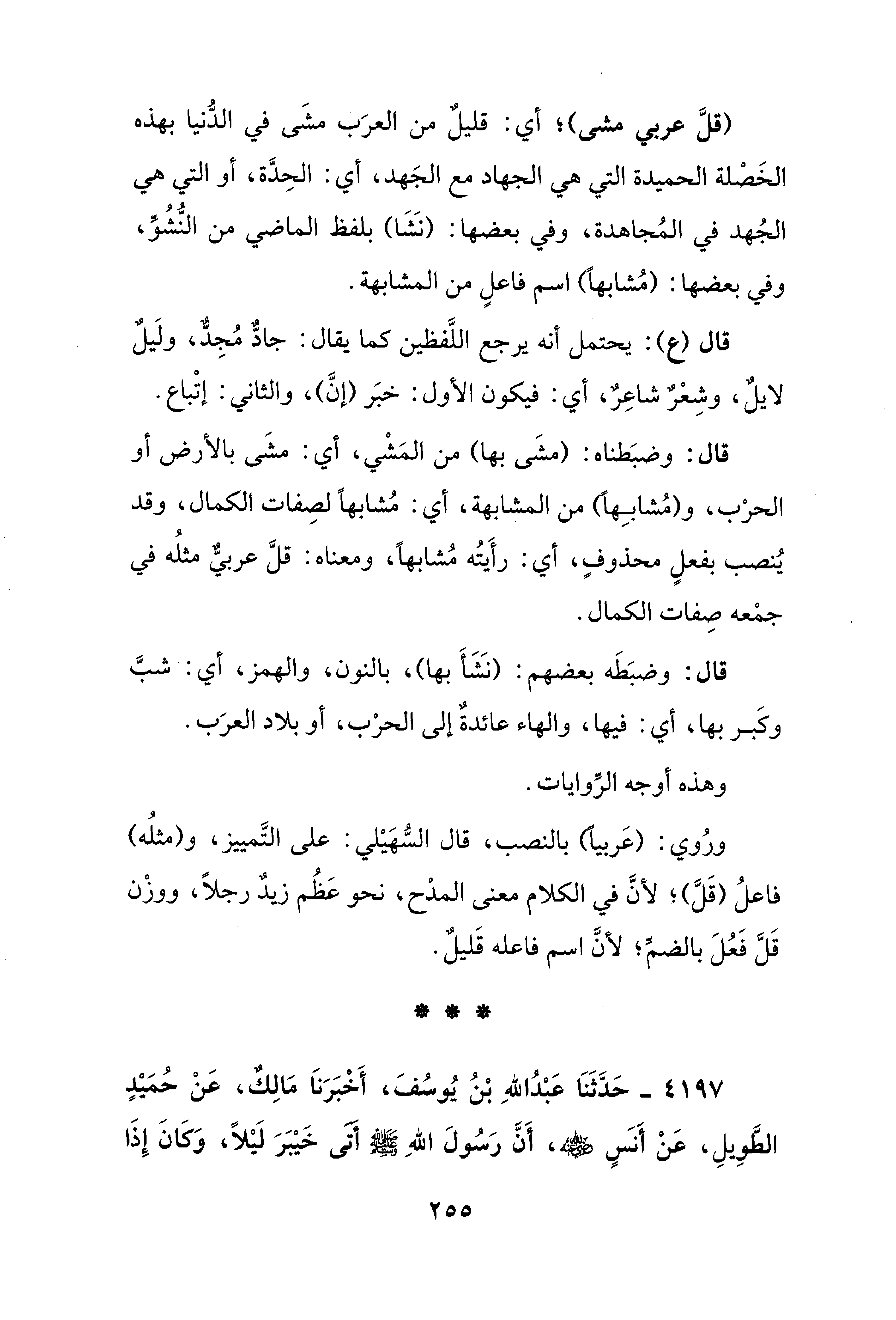 قال: وضبَطناه: (مشَى بها) من المَشْي، أي: مشَى بالأرض أو الحرْب، و (مُشابِهًا) من المشابهة، أي: مُشابهًا لصِفات الكمال، وقد يُنصب بفعلٍ محذوفٍ، أي: رأَيتُه مُشابهًا، ومعناه: قلَّ عربيٌّ مثلُه في جمْعه صِفات الكمال.