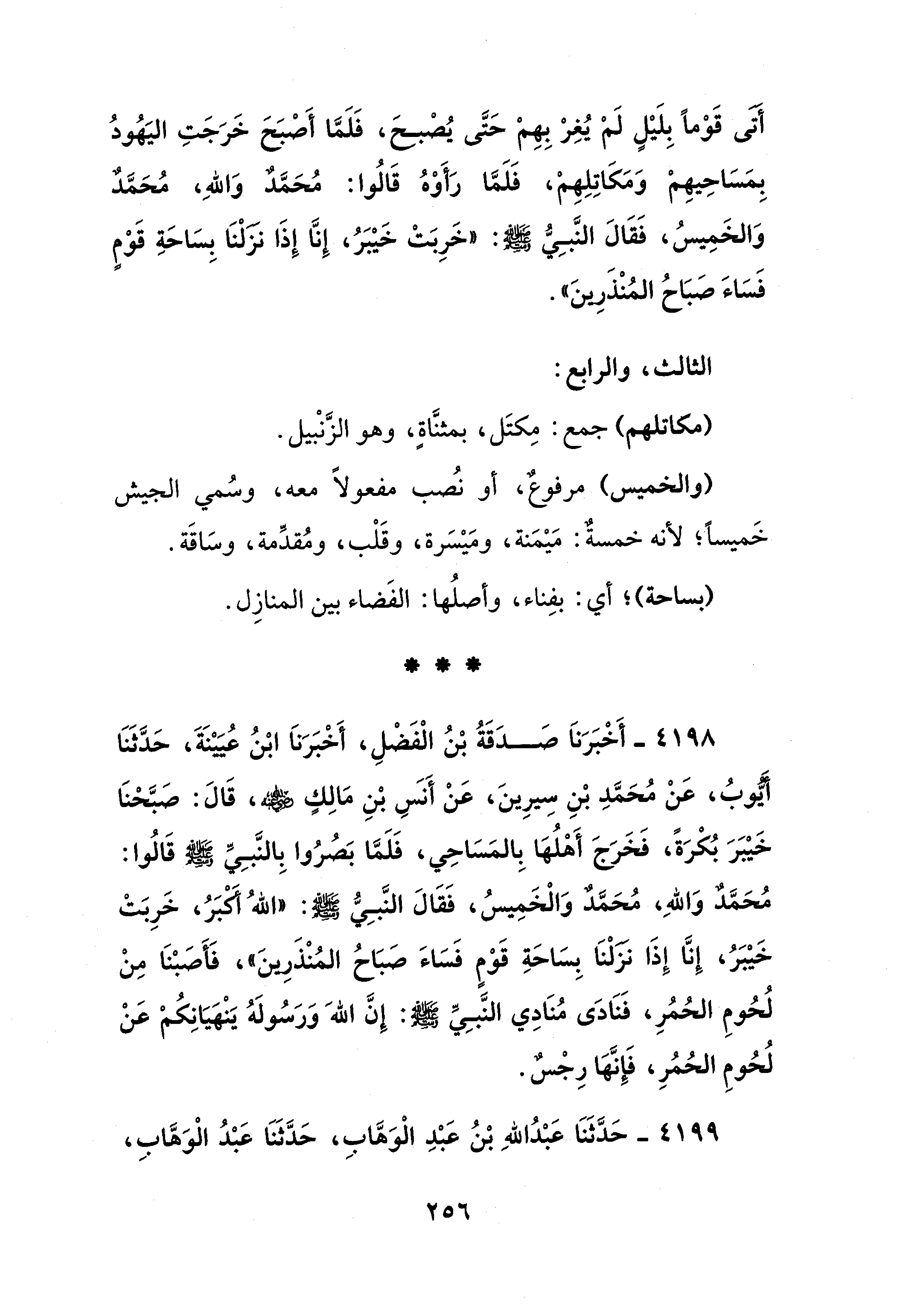 4198 - أَخْبَرَنَا صَدَقَةُ بْنُ الْفَضْلِ، أَخْبَرَنَا ابْنُ عُيَيْنَةَ، حَدَّثَنَا أَيُّوبُ، عَنْ مُحَمَّدِ بْنِ سِيرِينَ، عَنْ أَنس بْنِ مَالِكٍ - رضي الله عنه -، قَالَ: صَبَّحْنَا خَيْبَرَ بُكْرَةً، فَخَرَجَ أَهْلُهَا بِالمَسَاحِي، فَلَمَّا بَصُرُوا بِالنَّبِيِّ - صلى الله عليه وسلم - قَالُوا: مُحَمَّدٌ وَاللهِ، مُحَمَّدٌ وَالْخَمِيسُ، فَقَالَ النَّبِيُّ - صلى الله عليه وسلم -: "اللهُ أَكْبَرُ، خَرِبَتْ خَيْبَرُ، إِنَّا إِذَا نَزَلْنَا بِسَاحَةِ قَوْمٍ فَسَاءَ صَبَاحُ المُنْذَرِينَ"، فَأَصَبْنَا مِنْ لُحُومِ الحُمُرِ، فَنَادَى مُنَادِي النَّبِيِّ - صلى الله عليه وسلم -: إِنَّ اللهَ وَرَسُولَهُ يَنْهَيَانِكُمْ عَنْ لُحُومِ الحُمُرِ، فَإِنَّهَا رِجْسٌ.