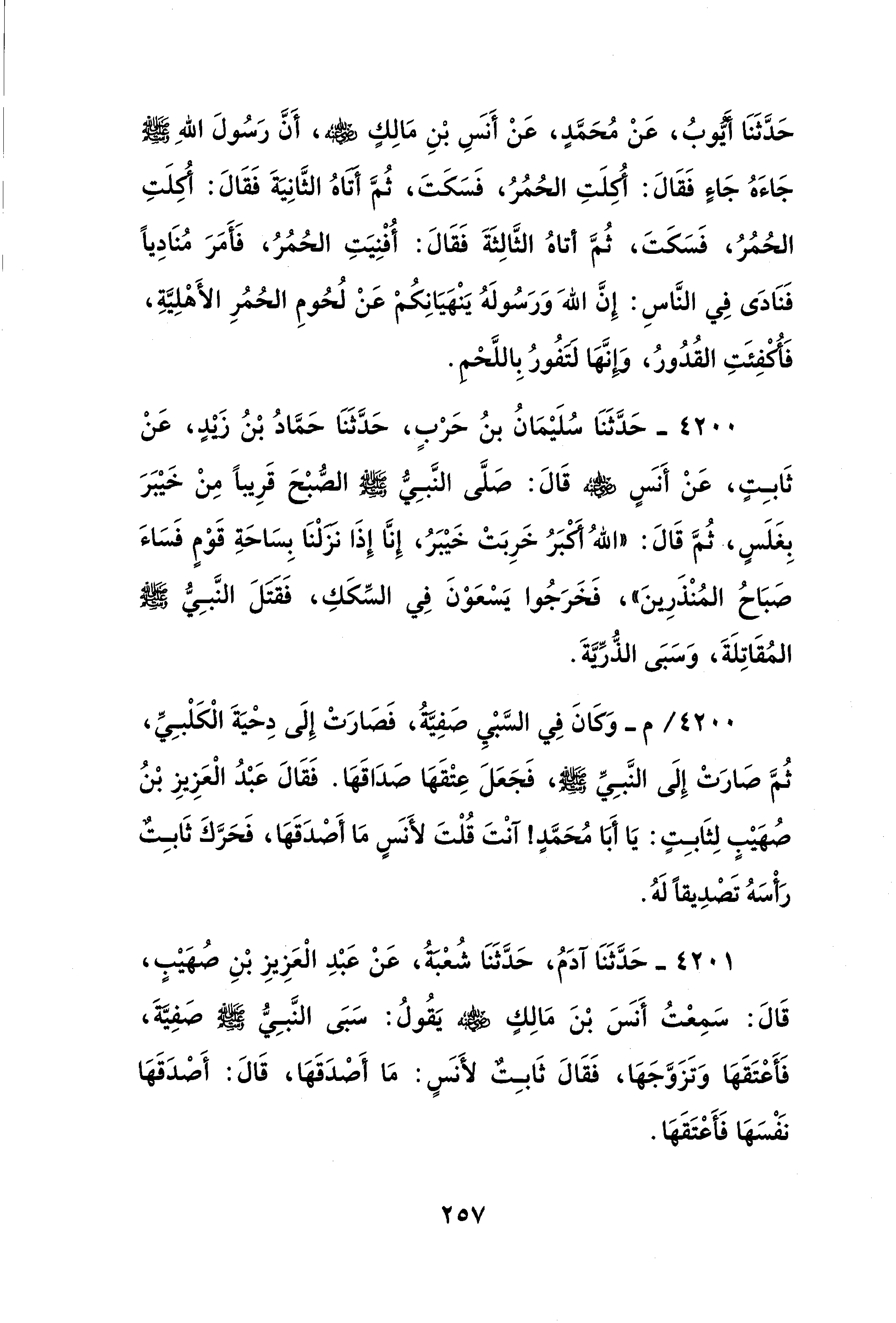 4201 - حَدَّثَنَا آدَمُ، حَدَّثَنَا شُعْبَة، عَنْ عَبْدِ الْعَزِيزِ بْنِ صُهَيْبٍ، قَالَ: سَمِعْتُ أَنَسَ بْنَ مَالِكٍ - صلى الله عليه وسلم - يَقُولُ: سَبَى النَّبِيُّ - صلى الله عليه وسلم - صَفِيَّةَ، فَأَعْتَقَهَا وَتَزَوَّجَهَا، فَقَالَ ثَابِتٌ لأَنَسٍ: مَا أَصْدَقَهَا، قَالَ: أَصْدَقَهَا نَفْسَهَا فَأَعْتَقَهَا.