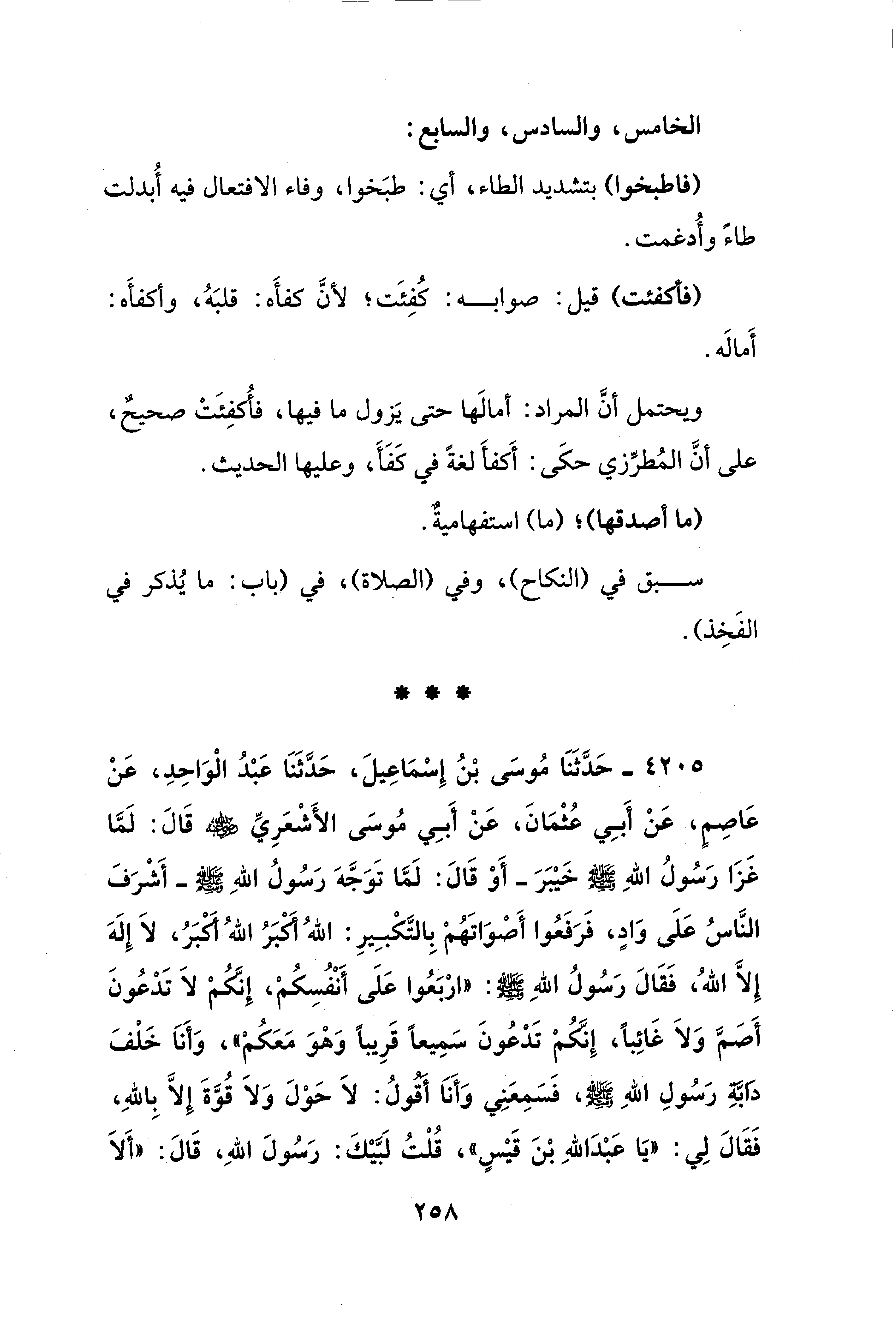 4205 - حَدَّثَنَا مُوسَى بْنُ إِسْمَاعِيلَ، حَدَّثَنَا عَبْدُ الْوَاحِدِ، عَنْ عَاصِمٍ، عَنْ أَبِي عُثْمَانَ، عَنْ أَبِي مُوسَى الأَشعَرِيِّ - رضي الله عنه - قَالَ: لَمَّا غَزَا رَسُولُ اللهِ - صلى الله عليه وسلم - خَيْبَرَ -أَوْ قَالَ: لَمَّا تَوَجَّهَ رَسُولُ اللهِ - صلى الله عليه وسلم - - أَشْرَفَ النَّاسُ عَلَى وَادٍ، فَرَفَعُوا أَصْوَاتَهُمْ بِالتَّكْبِيرِ: اللهُ أَكْبَرُ اللهُ أَكْبَرُ، لاَ إِلَهَ إِلَّا اللهُ، فَقَالَ رَسُولُ اللهِ - صلى الله عليه وسلم -: "ارْبَعُوا عَلَى أَنْفُسِكُمْ، إِنَّكمْ لاَ تَدْعُونَ أَصَمَّ وَلاَ غَائِبًا، إِنَّكُمْ تَدْعُونَ سَمِيعًا قَرِيبًا وَهْوَ مَعَكُمْ"، وَأَنَا خَلْفَ دَابَّةِ رَسُولِ اللهِ - صلى الله عليه وسلم -، فَسَمِعَنِي وَأَنَا أَقُولُ: لاَ حَوْلَ وَلاَ قُوَّةَ إِلَّا بِاللهِ، فَقَالَ لِي: "يَا عَبْدَ اللهِ بْنَ قَيْسٍ"، قُلْتُ لَبَّيْكَ: رَسُولَ اللهِ، قَالَ: "أَلاَ