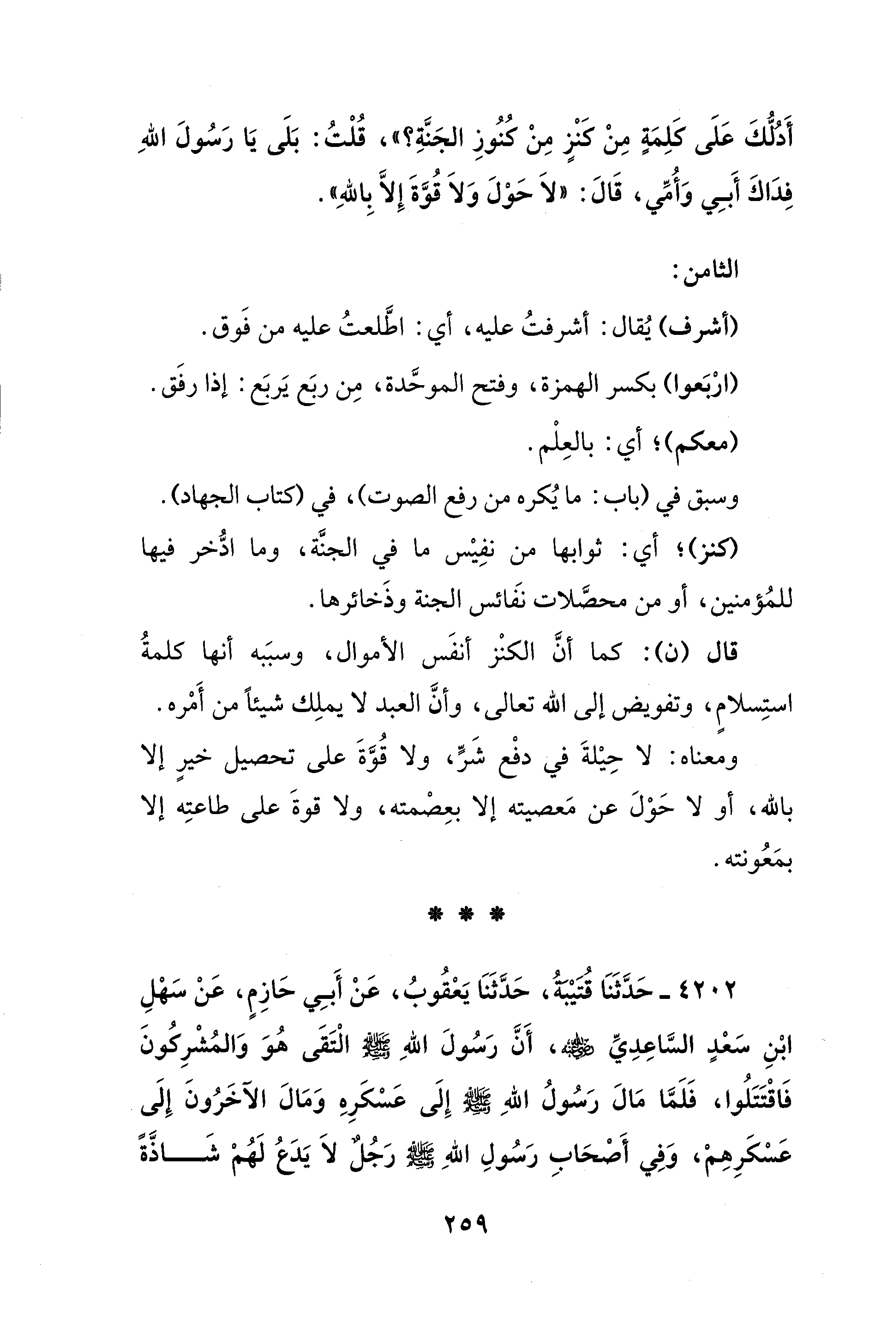 أَدُلُّكَ عَلَى كلِمَةٍ مِنْ كنْزٍ مِنْ كُنُوزِ الجَنَّةِ؟ "، قُلْتُ: بَلَى يَا رَسُولَ اللهِ فِدَاكَ أَبِي وَأُمِّي، قَالَ: "لاَ حَوْلَ وَلاَ قُوَّةَ إِلَّا بِاللهِ".