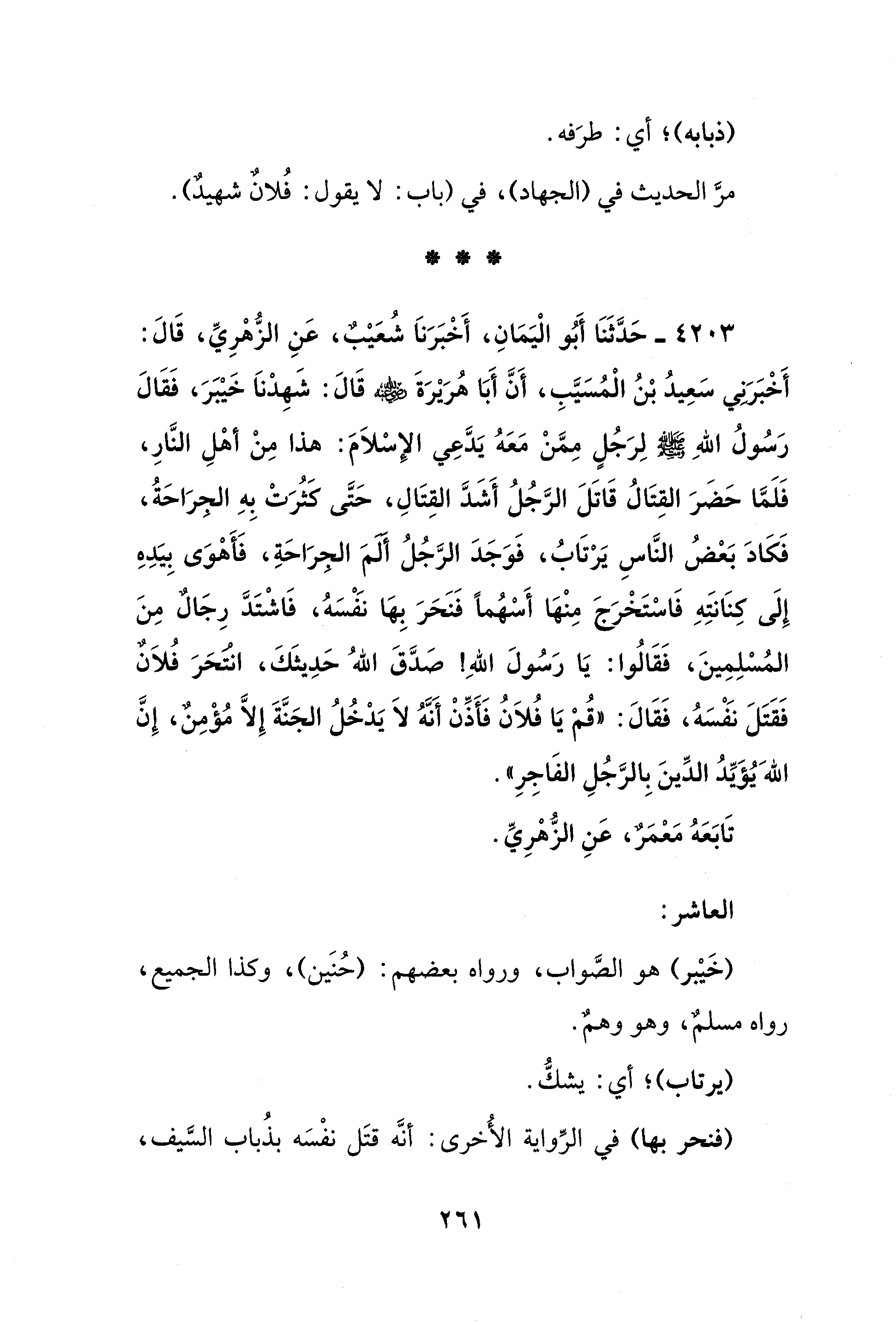 4203 - حَدَّثَنَا أَبُو الْيَمَانِ، أَخْبَرَنَا شُعَيْبٌ، عَنِ الزُّهْرِيِّ، قَالَ: أَخْبَرَنِي سَعِيدُ بْنُ الْمُسَيَّبِ، أَنَّ أَبَا هُرَيْرَةَ - رضي الله عنه - قَالَ: شَهِدْناَ خَيْبَرَ، فَقَالَ رَسُولُ اللهِ - صلى الله عليه وسلم - لِرَجُلٍ مِمَّنْ مَعَهُ يَدَّعِي الإسْلاَمَ: هذا مِنْ أهْلِ النَّارِ، فَلَمَّا حَضَرَ القِتَالُ قَاتَلَ الرَّجُلُ أَشَدَّ القِتَالِ، حَتَّى كَثُرَتْ بِهِ الجِرَاحَةُ، فَكَادَ بَعْضُ النَّاسِ يَرْتَابُ، فَوَجَدَ الرَّجُلُ ألَمَ الجرَاحَةِ، فَأَهْوَى بِيَدِهِ إِلَى كنَانَتِهِ فَاسْتَخْرَجَ مِنْهَا أَسْهُمًا فَنَحَرَ بِهَا نَفْسَهُ، فَاشْتَدَّ رِجَالٌ مِنَ المُسْلِمِينَ، فَقَالُوا: يَا رَسُولَ اللهِ! صَدَّقَ اللهُ حَدِيثَكَ، انْتَحَرَ فُلاَنٌ فَقَتَلَ نَفْسَهُ، فَقَالَ: "قُمْ يَا فُلاَنُ فَأَذِّنْ أَنَّهُ لاَ يَدْخُلُ الجَنَّةَ إِلَّا مُؤْمِنٌ، إِنَّ اللهَ يُؤَيِّدُ الدِّينَ بِالرَّجُلِ الفَاجِرِ".
