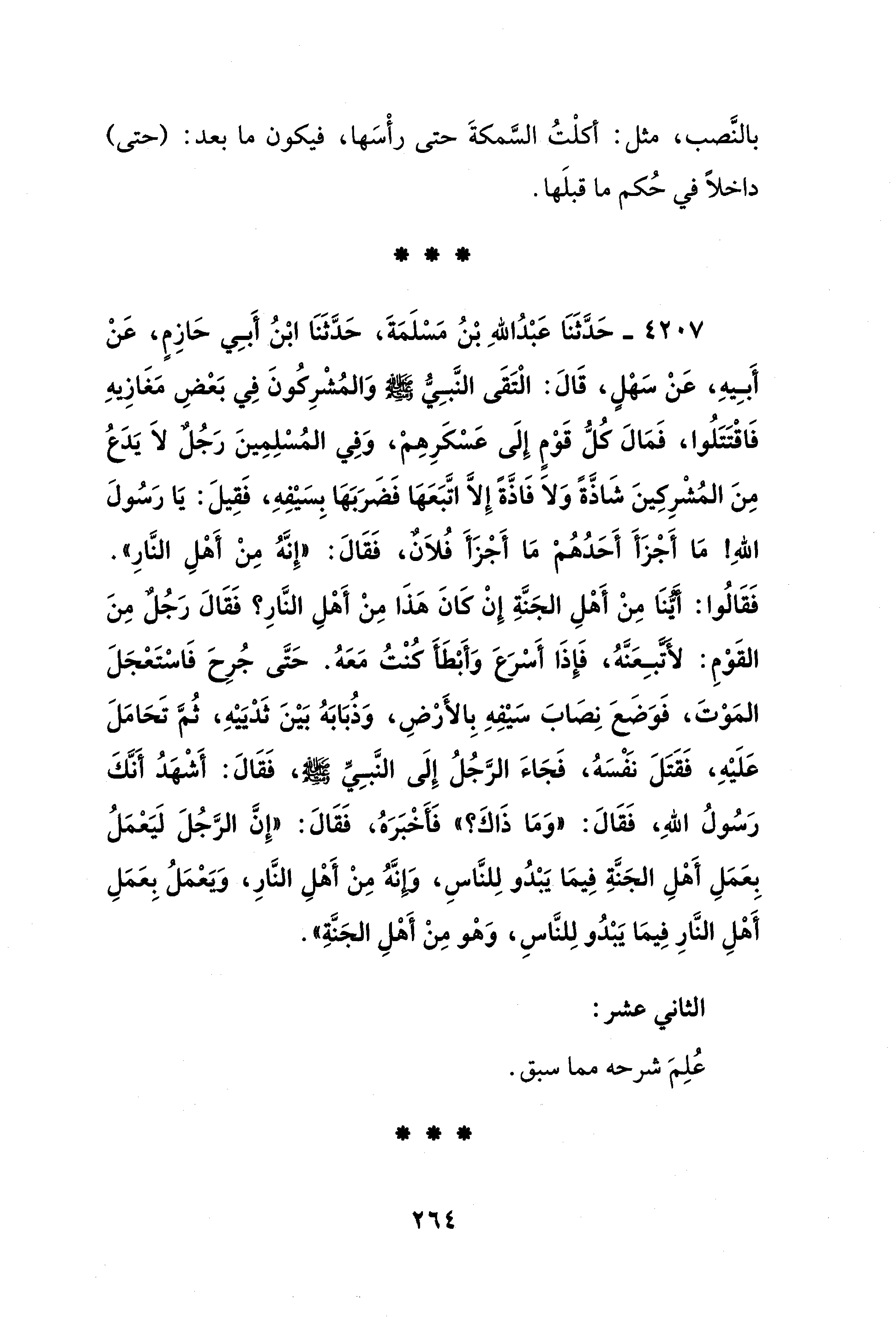 4207 - حَدَّثَنَا عَبْدُ اللهِ بْنُ مَسْلَمَةَ، حَدَّثَنَا ابْنُ أَبِي حَازِمٍ، عَنْ أَبِيهِ، عَنْ سَهْلٍ، قَالَ: الْتَقَى النَّبِيُّ - صلى الله عليه وسلم - وَالمُشْرِكُونَ في بَعْضِ مَغَازِيهِ فَاقْتَتَلُوا، فَمَالَ كُلُّ قَوْمٍ إِلَى عَسْكَرِهِمْ، وَفِي المُسْلِمِينَ رَجُلٌ لاَ يَدَعُ مِنَ المُشْرِكِينَ شَاذَّةً وَلاَ فَاذَّةً إِلَّا اتَّبَعَهَا فَضَرَبَهَا بِسَيْفِهِ، فَقِيلَ: يَا رَسُولَ اللهِ! مَا أَجْزَأَ أَحَدُهُمْ مَا أَجْزَأَ فُلاَنٌ، فَقَالَ: "إِنَّهُ مِنْ أَهْلِ النَّارِ". فَقَالُوا: أَيُّنَا مِنْ أَهْلِ الجَنَّةِ إِنْ كَانَ هَذَا مِنْ أَهْلِ النَّارِ؟ فَقَالَ رَجُلٌ مِنَ القَوْمِ: لأَتَّبِعَنَّهُ، فَإِذَا أَسْرَعَ وَأَبْطَأَ كُنْتُ مَعَهُ. حَتَّى جُرِحَ فَاسْتَعْجَلَ المَوْتَ، فَوَضَعَ نِصَابَ سَيْفِهِ بِالأَرْضِ، وَذُبَابَهُ بَيْنَ ثَدْيَيْهِ، ثُمَّ تَحَامَلَ عَلَيْهِ، فَقَتَلَ نَفْسَهُ، فَجَاءَ الرَّجُلُ إِلَى النَّبِيِّ - صلى الله عليه وسلم -، فَقَالَ: أَشْهَدُ أَنَّكَ رَسُولُ اللهِ، فَقَالَ: "وَمَا ذَاكَ؟ " فَأَخْبَرَهُ، فَقَالَ: "إِنَّ الرَّجُلَ لَيَعْمَلُ بِعَمَلِ أَهْلِ الجَنَّةِ فِيمَا يَبْدُو لِلنَّاسِ، وَإِنَّهُ مِنْ أَهْلِ النَّارِ، وَيَعْمَلُ بِعَمَلِ أَهْلِ النَّارِ فِيمَا يَبْدُو لِلنَّاسِ، وَهْو مِنْ أَهْلِ الجَنَّةِ".
