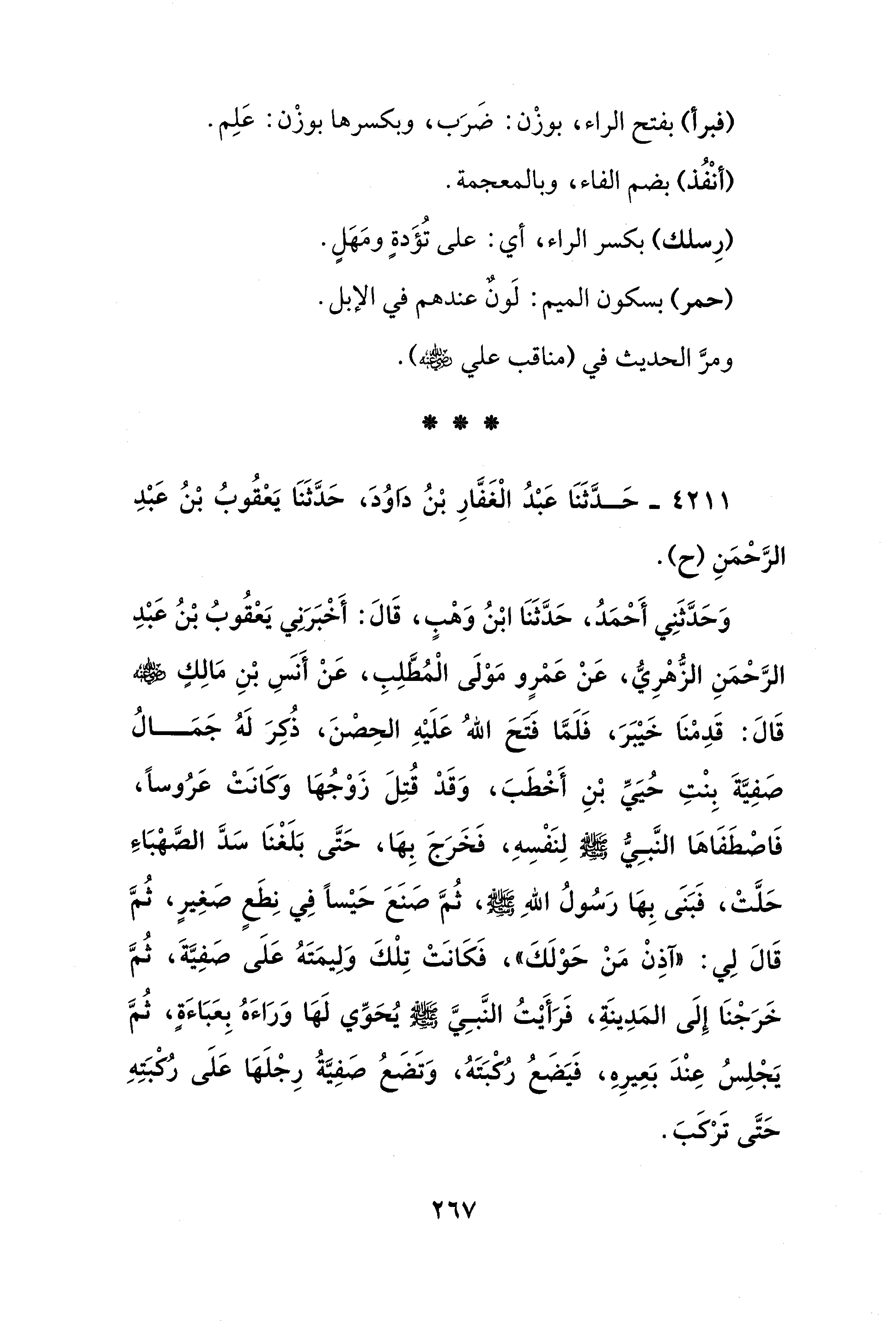 وَحَدَّثَنِي أَحْمَدُ، حَدَّثَنَا ابْنُ وَهْبٍ، قَالَ: أَخْبَرَنِي يَعْقُوبُ بْنُ عَبْدِ الرَّحْمَنِ الزُّهْرِيُّ، عَنْ عَمْرٍو مَوْلَى الْمُطَّلِبِ، عَنْ أَنس بْنِ مَالِكٍ - رضي الله عنه - قَالَ: قَدِمْنَا خَيْبَرَ، فَلَمَّا فَتَحَ اللهُ عَلَيْهِ الحِصْنَ، ذُكِرَ لَهُ جَمَالُ صَفِيَّةَ بِنْتِ حُيَيِّ بْنِ أَخْطَبَ، وَقَدْ قُتِلَ زَوْجُهَا وَكَانَتْ عَرُوسًا، فَاصْطَفَاهَا النَّبِيُّ - صلى الله عليه وسلم - لِنَفْسِهِ، فَخَرَجَ بِهَا، حَتَّى بَلَغْنَا سَدَّ الصَّهْبَاءِ حَلَّتْ، فَبَنَى بِهَا رَسُولُ اللهِ - صلى الله عليه وسلم -، ثُمَّ صَنَعَ حَيْسًا في نِطَعٍ صَغِيرٍ، ثُمَّ قَالَ لِي: "آذِنْ مَنْ حَوْلَكَ"، فَكَانَتْ تِلْكَ وَلِيمَتَهُ عَلَى صَفِيَّةَ، ثُمَّ خَرَجْنَا إِلَى المَدِينَةِ، فَرَأَيْتُ النَّبِيَّ - صلى الله عليه وسلم - يُحَوِّي لَهَا وَرَاءَهُ بِعَبَاءَةٍ، ثُمَّ يَجْلِسُ عِنْدَ بَعِيرِهِ، فَيَضَعُ رُكْبَتَهُ، وَتَضَعُ صَفِيَّةُ رِجْلَهَا عَلَى رُكْبَتِهِ حَتَّى تَرْكبَ.