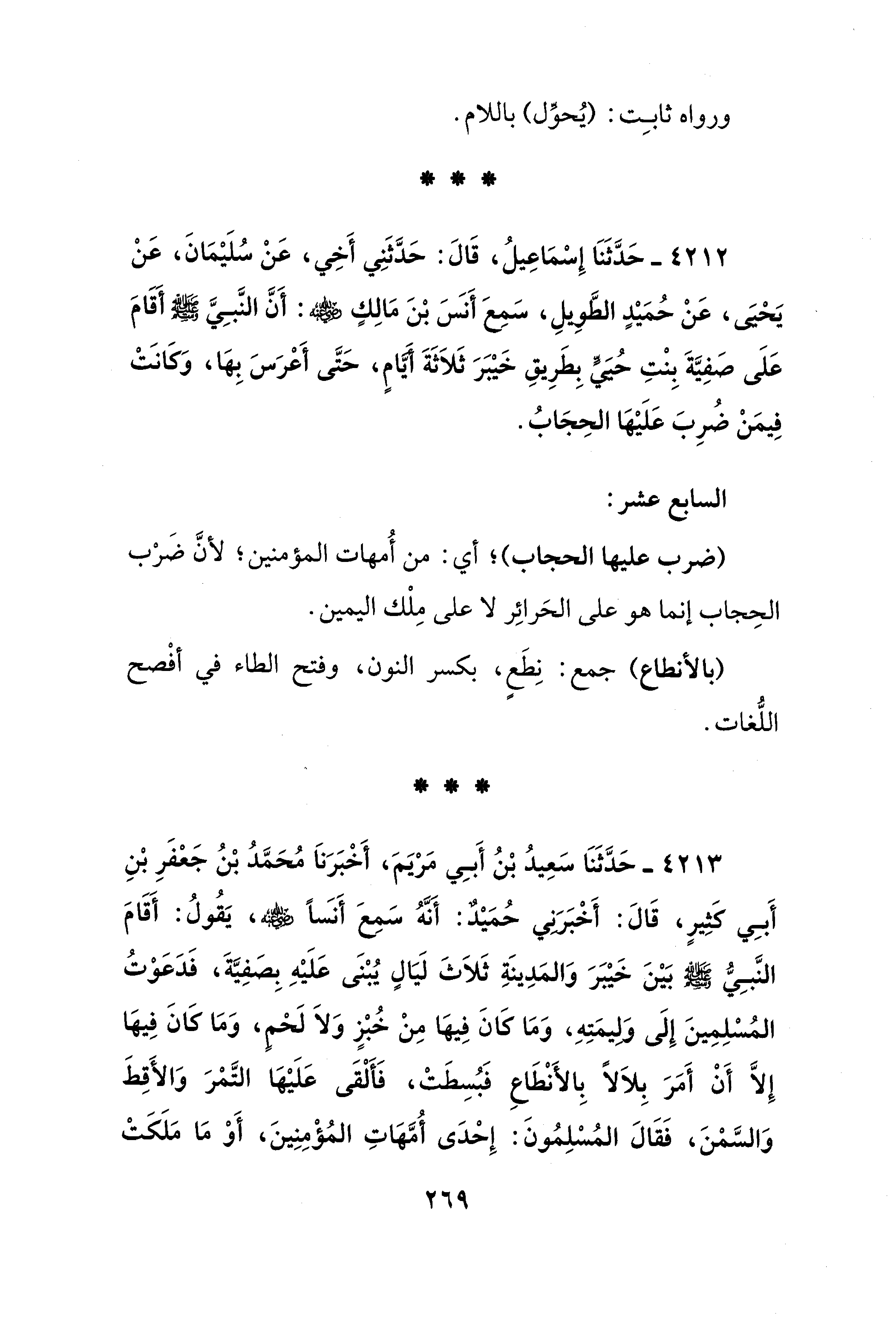 4213 - حَدَّثَنَا سَعِيدُ بْنُ أَبِي مَرْيَمَ، أَخْبَرَنَا مُحَمَّدُ بْنُ جَعْفَرِ بْنِ أَبِي كَثِيرٍ، قَالَ: أَخْبَرَنِي حُمَيْدٌ: أَنَّهُ سَمِعَ أَنَسًا - رضي الله عنه -، يَقُولُ: أَقَامَ النَّبِيُّ - صلى الله عليه وسلم - بَيْنَ خَيْبَرَ وَالمَدِينَةِ ثَلاَثَ لَيَالٍ يُبْنَى عَلَيْهِ بِصَفِيَّةَ، فَدَعَوْتُ المُسْلِمِينَ إِلَى وَلِيمَتِهِ، وَمَا كَانَ فِيهَا مِنْ خُبْزٍ وَلاَ لَحْمٍ، وَمَا كَانَ فِيهَا إِلَّا أَنْ أَمَرَ بِلاَلًا بِالأَنْطَاعِ فَبُسِطَتْ، فَأَلْقَى عَلَيْهَا التَّمْرَ وَالأَقِطَ وَالسَّمْنَ، فَقَالَ المُسْلِمُونَ: إِحْدَى أُمَّهَاتِ المُؤْمِنِينَ، أَوْ مَا مَلَكَتْ