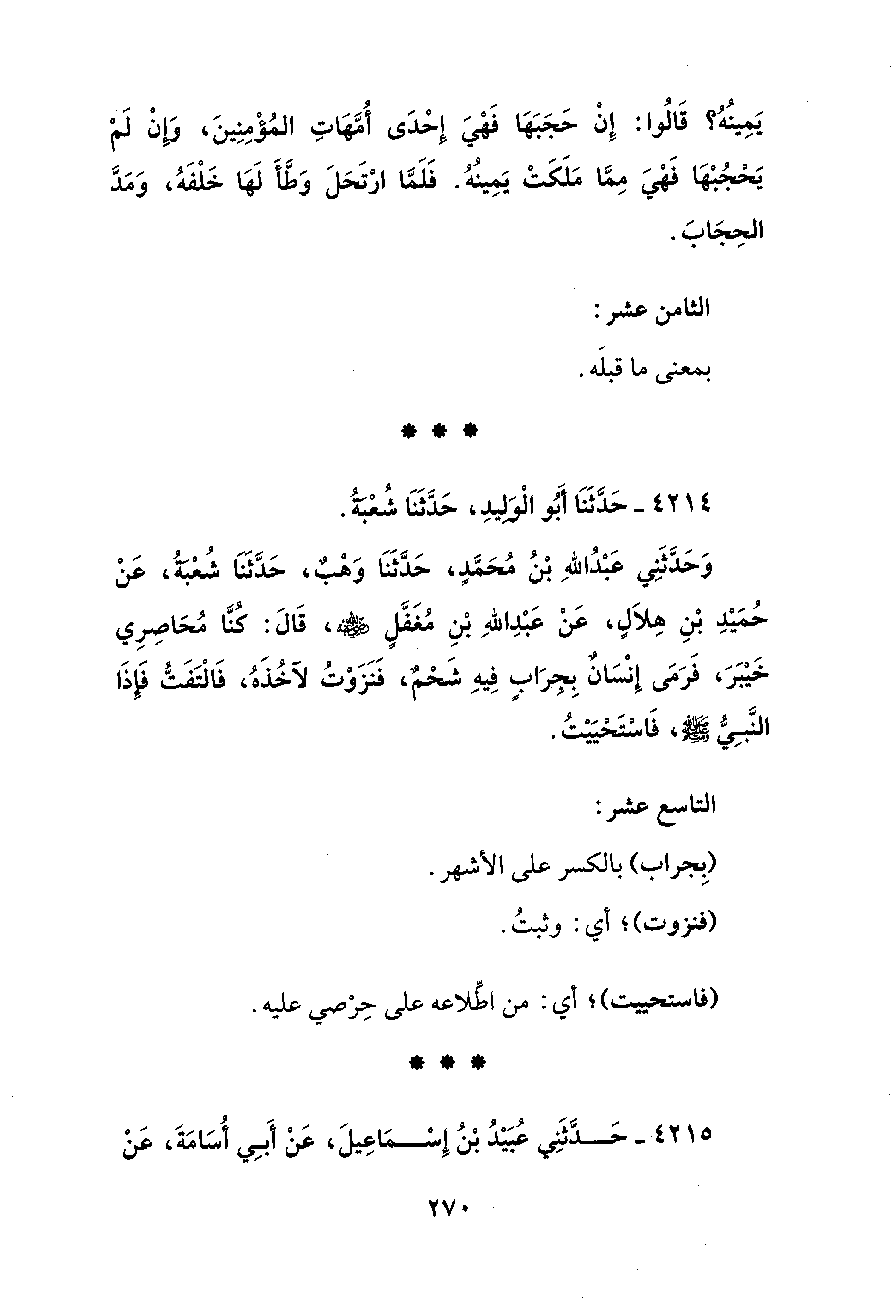 وَحَدَّثَنِي عَبْدُ اللهِ بْنُ مُحَمَّدٍ، حَدَّثَنَا وَهْبٌ، حَدَّثَنَا شُعْبَةُ، عَنْ حُمَيْدِ بْنِ هِلاَلٍ، عَنْ عَبْدِ اللهِ بْنِ مُغَفَّلٍ - رضي الله عنه -، قَالَ: كُنَّا مُحَاصِرِي خَيْبَرَ، فَرَمَى إِنْسَانٌ بِجرَابٍ فِيهِ شَحْمٌ، فَنَزَوْتُ لآخُذَهُ، فَالْتَفَتُّ فَإِذَا النَّبِيُّ - صلى الله عليه وسلم -، فَاسْتَحْيَيْتُ.