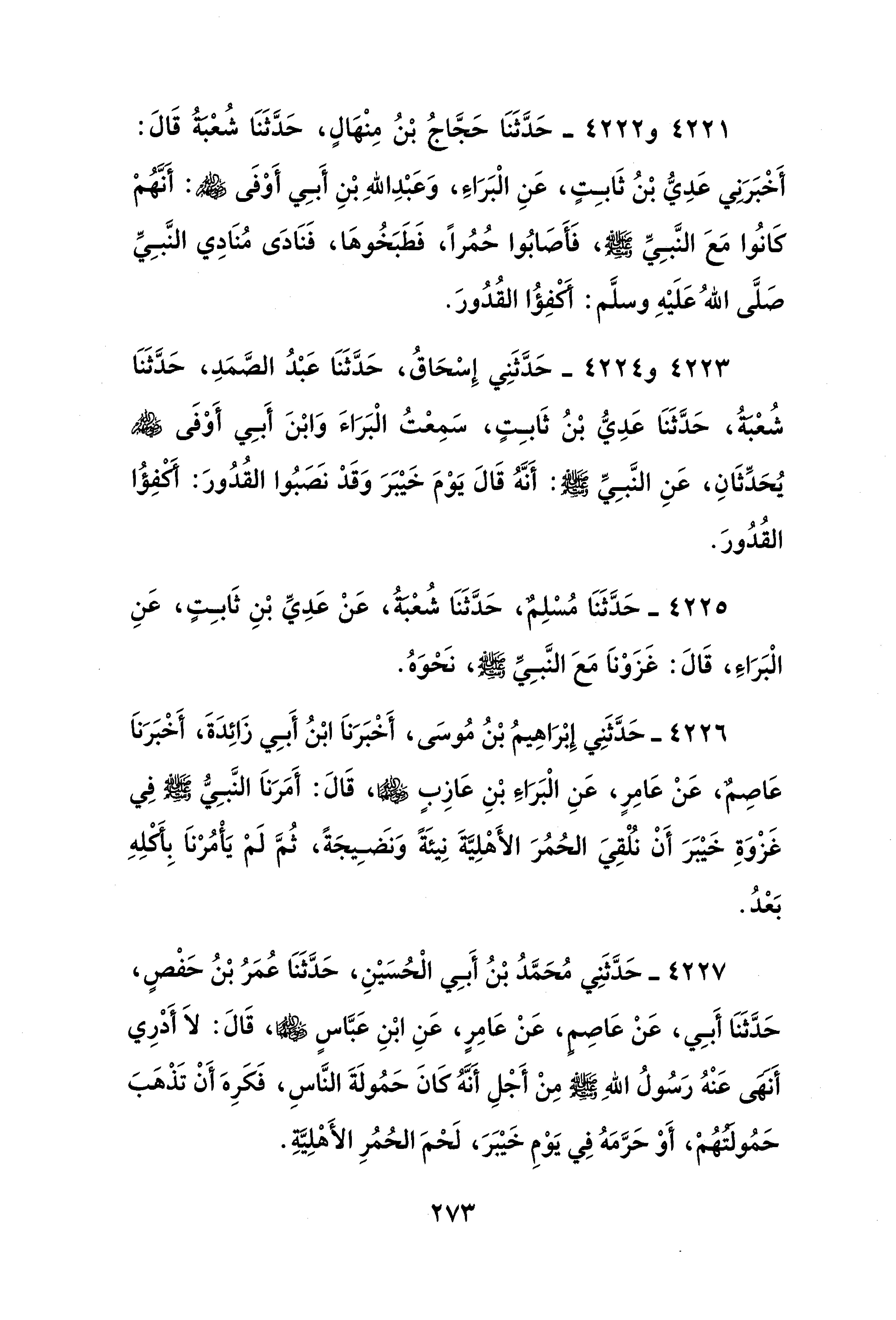 4221 - أو 4222 - حَدَّثَنَا حَجَّاجُ بْنُ مِنْهَالٍ، حَدَّثَنَا شُعْبَةُ قَالَ: أَخْبَرَنَي عَدِيُّ بْنُ ثَابِتٍ، عَنِ الْبَرَاءِ، وَعَبْدِ اللهِ بْنِ أَبِي أَوْفَى - رضي الله عنه -: أَنَّهُمْ كَانُوا مَعَ النَّبِيِّ - صلى الله عليه وسلم -، فَأَصَابُوا حُمُرًا، فَطَبَخُوهَا، فَنَادَى مُنَادِي النَّبِيِّ صَلَّى اللهُ عَلَيْهِ وسلَّم: أَكْفِؤُا القُدُورَ.