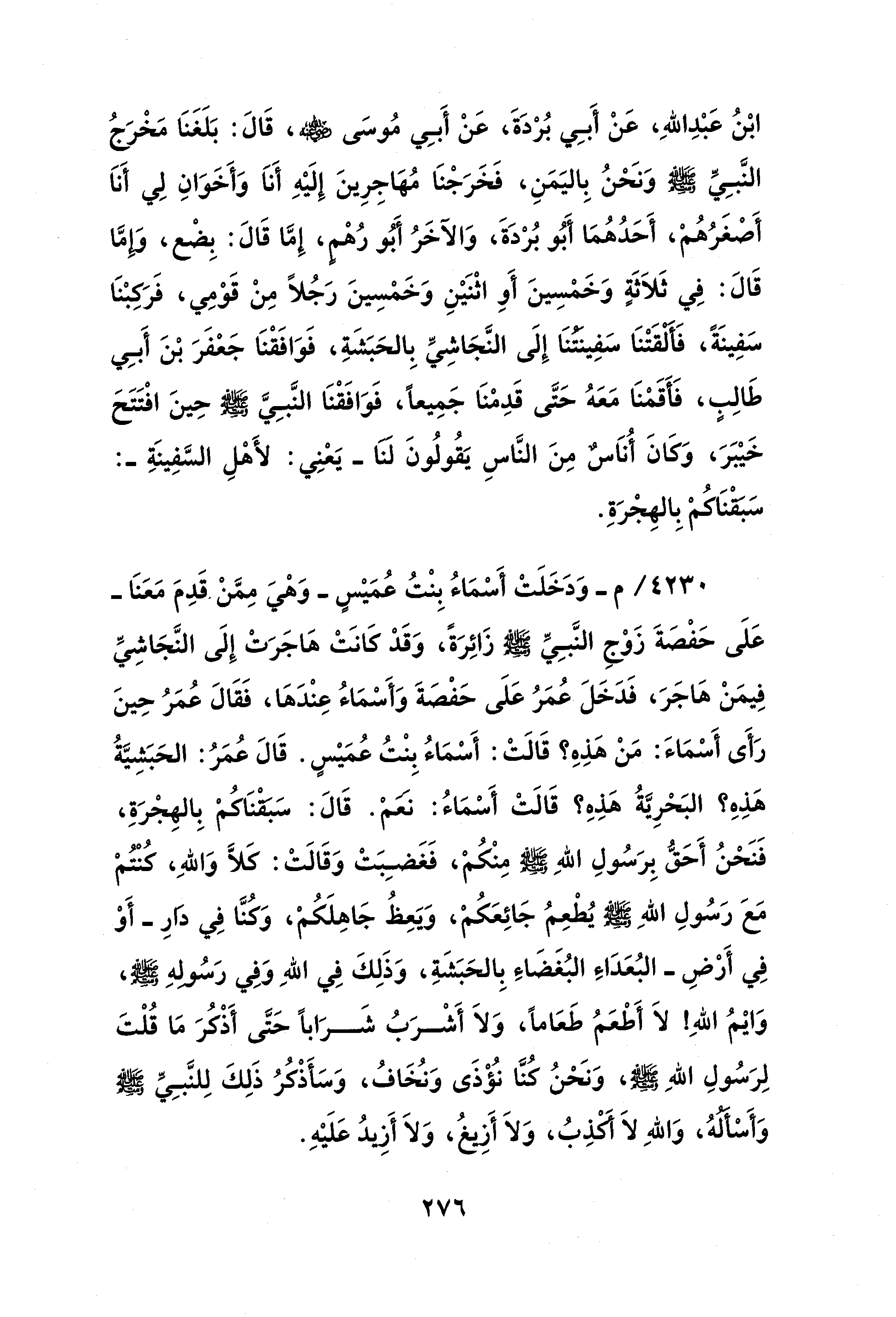 4230 / -م - وَدَخَلَتْ أَسْمَاءُ بِنْتُ عُمَيْسٍ -وَهْيَ مِمَّنْ قَدِمَ مَعَنَا- عَلَى حَفْصَةَ زَوْجِ النَّبِيِّ - صلى الله عليه وسلم - زَائِرَةً، وَقَدْ كَانَتْ هَاجَرَتْ إِلَى النَّجَاشِيِّ فِيمَنْ هَاجَرَ، فَدَخَلَ عُمَرُ عَلَى حَفْصَةَ وَأَسْمَاءُ عِنْدَهَا، فَقَالَ عُمَرُ حِينَ رَأَى أَسْمَاءَ: مَنْ هَذِهِ؟ قَالَتْ: أَسْمَاءُ بِنْتُ عُمَيْسٍ. قَالَ عُمَرُ: الحَبَشِيَّةُ هَذِهِ؟ البَحْرِيَّةُ هَذِهِ؟ قَالَتْ أَسْمَاءُ: نَعَمْ. قَالَ: سَبَقْنَاكُمْ بِالهِجْرَةِ، فَنَحْنُ أَحَقُّ بِرَسُولِ اللهِ - صلى الله عليه وسلم - مِنْكُمْ، فَغَضِبَتْ وَقَالَتْ: كَلَّا وَاللهِ، كُنْتُمْ مَعَ رَسُولِ اللهِ - صلى الله عليه وسلم - يُطْعِمُ جَائِعَكُمْ، وَيَعِظُ جَاهِلَكُمْ، وَكُنَّا في دَارِ -أَوْ في أَرْضِ- البُعَدَاءِ البُغَضَاءِ بِالحَبَشَةِ، وَذَلِكَ فِي اللهِ وَفِي رَسُولِهِ - صلى الله عليه وسلم -، وَايْمُ اللهِ! لاَ أَطْعَمُ طَعَامًا، وَلاَ أَشْرَبُ شَرَابًا حَتَّى أَذْكُرَ مَا قُلْتَ لِرَسُولِ اللهِ - صلى الله عليه وسلم -، وَنَحْنُ كُنَّا نُؤْذَى وَنُخَافُ، وَسَأَذْكُرُ ذَلِكَ لِلنَّبِيِّ - صلى الله عليه وسلم - وَأَسْأَلُهُ، وَاللهِ لاَ أَكْذِبُ، وَلاَ أَزِيغُ، وَلاَ أَزِيدُ عَلَيْهِ.